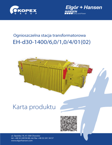 Ognioszczelna stacja transformatorowa EH-d30-1400/6,0/1,0/4/01(02) Karta produktu ul. Opolska 19, 41-500 Chorzów tel. +48 32 249 94 80, tel./fax +48 32 241 34 57 www.elgorhansen.com CECHY CHARAKTERYSTYCZNE Stacja transformatorowa typu EH-d30-1400/6,0/1,0/4/01 (EH-d30-1400/6,0/1,0/4/02) jest elektrycznym urządzeniem zasilającym w wykonaniu przeciwwybuchowym i może być instalowana w podziemnych wyrobiskach górniczych kopalń niemetanowych i zgodnie z polskimi przepisami wykonawczymi Prawa Geologicznego i Górniczego metanowych ze stopniem zagrożenia metanowego „a”, „b”, „c” oraz w wyrobiskach klasy „A” i „B” zagrożenia wybuchem pyłu węglowego. Konstrukcja opracowana została zgodnie z wymaganiami dyrektywy 94/9/WE (ATEX). Certyfikat zgodności predestynuje stosowanie stacji w pomieszczeniach z atmosferą wybuchową grupy I kategorii M2. Zastosowane zabezpieczenia elektroenergetyczne oraz przyjęty system sterowania i współpracy z blokadami technologicznymi z wykorzystaniem obwodów iskrobezpiecznych, pozwalają na bezpieczną współpracę z urządzeniami zasilającymi maszyny górnicze. Stacja transformatorowa przystosowana jest do podłączenia układu transmisji danych umożliwiającego odczyt informacji technologicznych i ich przesył na powierzchnię kopalni (np. do dyspozytora). Układ transmisji danych umożliwia między innymi przesył informacji na temat wartości prądów i napięć odpływów oraz informacji o stanach zakłóceniowych. Ognioszczelna stacja transformatorowa wyposażona jest tawkże w wewnętrzny układ transmisji danych, za pomocą którego informacje o aktualnym stanie pracy podzespołów stacji transformatorowej, są przesyłane magistralą cyfrową oraz wizualizowane na jego wyświetlaczu. Na wyświetlaczu można obserwować parametry pracy stacji transformatorowej, stan zabezpieczeń i przekaźników oraz wartości mierzonych wielkości elektrycznych. BUDOWA Stacja transformatorowa składa się z trzech zasadniczych segmentów budowy ognioszczelnej: • g órnego napięcia, z trzema komorami ognioszczelnymi wyposażonymi w odłącznik izolacyjny; zabezpieczenie nadmiarowoprądowe oraz łącznik główny i przyłączowy • t ransformatora, w której umieszczono transformator suchy, • d olnego napięcia z dwoma komorami ognioszczelnymi wyposażonymi w uziemnik szybki, obwody kontroli i sterowania, zabezpieczenia upływowe oraz nadmiarowo-prądowe oraz przyłączowe Segmenty są bezpośrednio ze sobą połączone przy pomocy ognioszczelnych złączy kołnierzowych, a ich współpraca zapewnia prawidłowe działanie w układzie stacji transformatorowej. Budowa segmentowa stacji z podziałem na komory i przedziały ognioszczelne połączone z sobą zapewnia: • s eparację ogólnokopalnianej sieci rozdzielczej z instalacjami oddziałowymi, • z asilanie odbiorników w kopalnianych instalacjach oddziałowych, • o chronę od skutków zwarć i przeciążeń po stronie górnego i dolnego napięcia, • o chronę od skutków pracy przy obniżonym stanie izolacji po stronie dolnego napięcia. Stacja transformatorowa może być instalowana w pomieszczeniach przewietrzanych prądem powietrza odprowadzanego do szybu wydechowego lub w pomieszczeniach z wentylacją odrębną. Stacja jest przystosowana do transportu kołowego (po szynach) lub z wykorzystaniem kolejki podwieszanej. Do podwieszania na kolejce służą uchwyty transportowe stacji wyróżnione kolorem czerwonym oraz specjalne strzemiona, które nie są standardowym wyposażeniem stacji. OPIS DZIAŁANIA Stacja transformatorowa wyposażona jest w cztery odpływy po stronie DN, które zapewniają zasilanie odbiorników napięciem 1000V. Każdy z odpływów wyposażony jest w zabezpieczenie nadmiarowoprądowe, chroniące od skutków zwarcia, przeciążeniav i asymetrii obciążeń. Ochrona od skutków pracy przy obniżonej i/lub uszkodzonej izolacji zasilanej instalacji realizowana przez zabezpieczenia upływowe - blokujące i centralne. Łącznik po stronie GN, na który działają wszystkie zabezpieczenia stacji, załącza transformator główny. Odłącznik izolacyjny po stronie GN pozwala na uzyskanie widocznej bezpiecznej przerwy izolacyjnej. W takim położeniu odłącznika, dzięki zastosowaniu blokady, istnieje możliwość otwarcia przedziałów aparaturowych w stanie beznapięciowym. www.elgorhansen.com Ognioszczelna stacja transformatorowa EH-d30-1400/6,0/1,0/4/01(02) DANE TECHNICZNE Moc znamionowa 1400kVA Napięcie znamionowe: pierwotne 6000V wtórne 1050V Zakres regulacji przekładni (w stanie beznapięciowym) ± 5% Prąd znamionowy: pierwotny 134,7A wtórny 769,8A Grupa połączeń Dyn5 (Yyn0) Napięcie zwarcia 4,0% Straty biegu jałowego 3200W Straty obciążeniowe 7200W Częstotliwość znamionowa 50Hz Chłodzenie AN Zwarciowa zdolność łączenia (6kV) 10 kA, cosφ=0,2 Klasa izolacji transformatora H Maksymalna temperatura otoczenia + 40° C Ilość odpływów 4 stopień ochrony IP54 Prąd ciągły pojedynczego odpływu ≤400A Masa bez zestawu kołowego ~8300kg z zestawem kołowym ~8800kg Prześwit zestawu kołowego 130 mm ul. Opolska 19, 41-500 Chorzów tel. +48 32 249 94 80, tel./fax +48 32 241 34 57 www.elgorhansen.com Ognioszczelna stacja transformatorowa EH-d30-1400/6,0/1,0/4/01(02) SCHEMAT URZĄDZENIA Q11 – odłącznik izolacyjny F24.1 – centralne zabezpieczenie upływowe F12 – wkładka bezpiecznikowa Q21 – uziemnik szybki T12 – transformator potrzeb własnych K22 – łącznik pomocniczy K11 – łącznik strony GN F24.2 – przekaźnik upływowo blokujący F11 – wtórny przkekaźnik nadmiarowopradowy F23.1, F23.2, F23.3, F23.4 – przekaźnik nadmiarowoprądowy T – transformator suchy RYSUNEK WYMIAROWY CECHA BUDOWY PRZECIWWYBUCHOWEJ I M2 Ex d I 1453 Certyfikat badania typu KDB 09ATEX143X ZNAK DOPUSZCZENIA GX-121/09 ul. Grabowa 1, 40-172 Katowice tel. +48 32 604 70 00, tel./fax +48 32 604 71 00 www.kopex.com.pl