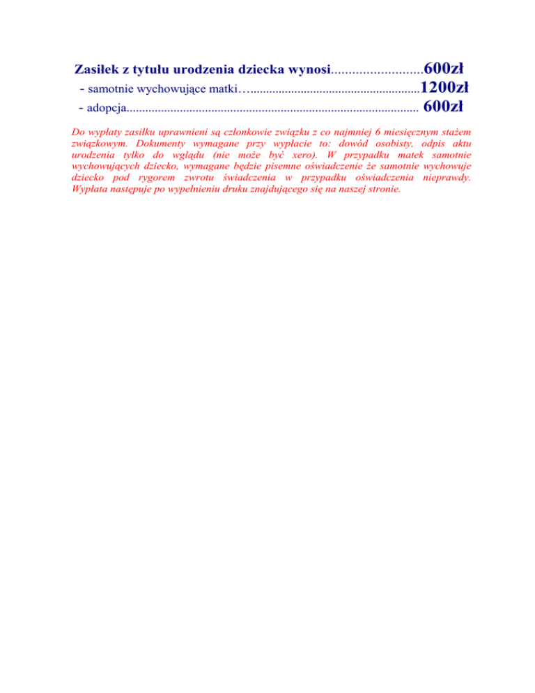 Zasiłek z tytułu urodzenia dziecka wynosi..........................600zł - samotnie wychowujące matki…......................................................1200zł - adopcja............................................................................................. 600zł Do wypłaty zasiłku uprawnieni są członkowie związku z co najmniej 6 miesięcznym staŜem związkowym. Dokumenty wymagane przy wypłacie to: dowód osobisty, odpis aktu urodzenia tylko do wglądu (nie moŜe być xero). W przypadku matek samotnie wychowujących dziecko, wymagane będzie pisemne oświadczenie Ŝe samotnie wychowuje dziecko pod rygorem zwrotu świadczenia w przypadku oświadczenia nieprawdy. Wypłata następuje po wypełnieniu druku znajdującego się na naszej stronie.