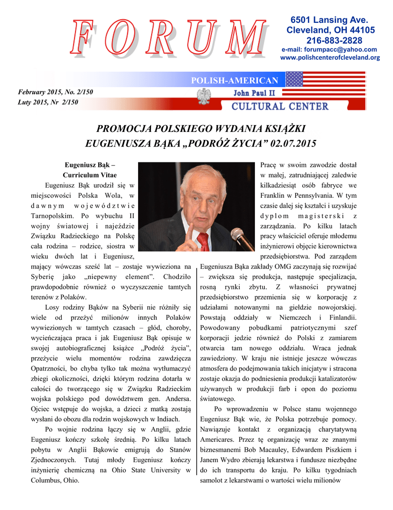 6501 Lansing Ave. Cleveland, OH 44105 216-883-2828 e-mail: [email protected] www.polishcenterofcleveland.org POLISH-AMERICAN February 2015, No. 2/150 Luty 2015, Nr 2/150 PROMOCJA POLSKIEGO WYDANIA KSIĄŻKI EUGENIUSZA BĄKA „PODRÓŻ ŻYCIA” 02.07.2015 Eugeniusz Bąk – Curriculum Vitae Eugeniusz Bąk urodził się w miejscowości Polska Wola, w dawnym województwie Tarnopolskim. Po wybuchu II wojny światowej i najeździe Związku Radzieckiego na Polskę cała rodzina – rodzice, siostra w wieku dwóch lat i Eugeniusz, mający wówczas sześć lat – zostaje wywieziona na Syberię jako „niepewny element”. Chodziło prawdopodobnie również o wyczyszczenie tamtych terenów z Polaków. Losy rodziny Bąków na Syberii nie różniły się wiele od przeżyć milionów innych Polaków wywiezionych w tamtych czasach – głód, choroby, wycieńczająca praca i jak Eugeniusz Bąk opisuje w swojej autobiograficznej książce „Podróż życia”, przeżycie wielu momentów rodzina zawdzięcza Opatrzności, bo chyba tylko tak można wytłumaczyć zbiegi okoliczności, dzięki którym rodzina dotarła w całości do tworzącego się w Związku Radzieckim wojska polskiego pod dowództwem gen. Andersa. Ojciec wstępuje do wojska, a dzieci z matką zostają wysłani do obozu dla rodzin wojskowych w Indiach. Po wojnie rodzina łączy się w Anglii, gdzie Eugeniusz kończy szkołę średnią. Po kilku latach pobytu w Anglii Bąkowie emigrują do Stanów Zjednoczonych. Tutaj młody Eugeniusz kończy inżynierię chemiczną na Ohio State University w Columbus, Ohio. Pracę w swoim zawodzie dostał w małej, zatrudniającej zaledwie kilkadziesiąt osób fabryce we Franklin w Pennsylvania. W tym czasie dalej się kształci i uzyskuje dyplom magisterski z zarządzania. Po kilku latach pracy właściciel oferuje młodemu inżynierowi objęcie kierownictwa przedsiębiorstwa. Pod zarządem Eugeniusza Bąka zakłady OMG zaczynają się rozwijać – zwiększa się produkcja, następuje specjalizacja, rosną rynki zbytu. Z własności prywatnej przedsiębiorstwo przemienia się w korporację z udziałami notowanymi na giełdzie nowojorskiej. Powstają oddziały w Niemczech i Finlandii. Powodowany pobudkami patriotycznymi szef korporacji jedzie również do Polski z zamiarem otwarcia tam nowego oddziału. Wraca jednak zawiedziony. W kraju nie istnieje jeszcze wówczas atmosfera do podejmowania takich inicjatyw i stracona zostaje okazja do podniesienia produkcji katalizatorów używanych w produkcji farb i opon do poziomu światowego. Po wprowadzeniu w Polsce stanu wojennego Eugeniusz Bąk wie, że Polska potrzebuje pomocy. Nawiązuje kontakt z organizacją charytatywną Americares. Przez tę organizację wraz ze znanymi biznesmanemi Bob Macauley, Edwardem Piszkiem i Janem Wydro zbierają lekarstwa i fundusze niezbędne do ich transportu do kraju. Po kilku tygodniach samolot z lekarstwami o wartości wielu milionów Forum - February 2015 - dolarów ląduje na lotnisku w Warszawie. Grupa z organizacji Americares, w której skład wchodzi Eugeniusz Bąk, osobiście eskortuje transport do Polski i czuwa nad prawidłową dystrybucją leków. Pod koniec lat dziewięćdziesiątych Eugeniusz Bąk przechodzi na emeryturę. Zdaje sobie sprawę, że jego energia i olbrzymie doświadczenie mogą być wykorzystane w pracy społecznej. Nawiązuje kontakt z grupą Polaków i osób pochodzenia polskiego, które widzą potrzebę krzewienia kultury polskiej w tym kraju. Wiedzą oni, że poprzez propagowanie kultury i osiągnięć można kształtować wyobrażenia o Polsce, jako nowoczesnym kraju z bogatą kulturą i historią, a tym samym wpływać na wizerunek Polaków w tym kraju. W oparciu o te założenia powstaje idea stworzenia Polsko-Amerykańskiego Centrum Kultury w Cleveland i w tym właśnie momencie zaczyna się tytaniczna praca Eugeniusza Bąka. Przy niedowierzaniu i wątpieniu wielu osób, krok po kroku zamysł powstania Centrum nabiera coraz bardziej realnych kształtów. Eugeniusz Bąk skupia wokół tej idei coraz więcej ludzi. Są wśród nich tacy, którzy odczuwają potrzebę pracy społecznej dla wspólnego dobra, ale są również ludzie biznesu, nauki i kultury. Są Polacy, którzy niedawno przyjechali z kraju, zasiedzieli „Polonusy”, ale również i tacy, którzy swoje korzenie polskie zaledwie pamiętają. Na pierwszym zebraniu konstytucyjnym PolskoAmerykańskiego Centrum Kultury nikt nie ma wątpliwości, że prezesem może być tylko Eugeniusz Bąk. Nowy prezes wykorzystuje swój potencjał w pełni – organizuje fundusze na kupno siedziby Centrum, a podczas remontu zdarza się, że sam sprząta i wynosi śmieci. Zbiera pieniądze na renowację budynku, nowy sprzęt, organizuje imprezy dochodowe i kulturalne. Centrum staje się siedzibą Opera Circle, profesjonalnego zespołu operowego. Zaczyna być wydawany miesięcznik o charakterze kulturalnym. W Centrum znajdują również siedzibę dwie szkoły polskie dla dzieci, szkoła języka Page 2 polskiego dla dorosłych i języka angielskiego dla Polaków. Powstaje Klub Dyskusyjny skupiający inteligencję polską, organizowane są seminaria na tematy kulturalne. W każdą niedzielę sala Centrum zamienia się w popularne miejsce spotkań Polonii, gdzie można przy lunchu spotkać znajomych. Bardzo szybko też Centrum staje się miejscem występów artystów z Polski, teatrów i koncertów muzyki polskiej. Gościliśmy prezydenta Lecha Wałęsę, który przy wypełnionej po brzegi sali wygłosił odczyt na temat miejsca Polski we współczesnym świecie, a w roku 2010 mieliśmy honor gościć prezydenta Rzeczypospolitej Polskiej Bronisława Komorowskiego. Był naszym gościem również kompozytor Krzysztof Penderecki, który przyjechał do Cleveland z okazji przyznania mu doktoratu Honoris Causa przez jeden z najbardziej prestiżowych miejscowych uniwersytetów. Centrum pulsuje życiem polskim i promieniuje kulturą polską na całe Clevelan