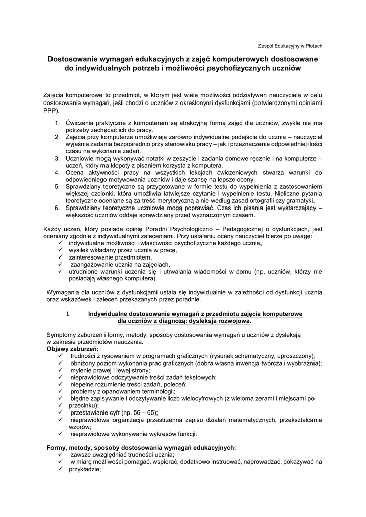 Zespół Edukacyjny w Płotach Dostosowanie wymagań edukacyjnych z zajęć komputerowych dostosowane do indywidualnych potrzeb i możliwości psychofizycznych uczniów Zajęcia komputerowe to przedmiot, w którym jest wiele możliwości oddziaływań nauczyciela w celu dostosowania wymagań, jeśli chodzi o uczniów z określonymi dysfunkcjami (potwierdzonymi opiniami PPP). 1. Ćwiczenia praktyczne z komputerem są atrakcyjną formą zajęć dla uczniów, zwykle nie ma potrzeby zachęcać ich do pracy. 2. Zajęcia przy komputerze umożliwiają zarówno indywidualne podejście do ucznia – nauczyciel wyjaśnia zadania bezpośrednio przy stanowisku pracy – jak i przeznaczenie odpowiedniej ilości czasu na wykonanie zadań. 3. Uczniowie mogą wykonywać notatki w zeszycie i zadania domowe ręcznie i na komputerze – uczeń, który ma kłopoty z pisaniem korzysta z komputera. 4. Ocena aktywności pracy na wszystkich lekcjach ćwiczeniowych stwarza warunki do odpowiedniego motywowania uczniów i daje szansę na lepsze oceny. 5. Sprawdziany teoretyczne są przygotowane w formie testu do wypełnienia z zastosowaniem większej czcionki, która umożliwia łatwiejsze czytanie i wypełnienie testu. Nieliczne pytania teoretyczne oceniane są za treść merytoryczną a nie według zasad ortografii czy gramatyki. 6. Sprawdziany teoretyczne uczniowie mogą poprawiać. Czas ich pisania jest wystarczający – większość uczniów oddaje sprawdziany przed wyznaczonym czasem. Każdy uczeń, który posiada opinię Poradni Psychologiczno – Pedagogicznej o dysfunkcjach, jest oceniany zgodnie z indywidualnymi zaleceniami. Przy ustalaniu oceny nauczyciel bierze po uwagę: indywidualne możliwości i właściwości psychofizyczne każdego ucznia, wysiłek wkładany przez ucznia w pracę, zainteresowanie przedmiotem, zaangażowanie ucznia na zajęciach, utrudnione warunki uczenia się i utrwalania wiadomości w domu (np. uczniów, którzy nie posiadają własnego komputera). Wymagania dla uczniów z dysfunkcjami ustala się indywidualnie w zależności od dysfunkcji ucznia oraz wskazówek i zaleceń przekazanych przez poradnie. I. Indywidualne dostosowanie wymagań z przedmiotu zajęcia komputerowe dla uczniów z diagnozą: dysleksja rozwojowa. Symptomy zaburzeń i formy, metody, sposoby dostosowania wymagań u uczniów z dysleksją w zakresie przedmiotów nauczania. Objawy zaburzeń: trudności z rysowaniem w programach graficznych (rysunek schematyczny, uproszczony); obniżony poziom wykonania prac graficznych (dobra własna inwencja twórcza i wyobraźnia); mylenie prawej i lewej strony; nieprawidłowe odczytywanie treści zadań tekstowych; niepełne rozumienie treści zadań, poleceń; problemy z opanowaniem terminologii; błędne zapisywanie i odczytywanie liczb wielocyfrowych (z wieloma zerami i miejscami po przecinku); przestawianie cyfr (np. 56 – 65); nieprawidłowa organizacja przestrzenna zapisu działań matematycznych, przekształcania wzorów; nieprawidłowe wykonywanie wykresów funkcji. Formy, metody, sposoby dostosowania wymagań edukacyjnych: zawsze uwzględniać trudności ucznia; w miarę możliwości pomagać, wspierać, dodatkowo instruować, naprowadzać, pokazywać na przykładzie; dzielić dane zadanie na etapy i zachęcać do wykonywania malutkimi krokami; nie zmuszać na siłę do wykonywania zadań sprawiających uczniowi trudność; dawać więcej czasu na opanowanie danej umiejętności, cierpliwie udzielać instruktażu, nie krytykować, nie oceniać negatywnie wobec klasy; podczas oceniania brać przede wszystkim pod uwagę stosunek ucznia do przedmiotu, jego chęci, wysiłek, przygotowanie do zajęć w materiały, niezbędne pomoce itp.; włączać do rywalizacji tylko tam, gdzie uczeń ma szanse; nie wyrywać do natychmiastowej odpowiedzi, przygotować wcześniej zapowiedzią, że uczeń będzie pytany; w trakcie rozwiązywania zadań sprawdzać, czy uczeń przeczytał treść zadania i czy prawidłowo ją zrozumiał, w razie potrzeby udzielać dodatkowych wskazówek; w czasie kartkówek i sprawdzianów zwiększyć ilość czasu na rozwiązanie zadań; można też dać uczniowi do rozwiązania w domu podobne zadania; materiał sprawiający trudność dłużej utrwalać, dzielić na mniejsze porcje. II. Indywidualne dostosowanie wymagań z przedmiotu zajęcia komputerowe dla uczniów z diagnozą: dysgrafia. Symptomy zaburzeń i formy, metody, sposoby dostosowania wymagań u uczniów z dysgrafią w zakresie przedmiotów nauczania. Objawy zaburzeń: trudności w opanowaniu kształtnego, czytelnego pisma o zadowalającym poziomie graficznym. Formy, metody, sposoby dostosowania wymagań edukacyjnych: jeśli nauczyciel nie może przeczytać pracy ucznia, może go poprosić, aby uczynił to sam lub przepytać ustnie z tego zakresu materiału; dać uczniowi możliwość pisania drukowanymi literami lub na komputerze; strona graficzna pisma nie wpływa na uzyskiwaną przez ucznia ocenę. Indywidualne dostosowanie wymagań z przedmiotu zajęcia komputerowe dla uczniów z diagnozą: dysortografia. III. Symptomy zaburzeń i formy, metody, sposoby dostosowania wymagań u uczniów z dysortografią w zakresie przedmiotów nauczania. Objawy zaburzeń: trudności w opanowaniu poprawnej pisowni, zgodnej z regułami ortograficznymi danego języka. Formy, metody, sposoby dostosowania wymagań edukacyjnych: oceniając prace pisemne, brać pod uwagę ich treść, kompozycję, stronę stylistyczno – językową. Indywidualne dostosowanie wymagań z przedmiotu zajęcia komputerowe dla uczniów z diagnozą :obniżony intelekt. Symptomy trudności: trudności z wykonywaniem bardziej złożonych działań; trudność z pamięciowym przyswajaniem i/lub odtwarzaniem z pamięci wyuczonych treści(np. tabliczka mnożenia, skomplikowane wzory, układy równań); problem z rozumieniem treści zadań; potrzeba większej ilości czasu na zrozumienie i wykonanie zadania. Sposoby dostosowania wymagań e