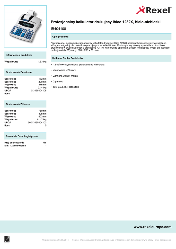 Profesjonalny kalkulator drukujacy Ibico 1232X, bialo-niebieski IB404108 Opis produktu Nowoczesny, elegancki i ergonomiczny kalkulator drukujacy Ibico 1232X posiada fluorescencyjny wyswietlacz, który jest wygodny dla osób duzo pracujacych na kalkulatorze. 12-sto cyfrowy zielony wyswietlacz i mozliwosc drukowania w dwóch kolorach z predkoscia 4,1 linii na sekunde sprawiaja, ze jest to najlepszy wybór dla kazdego profesjonalisty. Wymiary: 300 x 230 x 75 mm. Informacje o produkcie Unikalne Cechy Produktów Waga brutto 1.539kg • 12 cyfrowy wyswietlacz, profesjonalna klawiatura • drukowanie - 2 kolory Opakowanie Detaliczne • Zamiana waluty, marza Szerokosc Szerokosc Wysokosc Waga brutto UPC# Ilosc 152mm 290mm 375mm 2.144kg 013465404108 1 • 2 pamieci • Kod produktu: IB404108 Opakowanie Zbiorcze Szerokosc Szerokosc Wysokosc Waga brutto UPC# Ilosc 780mm 305mm 403mm 11.475kg 50013465404103 5 Pozostale Dane Logistyczne Kraj pochodzenia Min. il. zamówienia MY 1 www.rexeleurope.com Wyprodukowano 05/05/2014 Poufne. Wlasnosc Acco Brands. Zdjecia sluza wylacznie celom demonstracyjnym. Bledy i braki zastrzezone.