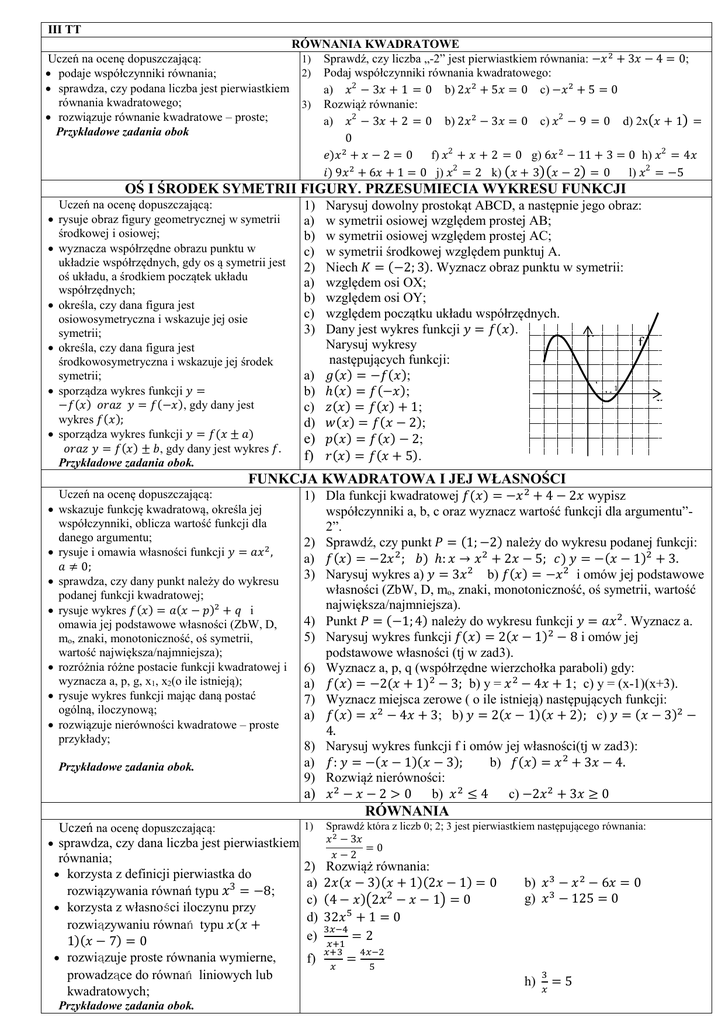 III TT Uczeń na ocenę dopuszczającą: podaje współczynniki równania; sprawdza, czy podana liczba jest pierwiastkiem równania kwadratowego; rozwiązuje równanie kwadratowe – proste; Przykładowe zadania obok RÓWNANIA KWADRATOWE 1) Sprawdź, czy liczba „-2” jest pierwiastkiem równania: −𝑥 2 + 3𝑥 − 4 = 0; 2) Podaj współczynniki równania kwadratowego: a) 𝑥2 − 3𝑥 + 1 = 0 b) 2𝑥 2 + 5𝑥 = 0 c) −𝑥 2 + 5 = 0 3) Rozwiąż równanie: a) 𝑥2 − 3𝑥 + 2 = 0 b) 2𝑥 2 − 3𝑥 = 0 c) 𝑥2 − 9 = 0 d) 2x(𝑥 + 1) = 0 𝑒)𝑥 2 + 𝑥 − 2 = 0 f) 𝑥2 + 𝑥 + 2 = 0 g) 6𝑥 2 − 11 + 3 = 0 h) 𝑥2 = 4𝑥 𝑖) 9𝑥 2 + 6𝑥 + 1 = 0 j) 𝑥2 = 2 k) (𝑥 + 3)(𝑥 − 2) = 0 l) 𝑥2 = −5 OŚ I ŚRODEK SYMETRII FIGURY. PRZESUMIECIA WYKRESU FUNKCJI Uczeń na ocenę dopuszczającą: rysuje obraz figury geometrycznej w symetrii środkowej i osiowej; wyznacza współrzędne obrazu punktu w układzie współrzędnych, gdy os ą symetrii jest oś układu, a środkiem początek układu współrzędnych; określa, czy dana figura jest osiowosymetryczna i wskazuje jej osie symetrii; określa, czy dana figura jest środkowosymetryczna i wskazuje jej środek symetrii; sporządza wykres funkcji 𝑦 = −𝑓(𝑥) 𝑜𝑟𝑎𝑧 𝑦 = 𝑓(−𝑥), gdy dany jest wykres 𝑓(𝑥); sporządza wykres funkcji 𝑦 = 𝑓(𝑥 ± 𝑎) 𝑜𝑟𝑎𝑧 𝑦 = 𝑓(𝑥) ± 𝑏, gdy dany jest wykres 𝑓. Przykładowe zadania obok. 1) a) b) c) 2) a) b) c) 3) a) b) c) d) e) f) Narysuj dowolny prostokąt ABCD, a następnie jego obraz: w symetrii osiowej względem prostej AB; w symetrii osiowej względem prostej AC; w symetrii środkowej względem punktuj A. Niech 𝐾 = (−2; 3). Wyznacz obraz punktu w symetrii: względem osi OX; względem osi OY; względem początku układu współrzędnych. Dany jest wykres funkcji 𝑦 = 𝑓(𝑥). y f Narysuj wykresy następujących funkcji: 𝑔(𝑥) = −𝑓(𝑥); 1 1 ℎ(𝑥) = 𝑓(−𝑥); 11 3 x 𝑧(𝑥) = 𝑓(𝑥) + 1; 𝑤(𝑥) = 𝑓(𝑥 − 2); 𝑝(𝑥) = 𝑓(𝑥) − 2; 𝑟(𝑥) = 𝑓(𝑥 + 5). FUNKCJA KWADRATOWA I JEJ WŁASNOŚCI Uczeń na ocenę dopuszczającą: wskazuje funkcję kwadratową, określa jej współczynniki, oblicza wartość funkcji dla danego argumentu; rysuje i omawia własności funkcji 𝑦 = 𝑎𝑥 2 , 𝑎 ≠ 0; sprawdza, czy dany punkt należy do wykresu podanej funkcji kwadratowej; rysuje wykres 𝑓(𝑥) = 𝑎(𝑥 − 𝑝)2 + 𝑞 i omawia jej podstawowe własności (ZbW, D, mo, znaki, monotoniczność, oś symetrii, wartość największa/najmniejsza); rozróżnia różne postacie funkcji kwadratowej i wyznacza a, p, g, x1, x2(o ile istnieją); rysuje wykres funkcji mając daną postać ogólną, iloczynową; rozwiązuje nierówności kwadratowe – proste przykłady; Przykładowe zadania obok. 1) Dla funkcji kwadratowej 𝑓(𝑥) = −𝑥 2 + 4 − 2𝑥 wypisz współczynniki a, b, c oraz wyznacz wartość funkcji dla argumentu”2”. 2) Sprawdź, czy punkt 𝑃 = (1; −2) należy do wykresu podanej funkcji: a) 𝑓(𝑥) = −2𝑥 2 ; 𝑏) ℎ: 𝑥 → 𝑥 2 + 2𝑥 − 5; 𝑐) 𝑦 = −(𝑥 − 1)2 + 3. 3) Narysuj wykres a) 𝑦 = 3𝑥 2 b) 𝑓(𝑥) = −𝑥 2 i omów jej podstawowe własności (ZbW, D, mo, znaki, monotoniczność, oś symetrii, wartość największa/najmniejsza). 4) Punkt 𝑃 = (−1; 4) należy do wykresu funkcji 𝑦 = 𝑎𝑥 2 . Wyznacz a. 5) Narysuj wykres funkcji 𝑓(𝑥) = 2(𝑥 − 1)2 − 8 i omów jej podstawowe własności (tj w zad3). 6) Wyznacz a, p, q (współrzędne wierzchołka paraboli) gdy: a) 𝑓(𝑥) = −2(𝑥 + 1)2 − 3; b) y = 𝑥 2 − 4𝑥 + 1; c) y = (x-1)(x+3). 7) Wyznacz miejsca zerowe ( o ile istnieją) następujących funkcji: a) 𝑓(𝑥) = 𝑥 2 − 4𝑥 + 3; b) 𝑦 = 2(𝑥 − 1)(𝑥 + 2); c) 𝑦 = (𝑥 − 3)2 − 4. 8) Narysuj wykres funkcji f i omów jej własności(tj w zad3): a) 𝑓: 𝑦 = −(𝑥 − 1)(𝑥 − 3); b) 𝑓(𝑥) = 𝑥 2 + 3𝑥 − 4. 9) Rozwiąż nierówności: a) 𝑥 2 − 𝑥 − 2 > 0 b) 𝑥 2 ≤ 4 c) −2𝑥 2 + 3𝑥 ≥ 0 RÓWNANIA Uczeń na ocenę dopuszczającą: sprawdza, czy dana liczba jest pierwiastkiem równania; korzysta z definicji pierwiastka do 𝑥3 rozwiązywania równań typu = −8; korzysta z własności iloczynu przy rozwiązywaniu równań typu 𝑥(𝑥 + 1)(𝑥 − 7) = 0 rozwiązuje proste równania wymierne, prowadzące do równań liniowych lub kwadratowych; Przykładowe zadania obok. 1) 2) a) c) d) e) f) Sprawdź która z liczb 0; 2; 3 jest pierwiastkiem następującego równania: 𝑥 2 − 3𝑥 =0 𝑥−2 Rozwiąż równania: 2𝑥(𝑥 − 3)(𝑥 + 1)(2𝑥 − 1) = 0 (4 − 𝑥)(2𝑥2 − 𝑥 − 1) = 0 32𝑥 5 + 1 = 0 3𝑥−4 =2 𝑥+1 𝑥+3 𝑥 = b) 𝑥 3 − 𝑥 2 − 6𝑥 = 0 g) 𝑥 3 − 125 = 0 4𝑥−2 5 h) 3 𝑥 =5 FUNKCJA WYKŁADNICZA Uczeń na ocenę dopuszczającą: oblicza potęgi o wykładniku N, C, W – proste przykłady; podaje i stosuje wzory na działań na potęgach – nieskomplikowane przykłady; sporządza wykres funkcji 𝑓(𝑥) = 𝑎 𝑥 , 𝑎 > 0 i podaje jej podstawowe własności (ZbW, D, znak, monotoniczność); rozwiązuje proste zadania związane z funkcja wykładniczą; Przykładowe zadania obok. Uczeń na ocenę dopuszczającą: posługuje się pojęciami statycznymi: zbiorowość statystyczna(populacja), cecha statystyczna, próba, jednostka statystyczna, dane statystyczne; odczytuje informacje z diagramów, wykresów, tabel statystycznych; porządkuje dane, sporządza tabele częstości; wyznacza średnią arytmetyczną, medianę, dominantę(modę); wyznacza średnią ważoną; wyznacza wariancje i odchylenie standardowe danych – proste przykłady; 1) Oblicz: a) 2−3 3 −4 b) (4) c) 35 1 d) 162 e) (−3)−3 3 2) Doprowadź do najprostszej postaci: 3) Naszkicuj wykres funkcji: 1 2 f) (1 2) (𝑎 −2 ) :𝑎 4 . (𝑎 2 )−3 ∙𝑎 