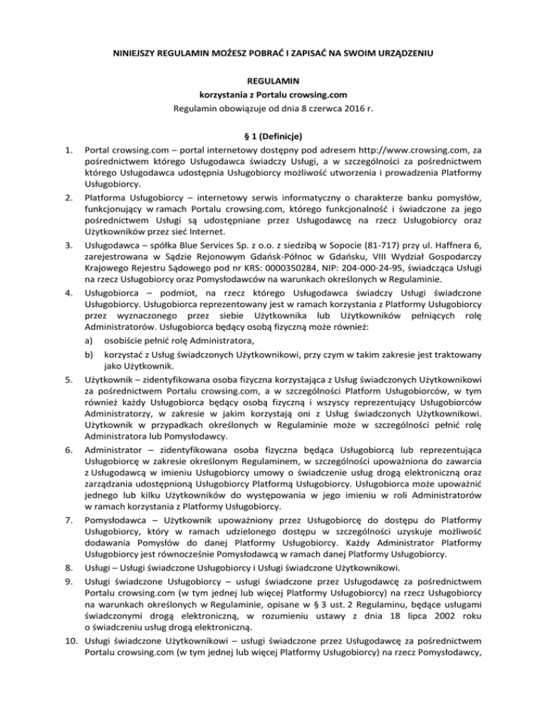 NINIEJSZY REGULAMIN MOŻESZ POBRAĆ I ZAPISAĆ NA SWOIM URZĄDZENIU REGULAMIN korzystania z Portalu crowsing.com Regulamin obowiązuje od dnia 8 czerwca 2016 r. § 1 (Definicje) 1. Portal crowsing.com – portal internetowy dostępny pod adresem http://www.crowsing.com, za pośrednictwem którego Usługodawca świadczy Usługi, a w szczególności za pośrednictwem którego Usługodawca udostępnia Usługobiorcy możliwość utworzenia i prowadzenia Platformy Usługobiorcy. 2. Platforma Usługobiorcy – internetowy serwis informatyczny o charakterze banku pomysłów, funkcjonujący w ramach Portalu crowsing.com, którego funkcjonalność i świadczone za jego pośrednictwem Usługi są udostępniane przez Usługodawcę na rzecz Usługobiorcy oraz Użytkowników przez sieć Internet. 3. Usługodawca – spółka Blue Services Sp. z o.o. z siedzibą w Sopocie (81-717) przy ul. Haffnera 6, zarejestrowana w Sądzie Rejonowym Gdańsk-Północ w Gdańsku, VIII Wydział Gospodarczy Krajowego Rejestru Sądowego pod nr KRS: 0000350284, NIP: 204-000-24-95, świadcząca Usługi na rzecz Usługobiorcy oraz Pomysłodawców na warunkach określonych w Regulaminie. 4. Usługobiorca – podmiot, na rzecz którego Usługodawca świadczy Usługi świadczone Usługobiorcy. Usługobiorca reprezentowany jest w ramach korzystania z Platformy Usługobiorcy przez wyznaczonego przez siebie Użytkownika lub Użytkowników pełniących rolę Administratorów. Usługobiorca będący osobą fizyczną może również: a) osobiście pełnić rolę Administratora, b) korzystać z Usług świadczonych Użytkownikowi, przy czym w takim zakresie jest traktowany jako Użytkownik. 5. Użytkownik – zidentyfikowana osoba fizyczna korzystająca z Usług świadczonych Użytkownikowi za pośrednictwem Portalu crowsing.com, a w szczególności Platform Usługobiorców, w tym również każdy Usługobiorca będący osobą fizyczną i wszyscy reprezentujący Usługobiorców Administratorzy, w zakresie w jakim korzystają oni z Usług świadczonych Użytkownikowi. Użytkownik w przypadkach określonych w Regulaminie może w szczególności pełnić rolę Administratora lub Pomysłodawcy. 6. Administrator – zidentyfikowana osoba fizyczna będąca Usługobiorcą lub reprezentująca Usługobiorcę w zakresie określonym Regulaminem, w szczególności upoważniona do zawarcia z Usługodawcą w imieniu Usługobiorcy umowy o świadczenie usług drogą elektroniczną oraz zarządzania udostępnioną Usługobiorcy Platformą Usługobiorcy. Usługobiorca może upoważnić jednego lub kilku Użytkowników do występowania w jego imieniu w roli Administratorów w ramach korzystania z Platformy Usługobiorcy. 7. Pomysłodawca – Użytkownik upoważniony przez Usługobiorcę do dostępu do Platformy Usługobiorcy, który w ramach udzielonego dostępu w szczególności uzyskuje możliwość dodawania Pomysłów do danej Platformy Usługobiorcy. Każdy Administrator Platformy Usługobiorcy jest równocześnie Pomysłodawcą w ramach danej Platformy Usługobiorcy. 8. Usługi – Usługi świadczone Usługobiorcy i Usługi świadczone Użytkownikowi. 9. Usługi świadczone Usługobiorcy – usługi świadczone przez Usługodawcę za pośrednictwem Portalu crowsing.com (w tym jednej lub więcej Platformy Usługobiorcy) na rzecz Usługobiorcy na warunkach określonych w Regulaminie, opisane w § 3 ust. 2 Regulaminu, będące usługami świadczonymi drogą elektroniczną, w rozumieniu ustawy z dnia 18 lipca 2002 roku o świadczeniu usług drogą elektroniczną. 10. Usługi świadczone Użytkownikowi – usługi świadczone przez Usługodawcę za pośrednictwem Portalu crowsing.com (w tym jednej lub więcej Platformy Usługobiorcy) na rzecz Pomysłodawcy, 11. 12. 13. 14. 15. 16. 1. 2. 3. 4. 5. 1. 2. na warunkach określonych w Regulaminie, opisane w § 3 ust. 3 Regulaminu, będące usługami świadczonymi drogą elektroniczną, w rozumieniu ustawy z dnia 18 lipca 2002 roku o świadczeniu usług drogą elektroniczną. Pomysł – idea lub koncepcja zgłaszana przez Pomysłodawcę za pośrednictwem funkcjonalności Platformy Usługobiorcy i udostępniana w Platformie Usługobiorcy innym Użytkownikom, w szczególności do skomentowania, zaopiniowania i oceny w ramach funkcjonalności Platformy Usługobiorcy. Komentarz – wszelkie treści zamieszczane przez Użytkownika w Platformie Usługobiorcy, nie będące Pomysłami, w szczególności stanowiące opinie lub oceny do Pomysłów lub Komentarzy innych Użytkowników. Pakiet – zakres udostępniania Usługobiorcy funkcjonalności Platformy Usługobiorcy, parametryzowany przede wszystkim przez: (i) okres ważności Pakietu, który określa przez jaki okres Usługobiorca ma prawo korzystać z danej Platformy Usługobiorcy w ramach danego Pakietu oraz (ii) wielkość Pakietu, która określa jakiej maksymalnie liczbie Pomysłodawców Usługobiorca może udzielić dostępu do danej Platformy Usługobiorcy. Usługobiorca uzyskuje lub nabywa Pakiety zgodnie z warunkami określonymi w Regulaminie oraz w Cenniku. Cennik – Załącznik nr 1 do Regulaminu określający ceny nabywania przez Usługobiorcę Pakietów. Regulamin – niniejszy dokument, wraz z wszystkimi załącznikami do niego, określający warunki świadczenia przez Usługodawcę Usług. Operator płatności – spółka Blue Media S.A. z siedzibą w Sopocie, ul. Haffnera 6, 81-717 Sopot, zarejestrowana w Sądzie Rejonowym Gdańsk-Północ VIII Wydział Gospodarczy KRS pod nr 0000320590, NIP 585-13-51-185, REGON 191781561, kapitał zakładowy 2 000 000 złotych (wpłacony w całości), nr wpisu w rejestrze dostawców usług płatniczych: IP17/2013, współpracująca z Usługodawcą na podstawie odrębnej umowy, świadcząca usługi obsługi płatności w ramach Portalu crowsing.com. § 2 (Postanowienia wstępne) Zgodnie z wymogami ustawy z dnia 18 lipca 2002 roku o świadczeniu usług drogą elektroniczną, Usługodawca tworzy niniejszy Regu