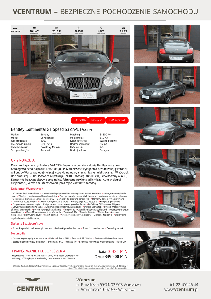 Bentley Continental GT Speed SalonPL FV23% Marka: Model: Rok Produkcji: Pojemność silnika : Kolor Nadwozia: Skrzynia biegów: Bentley Continental 2009 5998 cm3 Grafitowy Metalik Automat Przebieg : Moc silnika : Kolor Wnętrza: Rodzaj nadwozia: Ilość drzwi: Rodzaj paliwa: 84500 km 610 KM czarno-beżowe Coupe 2/3 Benzyna OPIS POJAZDU: Dokument sprzedaży: Faktura VAT 23% Kupiony w polskim salonie Bentley Warszawa, Katalogowa cena pojazdu: 1.362.000,00 PLN Możliwość wykupienia przedłużonej gwarancji w Bentley Warszawa obejmującej wszelkie naprawy mechaniczne i elektryczne. I Właściciel, Rok produkcji: 2009, Pierwsza rejestracja: 2010, Przebieg: 84500 km, Serwisowany w ASO, Samochód bezwypadkowy z oryginalną, fabryczną powłoką lakierniczą, Auto w ciągłej eksploatacji, w razie zainteresowania prosimy o kontakt z doradcą. Dodatkowe Wyposażenie ✓20-calowe felgi aluminiowe ✓Automatycznie przyciemniane wewnętrzne lusterko wsteczne ✓Elektryczne domykanie drzwi ✓Elektrycznie otwierana klapa bagażnika ✓Elektrycznie sterowany fotel kierowcy i pasażera z pamięcią ustawień ✓Elektrycznie sterowany hamulec postojowy ✓Elementy dekoracyjne carbonowe ✓Elementy dekoracyjne drewniane ✓Kierownica podgrzewana ✓Kierownica wykończona skórą ✓Klimatyzacja automatyczna ✓Komputer pokładowy ✓Podgrzewana przednia szyba ✓Podgrzewane i wentylowane przednie fotele ✓Reflektory Bi-Xenonowe Aktywne ✓Spryskiwacze ciśnieniowe lamp ✓System bezkluczykowy Keyless Entry ✓System Start/Stop ✓System monitorowania ciśnienia w oponach ✓System nawigacji satelitarnej ✓Tempomat ✓Czujniki parkowania tył i przód ✓Podgrzewane dysze spryskiwaczy ✓Drive Mode - regulacja trybów jazdy ✓Gniazdo 230V ✓Czujnik deszczu ✓Napęd 4x4 ✓Aktywny Tempomat ✓Elektryczne szyby ✓Pakiet pamięci ✓Automatyczna skrzynia biegów ✓Skórzana tapicerka ✓Elektryczna regulacja położenia kierownicy Systemy Bezpieczeństwa ✓Poduszka powietrzna kierowcy i pasażera ✓Poduszki przednie boczne ✓Poduszki tylne boczne ✓Centralny zamek Multimedia ✓Kamera wspomagająca parkowanie ✓DVD ✓Gniazdo AUX ✓Gniazdo USB / iPod® ✓Zestaw audio Premium Sound ✓Zestaw głośnomówiący Bluetooth ✓Zmieniarka 6CD ✓Funkcja TV ✓Sportowa kierownica wielofunkcyjna ✓Radio CD FINANSOWANIE I UBEZPIECZENIA: Przykładowa rata miesięczna, wpłata 20%, okres leasingu/kredytu 48 miesięcy, 10% wykupu. Rata leasingu jest wartością netto bez vat. Rata: 3 324 Cena: 349 900 PLN PLN Niniejsza treść nie stanowi oferty w rozumieniu przepisów Kodeksu Cywilnego oraz opisu towaru ani zapewnienia w rozumieniu art. 4 Ustawy z dnia 27 lipca 2002r o szczególnych warunkach sprzedaży konsumenckiej. Powered by TCPDF (www.tcpdf.org)