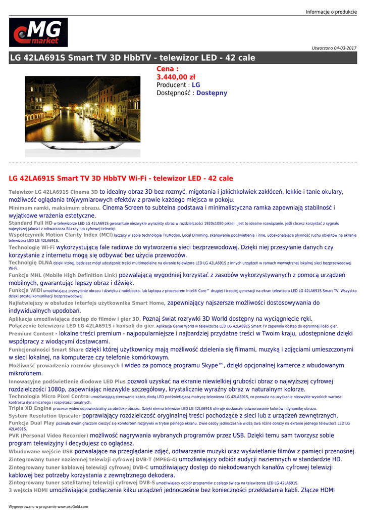 Informacje o produkcie Utworzono 04-03-2017 LG 42LA691S Smart TV 3D HbbTV - telewizor LED - 42 cale Cena : 3.440,00 zł Producent : LG Dostępność : Dostępny LG 42LA691S Smart TV 3D HbbTV Wi-Fi - telewizor LED - 42 cale Telewizor LG 42LA691S Cinema 3D to idealny obraz 3D bez rozmyć, migotania i jakichkolwiek zakłóceń, lekkie i tanie okulary, możliwość oglądania trójwymiarowych efektów z prawie każdego miejsca w pokoju. Minimum ramki, maksimum obrazu. Cinema Screen to subtelna podstawa i minimalistyczna ramka zapewniają stabilność i wyjątkowe wrażenia estetyczne. Standard Full HD w telewizorze LED LG 42LA691S gwarantuje niezwykle wyrazisty obraz w rozdzielczości 1920x1080 pikseli. Jest to idealne rozwiązanie, jeśli chcesz korzystać z sygnału najwyższej jakości z odtwarzacza Blu-ray lub cyfrowej telewizji. Współczynnik Motion Clarity Index (MCI) łączący w sobie technologie TruMotion, Local Dimming, skanowanie podświetlenia i inne, udoskonalające płynność ruchu obiektów na ekranie telewizora LED LG 42LA691S. Technologię Wi-Fi wykorzystującą fale radiowe do wytworzenia sieci bezprzewodowej. Dzięki niej przesyłanie danych czy korzystanie z internetu mogą się odbywać bez użycia przewodów. Technolgię DLNA dzięki której, będziesz mógł udostępnić treści multimedialne na ekranie telewizora LED LG 42LA691S z innych urządzeń w ramach wewnętrznej lokalnej sieci bezprzewodowej Wi-Fi. Funkcja MHL (Mobile High Definition Link) pozwalającą wygodniej korzystać z zasobów wykorzystywanych z pomocą urządzeń mobilnych, gwarantując lepszy obraz i dźwięk. Funkcja WiDi umożliwiającą przesyłanie obrazu i dźwięku z notebooka, lub laptopa z procesorem Intel® Core™ drugiej i trzeciej generacji na ekran telewizora LED LG 42LA691S Smart TV. Wszystko dzięki prostej komunikacji bezprzewodowej. Najłatwiejszy w obsłudze interfejs użytkownika Smart Home, zapewniający najszersze możliwości dostosowywania do indywidualnych upodobań. Aplikacja umożliwiająca dostęp do filmów i gier 3D. Poznaj świat rozrywki 3D World dostępny na wyciągnięcie ręki. Połączenie telewizora LED LG 42LA691S i konsoli do gier. Aplikacja Game World w telewizorze LED LG 42LA691S Smart TV zapewnia dostęp do ogromnej ilości gier. Premium Content - lokalne treści premium - najpopularniejsze i najbardziej przydatne treści w Twoim kraju, udostępnione dzięki współpracy z wiodącymi dostawcami. Funkcjonalności Smart Share dzięki której użytkownicy mają możliwość dzielenia się filmami, muzyką i zdjęciami umieszczonymi w sieci lokalnej, na komputerze czy telefonie komórkowym. Możliwość prowadzenia rozmów głosowych i wideo za pomocą programu Skype™, dzięki opcjonalnej kamerce z wbudowanym mikrofonem. Innowacyjne podświetlenie diodowe LED Plus pozwoli uzyskać na ekranie niewielkiej grubości obraz o najwyższej cyfrowej rozdzielczości 1080p, zapewniając niezwykle szczegółowy, krystalicznie wyraźny obraz w naturalnym kolorze. Technologia Micro Pixel Control umożliwiającą sterowanie każdą diodą LED podświetlającą matrycę telewizora LG 42LA691S, co pozwala na uzyskanie niezwykle wysokich wartości kontrastu dynamicznego i rozpiętości tonalnych. Triple XD Engine procesor wideo odpowiedzialny za obróbkę obrazu. Dzięki niemu telewizor LED LG 42LA691S oferuje doskonałe odwzorowanie kolorów i dynamikę obrazu. System Resolution Upscaler poprawiający rozdzielczość oryginalnej treści pochodzące z sieci lub z urządzeń zewnętrznych. Funkcja Dual Play pozwala dwóm graczom cieszyć się komfortem rozgrywki w trybie pełnego ekranu. Dwie osoby jednocześnie widzą dwa różne obrazy na ekranie jednego telewizora LED LG 42LA691S. PVR (Personal Video Recorder) możliwość nagrywania wybranych programów przez USB. Dzięki temu sam tworzysz sobie program telewizyjny i decydujesz co oglądasz. Wbudowane wejście USB pozwalające na przeglądanie zdjęć, odtwarzanie muzyki oraz wyświetlanie filmów z pamięci przenośnej. Zintegrowany tuner naziemnej telewizji cyfrowej DVB-T (MPEG-4) umożliwiający odbiór audycji naziemnych w standardzie HD. Zintegrowany tuner kablowej telewizji cyfrowej DVB-C umożliwiający dostęp do niekodowanych kanałów cyfrowej telewizji kablowej bez potrzeby korzystania z zewnętrznego dekodera. Zintegrowany tuner satelitarnej telewizji cyfrowej DVB-S umożliwiający odbiór programów z całego świata na telewizorze LED LG 42LA691S. 3 wejścia HDMI umożliwiające podłączenie kilku urządzeń jednocześnie bez konieczności przekładania kabli. Złącze HDMI Wygenerowano w programie www.oscGold.com zapewnia najwyższą jakość przesyłanego sygnału. Najwygodniejszy i najbardziej zaawansowany pilot do telewizora LED LG 42LA691S Magic Remote, który oferuje wyszukiwanie głosowe oraz sterowanie gestami. Sklep internetowy MG MARKET poleca telewizory LED LG Electronics 42LA691S Smart TV 3D 400 Hz 42 cale Tabela parametryczna Panel telewizora Przekątna ekranu Technologia HD Rozdzielczość Proporcje obrazu LED 42 cale Full HD 1920 x 1080 (HD 1080) 16:9 • DVB-S Tuner TV • DVB-T MPEG-4 (H.264) • DVB-C Technologie Motion Clarity Index 400 Hz System dźwięku przestrzennego Virtual Surround Plus System dźwięku Funkcje dodatkowe dźwięku DTS, Dolby Digital, Dolby Digital Plus, wbudowany głośnik niskotonowy, Smart Sound Mode Moc głośników Moc głośników 2 x 12 W + 10 W Telegazeta (pamięć) 2000 Złącza HDMI 3 Złącza Component 1 Złącza VGA Brak Liczba złączy USB 3 Liczba złączy EURO 1 Czytnik kart pamięci nie Pozostałe złącza we/wy Złącze Ethernet (LAN) tak telewizora LG 42LA691S Cyfrowe wyjście optyczne tak Cyfrowe wyjście koaksjalne nie Złącze CI (Common Interface) tak Wyjście słuchawkowe tak Montaż na ścianie VESA 400 x 400 Obudowa Matowa Pobór mocy 63 W Wymiary bez podstawy (szer. x wys.x gł.) 106,3 x 62,7 x 3,5 Wymiary cm Waga 14600 g Informacje o produkci
