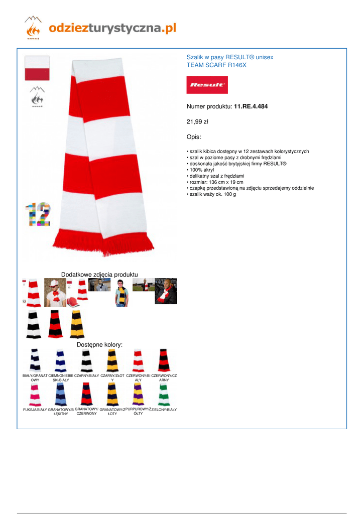 Szalik w pasy RESULT® unisex TEAM SCARF R146X Numer produktu: 11.RE.4.484 21,99 zł Opis: • szalik kibica dostępny w 12 zestawach kolorystycznych • szal w poziome pasy z drobnymi frędzlami • doskonała jakość brytyjskiej firmy RESULT® • 100% akryl • delikatny szal z frędzlami • rozmiar: 136 cm x 19 cm • czapkę przedstawioną na zdjęciu sprzedajemy oddzielnie • szalik waży ok. 100 g Dodatkowe zdjęcia produktu Dostępne kolory: BIAŁY/GRANAT CIEMNONIEBIE CZARNY/BIAŁY CZARNY/ZŁOT CZERWONY/BI CZERWONY/CZ OWY SKI/BIAŁY Y AŁY ARNY FUKSJA/BIAŁY GRANATOWY/B GRANATOWY/ GRANATOWY/Z PURPUROWY/Ż ZIELONY/BIAŁY CZERWONY ÓŁTY ŁĘKITNY ŁOTY Powered by TCPDF (www.tcpdf.org)