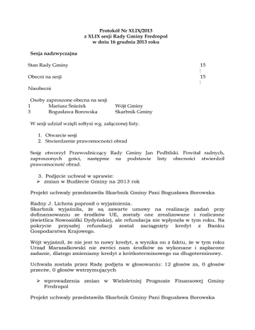 Protokół Nr XLIX/2013 z XLIX sesji Rady Gminy Fredropol w dniu 16 grudnia 2013 roku Sesja nadzwyczajna Stan Rady Gminy 115 5 115 5 Obecni na sesji Nieobecni Osoby zaproszone obecna na sesji 1 Mariusz Śnieżek 3 Bogusława Borowska Wójt Gminy Skarbnik Gminy W sesji udział wzięli sołtysi wg. załączonej listy. 1. Otwarcie sesji 2. Stwierdzenie prawomocności obrad Sesję otworzył Przewodniczący Rady Gminy Jan Podbilski. Powitał radnych, zaproszonych gości, następnie na podstawie listy obecności stwierdził prawomocność obrad. 3. Podjęcie uchwał w sprawie: zmian w Budżecie Gminy na 2013 rok Projekt uchwały przedstawiła Skarbnik Gminy Pani Bogusława Borowska Radny J. Lichota poprosił o wyjaśnienia. Skarbnik wyjaśniła, że są zawarte umowy na realizację zadań przy dofinansowaniu ze środków UE, zostały one zrealizowane i rozliczone (świetlica Nowosiółki Dydyńskie), ale refundacja nie wpłynęła w tym roku. Na pokrycie przyszłej refundacji został zaciągnięty kredyt z Banku Gospodarstwa Krajowego. Wójt wyjaśnił, że nie jest to nowy kredyt, a wynika on z faktu, że w tym roku Urząd Marszałkowski nie zwróci nam środków za wykonane i zapłacone zadanie, dlatego zmieniamy kredyt z krótkoterminowego na długoterminowy. Uchwała została przez Radę podjęta w głosowaniu: 12 głosów za, 0 głosów przeciw, 0 głosów wstrzymujących wprowadzenia zmian w Wieloletniej Prognozie Finansowej Gminy Fredropol Projekt uchwały przedstawiła Skarbnik Gminy Pani Bogusława Borowska Uchwała została przez Radę podjęta w głosowaniu: 12 głosów za, 0 głosów przeciw, 0 głosów wstrzymujących wprowadzenia zmian w uchwale w sprawie Zaciągnięcia pożyczki z budżetu państwa na wyprzedzające finansowanie w Banku Gospodarstwa Krajowego Oddział w Rzeszowie Projekt uchwały przedstawiła Skarbnik Gminy Pani Bogusława Borowska Uchwała została przez Radę podjęta w głosowaniu: 12 głosów za, 0 głosów przeciw, 0 głosów wstrzymujących wyboru metody ustalania opłaty za gospodarowanie odpadami komunalnymi pochodzącymi od właścicieli nieruchomości na których zamieszkują mieszkańcy oraz ustalenia stawek tej opłaty Projekt uchwały przedstawił Przewodniczący Jan Podbilski Dokonuje się wyboru metody ustalenia opłaty za gospodarowanie odpadami komunalnymi w taki sposób, że w przypadku nieruchomości, na której zamieszkują mieszkańcy, opłata za gospodarowanie odpadami komunalnymi stanowi iloczyn liczby mieszkańców zamieszkujących daną nieruchomość, oraz stawki opłaty ustalonej w § 2. lub § 3 Ustala się stawkę opłaty za gospodarowanie odpadami komunalnymi: 1) w wysokości 7,00 zł. miesięcznie od osoby zamieszkującej daną nieruchomość Ustala się stawkę opłaty za gospodarowanie odpadami komunalnymi w przypadku zbierania ich w sposób selektywny: 1) w wysokości 5,00 zł. miesięcznie od osoby zamieszkującej daną nieruchomość Uchwała została przez Radę podjęta w głosowaniu: 12 głosów za, 0 głosów przeciw, 0 głosów wstrzymujących sprzedaży/dzierżawy nieruchomości stanowiących własność Gminy Projekt uchwały przedstawił Przewodniczący Jan Podbilski Zezwolić Wójtowi Gminy na zawarcie kolejnej umowy na okres do 3 lat na dzierżawę nieruchomości gminnej o pow. 1,5000 ha stanowiącej część działki nr 148/ o pow. 8,6300 ha położonej w obrębie Sierakośce na rzecz dotychczasowego dzierżawcy – Pani Bożeny Maculak zam. Sierakośce 83 z przeznaczeniem na cele rolne Przewodniczący przedstawił wyliczenia wysokości czynszu dzierżawnego, kosztów podatku i utrzymania przedmiotowej nieruchomości oraz wysokości dopłat bezpośrednich Radny J. Janowski przedstawił wyliczenia odnośnie kosztów utrzymania działki i dopłat bezpośrednich. Zdaniem radnego czynsz dzierżawny powinien wynosić w granicach 570 zł. Radny zwrócił uwagę, że należałoby uregulować również sprawę czynszów za lokale mieszkalne, które też są niskie. Zwrócił się do Wójta o przygotowanie projektu uchwały w tej sprawie. Przewodniczący stwierdził, że stawki czynszu dzierżawnego regulują odrębne przepisy. Wójt stwierdził, że według jego wyliczenia kosztów utrzymania działki i dopłat bezpośrednich czynsz powinien być w granicach 400 zł. To by oznaczało 50 zł wzrostu czynszu dla dzierżawcy. Radny J. Lichota zauważył, że trzeba wziąć pod uwagę fakt, że rolnik utrzymuje się z tego pola Radny J. Lichota stwierdził, że Rada podejmuje uchwałę czy wyraża zgodę na dzierżawę czy nie, a czynsz przy podpisaniu umowy ustala Wójt Wójt odpowiedział, że na początku kadencji przyjęta została zasada, że wszelkie dzierżawy są ustalane przez Wójta w porozumieniu z Radą Radny J. Lichota stwierdził, że tyle uchwał Rada podjęła w sprawie dzierżawy nieruchomości i nad żadna się zastanawiano nad czynszem tak jak teraz Uchwała została przez Radę podjęta w głosowaniu: 12 głosów za, 0 głosów przeciw, 0 głosów wstrzymujących Radny J. Janowski stwierdził, że nie ma żadnych powodów, żeby oddawać nieruchomości Stowarzyszeniom w dzierżawę, powinno się to odbywać w drodze przetargu tak jak dla innych podmiotów. Radny przypomniał jak wyglądała sytuacja z wydzieleniem drogi w Nowych Sadach i sprzedaży działek mieszkańcom. 4. Zapytania i interpelacje radnych 5. Dyskusja Przewodniczący przedstawił wnioski Państwa S.T Dorociak właścicieli działki rekreacyjnej w Makowej w sprawie ustanowienia przez Radę Gminy osobnej stawki podatku od nieruchomości dla terenów zalewowych. Państwo Dorociak w trakcie dyskusji przedstawili dokumenty oraz swoje argumenty na udowodnienie faktu, że ich nieruchomość znajduje się w terenie zalewowy i powinny być ustalone odrębne stawki podatku od nieruchomości dla tego terenu Wójt zapytał czy były zgłaszane jakieś wnioski do RZGW w sprawie regulacji tego odcina Wiaru, bo obniżenie podatków nie spowoduje, że Wiar