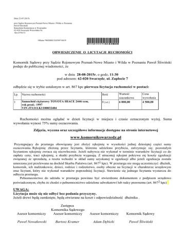 Dnia 22-07-2015r. przy Sądzie Rejonowym Poznań-Nowe Miasto i Wilda w Poznaniu Paweł Śliwiński Kancelaria Komornicza w Swarzędzu 62-020 Swarzędz Wrzesińska 9a Km 4756/13 *0020001324394* #Marta *0020001324394*/0419/ OBWIESZCZENIE O LICYTACJI RUCHOMOŚCI Komornik Sądowy przy Sądzie Rejonowym Poznań-Nowe Miasto i Wilda w Poznaniu Paweł Śliwiński podaje do publicznej wiadomości, że w dniu 28-08-2015r. o godz. 11:30 pod adresem: 62-020 Swarzędz, ul. Zapłocie 7 odbędzie się w trybie ustalonym w art. 867 kpc pierwsza licytacja ruchomości w postaci: Lp. Nazwa ruchomości Ilość 1 Samochód ciężarowy TOYOTA HIACE 2446 ccm, rok prod.: 1997 VIN JT121LK1100032404 1 [szt.] Wartość szacunkowa 6 000,00 Cena wywołania 4 500,00 Ruchomości można oglądać w dzień licytacji w miejscu i czasie oznaczonym wyżej. Suma wywołania wynosi 75% sumy oszacowania. Zdjęcia, wycena oraz szczegółowe informacje dostępne na stronie internetowej www.komornikswarzedz.pl Przystępujący do przetargu obowiązany jest złożyć rękojmię w wysokości jednej dziesiątej części sumy oszacowania. Rękojmię złożoną przez licytanta, któremu udzielono przybicia, zatrzymuje się; pozostałym licytantom rękojmię zwraca się niezwłocznie. Jeżeli nabywca nie wykonał w terminie warunków licytacji co do zapłaty ceny, traci rękojmię, a skutki przybicia wygasają. Z utraconej rękojmi pokrywa się koszty egzekucji związanej ze sprzedażą, a reszta wchodzi w skład sumy uzyskanej w egzekucji albo jeżeli egzekucja została umorzona jest przelewana na dochód Skarbu Państwa (art. 8671 kpc). W przetargu nie mogą uczestniczyć: dłużnik, komornik, ich małżonkowie, dzieci, rodzice i rodzeństwo, osoby obecne na licytacji w charakterze urzędowym oraz licytant, który nie wykonał warunków poprzedniej licytacji. Stawienie się jednego licytanta wystarcza do odbycia przetargu. Pełnomocnictwo do udziału w przetargu powinno być stwierdzone dokumentem z podpisem urzędowo poświadczonym, chyba że chodzi o pełnomocnictwo udzielone adwokatowi lub radcy prawnemu (art. 8672 kpc) UWAGA: Licytacja może się nie odbyć bez podania przyczyny. Jeżeli drzwi będą zamknięte, będą otwierane na koszt i odpowiedzialność dłużnika . Asesor komorniczy Zastępca Komornika Sądowego Asesor komorniczy Asesor komorniczy Komornik Sądowy Paweł Nowakowski Bartosz Kramer Adam Dębicki Paweł Śliwiński