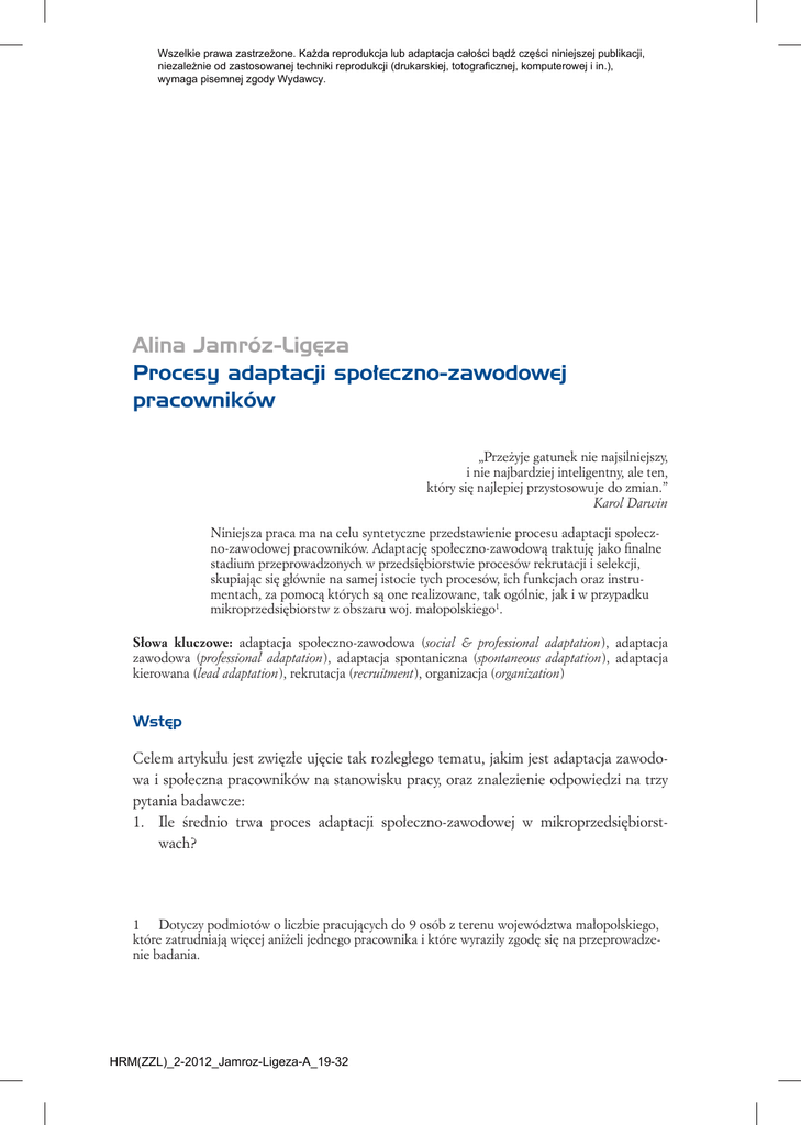 Wszelkie prawa zastrzeżone. Każda reprodukcja lub adaptacja całości bądź części niniejszej publikacji, niezależnie od zastosowanej techniki reprodukcji (drukarskiej, totograficznej, komputerowej i in.), wymaga pisemnej zgody Wydawcy. Alina Jamróz-Ligęza Procesy adaptacji społeczno-zawodowej pracowników „Przeżyje gatunek nie najsilniejszy, i nie najbardziej inteligentny, ale ten, który się najlepiej przystosowuje do zmian.” Karol Darwin Niniejsza praca ma na celu syntetyczne przedstawienie procesu adaptacji społeczno-zawodowej pracowników. Adaptację społeczno-zawodową traktuję jako finalne stadium przeprowadzonych w przedsiębiorstwie procesów rekrutacji i selekcji, skupiając się głównie na samej istocie tych procesów, ich funkcjach oraz instrumentach, za pomocą których są one realizowane, tak ogólnie, jak i w przypadku mikroprzedsiębiorstw z obszaru woj. małopolskiego1. Słowa kluczowe: adaptacja społeczno-zawodowa (social & professional adaptation), adaptacja zawodowa (professional adaptation), adaptacja spontaniczna (spontaneous adaptation), adaptacja kierowana (lead adaptation), rekrutacja (recruitment), organizacja (organization) Wstęp Celem artykułu jest zwięzłe ujęcie tak rozległego tematu, jakim jest adaptacja zawodowa i społeczna pracowników na stanowisku pracy, oraz znalezienie odpowiedzi na trzy pytania badawcze: 1. Ile średnio trwa proces adaptacji społeczno-zawodowej w mikroprzedsiębiorst wach? 1 Dotyczy podmiotów o liczbie pracujących do 9 osób z terenu województwa małopolskiego, które zatrudniają więcej aniżeli jednego pracownika i które wyraziły zgodę się na przeprowadzenie badania. HRM(ZZL)_2-2012_Jamroz-Ligeza-A_19-32 20 Alina Jamróz-Ligęza 2. Czy mikroprzedsiebiorstwa posiadają opracowany program adaptacyjny dla nowych pracowników? 3. Jaki rodzaj informacji i przez kogo zostaje przekazany nowym pracownikom w procesie adaptacji zawodowej? Pytania zostały zweryfikowane za pośrednictwem przeprowadzonych badań empirycznych. Hipotezami badań były stwierdzenia: H-1 Jeżeli mikroprzedsiębiorstwa posiadają opracowany program adaptacyjny, to stosują go w praktyce. H-2 W procesie adaptacji wszystkie informacje są przekazywane przez właściciela firmy (prezesa). H-3 Proces adaptacji społeczno-zawodowej w mikroprzedsiębiorstwach trwa do miesiąca. Metoda badawcza Przy pisaniu pracy posłużono się analizą źródeł pierwotnych, analizą artykułów w periodykach dotyczących przedmiotu oraz informacjami dostępnymi na stronach WWW. Część empiryczna artykułu została napisana na podstawie wyników badań kwestionariuszowych. Respondentami kwestionariuszy byli pracownicy oraz zarząd mikroprzedsiębiorstw z woj. małopolskiego. Podstawowymi narzędziami badawczymi były: 1) opracowany kwestionariusz wywiadu dla zarządu przedsiębiorstw oraz 2) kwestionariusz ankiety dla pracowników przedsiębiorstw. Kwestionariusz ankiety posłużył do zdiagnozowania prawidłowego przebiegu procesu adaptacji społeczno-zawodowej pracowników w przedsiębiorstwie, natomiast kwestionariusz wywiadu posłużył do identyfikacji strategii zarządzania zasobami ludzkimi w przedsiębiorstwie, w tym głównie procesu adaptacyjnego dla nowych pracowników. Na podstawie kwestionariuszy zostały opracowane dane statystyczne. Istota i rodzaje adaptacji społeczno-zawodowej Proces rekrutacji i selekcji, w wąskim zakresie, kończy się z chwilą podpisania przez wybranego kandydata umowy o pracę. W szerokim zakresie, zakończenie procesu rekrutacji i selekcji następuje dopiero po okresie adaptacji społeczno-zawodowej nowo zatrudnionego pracownika. Adaptacja społeczno-zawodowa polega na przyswojeniu przez pracownika nowych ról, wynikających z zakresu jego obowiązków. Każda zmiana, a zwłaszcza zmiana miejsca pracy, zakresu czynności, nawet w przypadku bardzo dobrej znajomości przyszłych zadań, jest bardzo trudnym i skomplikowanym zabiegiem dla pracownika i dla osób odpowiedzialnych za jego adaptację [Szałkowski, 2000, s. 83]. HRM(ZZL)_2-2012_Jamroz-Ligeza-A_19-32 Procesy adaptacji społeczno-zawodowej pracowników... 21 Okres adaptacji jest zatem decydującym czynnikiem udanej rekrutacji i selekcji, na który wpływa kilka czynników [Armstrong, 2007, s. 414-416]: znaczne obniżenie kosztów i niedogodności związanych z szybkim odchodzeniem nowo zatrudnionych osób – koszty związane z rekrutacją, wprowadzeniem do organizacji, przejściowej zmiany agencji poszukującej pracowników; zwiększenie zaangażowania – identyfikacja pracownika z organizacją, chęć pozostania w niej oraz gotowość do wytężonej pracy na jej rzecz; ustalenie zasad kontaktu psychologicznego – niepisanych przekonań i założeń (norm, wartości i postaw) dotyczących oczekiwanych zachowań pracowników określających podstawę stosunku pracy; przyspieszenie postępu wzdłuż krzywej uczenia się – postęp przyjętego pracownika przebiega wzdłuż krzywej uczenia się, dlatego efektywność pracy nastąpi dopiero po pewnym okresie, a ponieważ długość krzywej uczenia się i szybkość uczenia się u różnych osób są odmienne, należy uwzględnić to na samym początku, tak aby nowi pracownicy jak najszybciej osiągnęli pełną efektywność; socjalizacja – jej przeprowadzenie powinno przebiegać bez zakłóceń, tak aby nowo przyjęci pracownicy szybciej się zaaklimatyzowali i polubili pracę w organizacji. Adaptacja to proces charakteryzujący się wielowymiarowością i złożonością, a jego powodzenie zależy zarówno od samego pracownika, jak i od organizacji. Należy jednak pamiętać, że proces ten nie dotyczy tylko nowo przyjętych pracowników pozyskanych z zewnętrznego rynku pracy, ale również pracowników przesuniętych na inne stanowisko lub awansowanych wewnątrz organizacji, zwłaszcza jeżeli przesunięcie wystąpiło w wyniku restrukturyzacji organizacyjnej lub fuzji przedsiębiorstw. W prakty