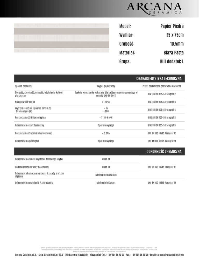 Model: Papier Piedra Wymiar: 25 x 75cm Grubość: 10.5mm Materiał: Bia?a Pasta Grupa: BIII dodatek L CHARAKTERYSTYKA TECHNICZNA Sposób produkcji Długość, szerokość, grubość, odchylenia kątów i płaszczyzn Nasiąkliwość wodna Wytrzymałość na zginanie (N/mm.2) Siła łamiąca (N) Rozszerzalność liniowa cieplna Odporność na szok termiczny Rozszerzalność wodna (objętościowa) Odporność na pęknięcia Wypał pojedynczy Płytki ceramiczne prasowane na sucho Spełnia wymagania wskazane dla każdego modelu zawartego w normie UNE-EN 14411 UNE EN ISO 10545 Paragraf 2 E > 10% UNE EN ISO 10545 Paragraf 3 > 15 > 600 UNE EN ISO 10545 Paragraf 4 < 7*10 -6 /ºC UNE EN ISO 10545 Paragraf 8 Spełnia wymogi UNE EN ISO 10545 Paragraf 9 < 0.6% UNE EN ISO 10545 Paragraf 10 Spełnia wymogi UNE EN ISO 10545 Paragraf 11 ODPORNOŚĆ CHEMICZNA Odporność na środki czystości domowego użytku Klasa GA Dodatki (sole) do wody basenowej Klasa GA Odporność chemiczna na kwasy i zasady o niskim stężeniu Odporność na plamienie / zabrudzenia UNE EN ISO 10545 Paragraf 13 Minimalnie Klasa GLB Minimalnie Klasa 4 UNE EN ISO 10545 Paragraf 14 UWAGA: przed rozpoczęciem prac prosimy sprawdzić tonację, kaliber i jakość. Reklamacje po ułożeniu materiału nie będą akceptowane. Zaleca się minimalny odstęp o szerokości 1-2 mm. Niniejszy dokument zawiera wyłącznie informacje handlowe, nie może być używany ani w drodze sądowej ani administracyjnej bez uprzedniego zezwolenia ze strony Arcana Ceràmica S.A. Kolory na zdjęciu są orientacyjne i mogą odbiegać od rzeczywistego koloru produktu Arcana Cerámica S.A. · Crta. Castellón Km. 23.6 · 12110 Alcora (Castellón - Hiszpania) · Tel. : +34 964 36 70 22 · Fax. : +34 964 36 70 30 · Email : [email protected] Powered by TCPDF (www.tcpdf.org)