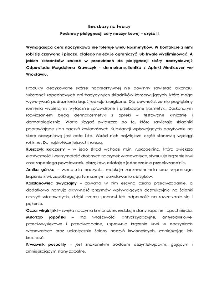 Bez skazy na twarzy Podstawy pielęgnacji cery naczynkowej – część II Wymagająca cera naczynkowa nie toleruje wielu kosmetyków. W kontakcie z nimi robi się czerwona i piecze, dlatego należy je ograniczyć lub trwale wyeliminować. A jakich składników szukać w produktach do pielęgnacji skóry naczyniowej? Odpowiada Magdalena Krawczyk - dermokonsultantka z Apteki Medicover we Wrocławiu. Produkty dedykowane skórze nadreaktywnej nie powinny zawierać alkoholu, substancji zapachowych ani tradycyjnych składników konserwujących, które mogą wywoływać podrażnienia bądź reakcje alergiczne. Dla pewności, że nie pogłębimy rumienia wybierajmy wyłącznie sprawdzone i przebadane kosmetyki. Doskonałym rozwiązaniem będą dermokosmetyki z apteki – testowane klinicznie i dermatologicznie. Warto sięgać zwłaszcza po te, które zawierają składniki poprawiające stan naczyń krwionośnych. Substancji wpływających pozytywnie na skórę naczyniową jest cała lista. Wśród nich największą część stanowią wyciągi roślinne. Do najskuteczniejszych należą: Ruszczyk kolczasty – w jego skład wchodzi m.in. ruskogenina, która zwiększa elastyczność i wytrzymałość drobnych naczynek włosowatych, stymuluje krążenie krwi oraz zapobiega powstawaniu obrzęków, działając jednocześnie przeciwzapalnie. Arnika górska – wzmacnia naczynia, redukuje zaczerwienienia oraz wspomaga krążenie krwi, zapobiegając tym samym powstawaniu obrzęków. Kasztanowiec zwyczajny – zawarta w nim escyna działa przeciwzapalnie, a dodatkowo hamuje aktywność enzymów wpływających destrukcyjnie na ścianki naczyń włosowatych, dzięki czemu podnosi ich odporność na rozszerzanie się i pękanie. Oczar wirginijski – zwęża naczynia krwionośne, redukuje stany zapalne i opuchnięcia. Miłorząb japoński – ma właściwości antyoksydacyjne, antyrodnikowe, przeciwwysiękowe i przeciwzapalne, usprawnia krążenie krwi w naczyniach włosowatych oraz uelastycznia ściany naczyń krwionośnych, zmniejszając ich kruchość. Krwawnik pospolity – jest znakomitym środkiem dezynfekującym, gojącym i zmniejszającym stany zapalne. Algi morskie – zawierają wiele cennych substancji, które wzmacniają skórę, nawilżają ją i łagodzą jej podrażnienia. Witamina K – szczególnie przydatna przy pierwszych objawach cery naczynkowej – podczas występowania rumienia; działa intensywnie przeciwobrzękowo – szybko łagodzi zaczerwienienia skóry i zmniejsza widoczność rozszerzonych naczynek. Witamina C – nie tylko wzmacnia i uelastycznia ściany naczyń, ale również stymuluje syntezę kolagenu i elastyny. Rutyna – zwęża i uszczelnia naczynia krwionośne. Diosmina i hesperydyna – to niezastąpiony duet flawonoidów oddziałujący korzystnie na poprawę napięcia ścian naczyń; w leczeniu trądziku różowatego i profilaktyce skóry naczyniowej pomocne bywa również stosowanie ich w postaci preparatów doustnych.