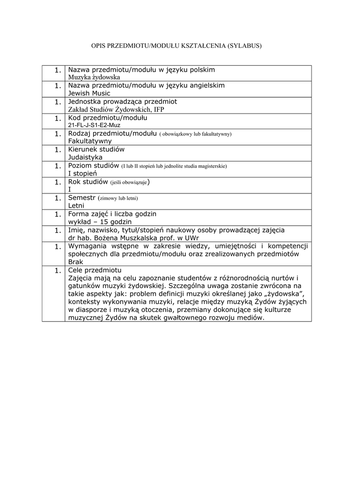 OPIS PRZEDMIOTU/MODUŁU KSZTAŁCENIA (SYLABUS) 1. Nazwa przedmiotu/modułu w języku polskim 1. 1. Muzyka żydowska Nazwa przedmiotu/modułu w języku angielskim Jewish Music Jednostka prowadząca przedmiot Zakład Studiów Żydowskich, IFP 1. Kod przedmiotu/modułu 21-FL-J-S1-E2-Muz 1. Rodzaj przedmiotu/modułu 1. 1. 1. 1. 1. 1. 1. 1. ( obowiązkowy lub fakultatywny) Fakultatywny Kierunek studiów Judaistyka Poziom studiów (I lub II stopień lub jednolite studia magisterskie) I stopień Rok studiów (jeśli obowiązuje) I Semestr (zimowy lub letni) Letni Forma zajęć i liczba godzin wykład – 15 godzin Imię, nazwisko, tytuł/stopień naukowy osoby prowadzącej zajęcia dr hab. Bożena Muszkalska prof. w UWr Wymagania wstępne w zakresie wiedzy, umiejętności i kompetencji społecznych dla przedmiotu/modułu oraz zrealizowanych przedmiotów Brak Cele przedmiotu Zajęcia mają na celu zapoznanie studentów z różnorodnością nurtów i gatunków muzyki żydowskiej. Szczególna uwaga zostanie zwrócona na takie aspekty jak: problem definicji muzyki określanej jako „żydowska”, konteksty wykonywania muzyki, relacje między muzyką Żydów żyjących w diasporze i muzyką otoczenia, przemiany dokonujące się kulturze muzycznej Żydów na skutek gwałtownego rozwoju mediów. 1. Zakładane efekty kształcenia WIEDZA ma podstawową wiedzę dotyczącą najważniejszych zjawisk w kulturze muzycznej Żydów od czasów biblijnych do współczesnych Symbole kierunkowych efektów kształcenia, np.: K_W01*, K_U05, K_K03 K_W09 K_W06 zna podstawowe metody analizy i interpretacji żydowskiej muzyki tradycyjnej w kontekście kulturowym; zna zajmujące się nimi teorie i szkoły badawcze UMIEJĘTNOŚCI potrafi identyfikować różne rodzaje wytworów żydowskiej kultury muzycznej będące przedmiotem badań nauk o kulturze i sztuce KOMPETENCJE SPOŁECZNE ma świadomość różnic kulturowych i związanych z tym wyzwań, potrafi w praktyce stosować wiedzę o mechanizmach komunikacji interkulturowej 1. 1. K_UO5 K_K06 potrafi uczestniczyć w życiu kulturalnym, korzystać z różnorodnych jego form, K_K07 zwłaszcza koncertów muzyki żydowskiej i różnych mediów, jak internet, publikacje tekstowe i płytowe poświęcone muzyce żydowskiej Treści programowe 1. Panorama idiomów muzyki żydowskiej (2 godz.) 2. Muzyka w Biblii (2 godz.) 3. Śpiewy synagogalne (2 godz.) 4. Miejsce muzyki w koncepcji chasydów (2 godz.) 5. Muzyka klezmerska w zarysie historycznym (2 godz.) 6. Muzyka w teatrze żydowskim (2 godz.) 7. Muzyka żydowska w filmie ( 2 godz.) 8. Kolokwium (1 godz.) Zalecana literatura (podręczniki) artykuły dot. muzyki żydowskiej w The New Grove Dictionary of Music and Musicians oraz Encyclopaedia Judaica; Idelsohn Abraham Zwi, Jewish Music in its Historical Development. New York: Henry Holt and Company 1929; Heskes Irene, Passport to Jewish Music. Its History, Traditions, and Culture. Westport, Connecticut - London: Greenwood Press 1994; Fuks M.: Muzyka ocalona. Judaica polskie, Warszawa 1989 1. Forma zaliczenia poszczególnych komponentów przedmiotu/modułu, sposób sprawdzenia osiągnięcia zamierzonych efektów kształcenia: wykład: kolokwium (obowiązuje znajomość materiału z wykładów oraz wskazanych lektur) 1. Język wykładowy polski 19. Obciążenie pracą studenta Forma aktywności studenta Godziny zajęć (wg planu studiów) z nauczycielem: - wykład: - ćwiczenia: - laboratorium: - konwersatorium: Praca własna studenta, np.: - przygotowanie do zajęć: - opracowanie wyników: - czytanie wskazanej literatury: - napisanie raportu z zajęć: - przygotowanie do egzaminu: Suma godzin Liczba punktów ECTS Średnia liczba godzin na zrealizowanie aktywności 15 45 60 2 *objaśnienie symboli: K (przed podkreślnikiem)- kierunkowe efekty kształcenia W - kategoria wiedzy U - kategoria umiejętności K (po podkreślniku) - kategoria kompetencji społecznych 01, 02, 03 i kolejne - numer efektu kształcenia