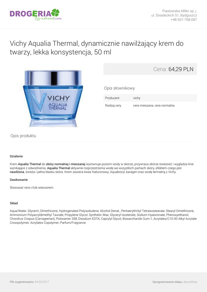 Piastowska Miller sp. j. ul. Śniadeckich 51, Bydgoszcz +48 501-768-087 Vichy Aqualia Thermal, dynamicznie nawilżający krem do twarzy, lekka konsystencja, 50 ml Cena: 64,29 PLN Opis słownikowy Producent vichy Rodzaj cery cera mieszana, cera normalna Opis produktu Działanie Krem Aqualia Thermal do skóry normalnej i mieszanej wyrównuje poziom wody w skórze, przywraca skórze świeżość i wygładza linie wynikające z odwodnienia. Aqualia Thermal aktywnie rozprzestrzenia wodę we wszystkich partiach skóry, efektem czego jest nawilżona, świeża i pełna blasku skóra. Krem zawiera kwas hialuronowy, Aquabioryl, karagen oraz wodę termalną z Vichy. Dawkowanie Stosować rano i/lub wieczorem. Skład Aqua/Water, Glycerin, Dimethicone, Hydrogenated Polyisobutene, Alcohol Denat., Pentaerythrityl Tetraisostearate, Stearyl Dimethicone, Ammoniium Polyacryldimethyl Taurate, Propylene Glycol, Synthetic Wax, Glyceryl Isosterate, Sodium Hyaluronate, Phenoxyethanol, Chondrus Crispus (Carrageenan), Poloxamer 338, Disodium EDTA, Caprylyl Glycol, Biosaccharide Gum-1, Acrylates/C10-30 Alkyl Acrylate Crosspolymer, Acrylates Copolymer, Parfum/Fragrance. Plik wygenerowano: 04-03-2017 Powered by TCPDF (www.tcpdf.org) Oprogramowanie sklepu: AptusShop