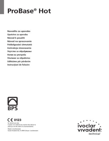 ProBase® Hot Navodilo za uporabo Uputstvo za uporabu Návod k pouÏití Návod na spracovanie Feldolgozási útmutató Instrukcja stosowania ìÔÛÚÒÚ‚Ó Á‡ Ó·‡¨Ë‚‡øÂ 燘ËÌ Ì‡ ÛÔÓÚ·‡ ìÔ˙Ú‚‡Ì Á‡ Ó·‡·ÓÚ͇ Udhëzime për përdorim Instrucfliuni de folosire For dental use only. Caution: U.S. Federal Law restricts this device to sale by or on the order of a licensed dentist. Made in Liechtenstein Ivoclar Vivadent AG, FL-9494 Schaan / Liechtenstein Slovensko Navodilo za uporabo Opis izdelka ProBase Hot – material omogoãa standard kvalitete v odnosu na obdelavo, obliko in stabilnost barve in tudi omogoãa najveã moÏen standard no‰enja umetnih materialov za proteze, obdelanih v postopku vroãe polimerizacije. Na voljo so razliãne barve. Razliãne varijacije polimerizacije omogoãajo veliko moÏnosti uporabe. Sestavine Pra‰ek: Polymethylmethacrylat, mehãalci,benzoylperoxid, barvila Tekoãina: Methylmethacrylat, dimethacrylat (za povezavo), katalizatorji Indikacija – Totalna protetika – Delna protetika – Kombinirana protetika – Spodnje oblaganje Kontraindikacija – Potrebno se je izogniti direktnega kontakta z nepolimeriziranimi materiali v intraoralnem podroãju. – V dokazanih primerih alergije na sestavne snovi ProBase Hot nadaljna uporaba ni priporoãljiva in jo je treba opustiti. Stranski uãinki V posameznih primerih so opisane lokalne alergiãne reakcije na Polymethylmethacrylat-materiale. Obdelava Priprava Poparjeno, dobro namoãeno mavãno povr‰ino dvakrat izolirati s Separating Fluid-om in pustiti da se dobro posu‰i. Zobe- dobro „zdrgniti“ in zmoãiti z Monomerom, da se zavaruje zveza z bazo proteze. – Mavãno povr‰ino dvakrat izolirati. – Vo‰ãeni model z mavcem poloÏiti v kiveto. Doziranje – Idealni odnos zmesi za eno protezo: 22,5 g pra‰ka : 10 ml Monomer-ja – S sistemo za doziranje: 1 markacija Polymer-ja : 10 ml Monomer-ja Sistema za doziranje Integrirani sistem za doziranje omogoãa idealni odnos zmesi in s tem najmanj‰e moÏno krãenje po polimerizaciji ProBase Hot. Merni cilinder za Polymer kaÏe koliãine za eno ali dve proteze srednje velikosti. Markacija na Monomer-cilindru kaÏe milimetarsko skalo. V vsakem primeru narekovano koliãino stehtati. Me‰anje Pra‰ek in tekoãino zme‰ati v odnosu me‰anja ali v prostem odnosu z lopatico in intensivno preme‰ati. V zaprti posodi za me‰anje v ãasu od 8–10 minut (pri sobni temperaturi od 23 °C) pustiti da „dozori“. ·irina obdelave Takoj ko material po ãasu „dozrevanja“ ni veã lepljiv, lahko se obdela na sobni temperaturi od 23 °C pribliÏno 20 minut. – Pra‰ek in tekoãino intenzivno preme‰ati – „Pred-testo“ in ‰irina za obdelavo sta odvisna od temperature. Pre‰anje Testo iz umetne mase s preseÏkem poloÏiti v obe izolirani polovici kivete ki imata roãno temperaturo. Kiveto pozorno zapreti in poloÏti v stiskanico pod tlakom 80 barov. Fiksirati s pomoãjo napenjalne zaponke. Stisni tlak pustiti! Polimerizacija Polimerizacija – vroãa – se izvaja v nekaj razliãnih postopkov: Standardni postopek (metoda ki se priporoãa): – Zaprto kiveto poloÏiti v hladno vodo, pogreti na 70 °C in pustiti za ãas od 30 minut, zatem pogreti na 100 °C in kuhati 30 minut. – Kiveto poloÏiti v vroão vodo od 70 °C in pustiti za ãas od 60 minut, potom pogreti do temperature 100 °C in kuhati 30 minut – Kiveto poloÏiti direktno v krop in kuhati 40 minut. Ustreza samo protezam srednje velikosti! – Kiveto poloÏiti v hladno vodi, pogreti do 80 °C in v ãasu od 10 ur polimerizirati. Toplotni vir izkljuãiti. Kiveto ãez noã pustiti da se hladi v isti vodni kopeli. – Kiveto polimerizirati za 10 ur pri temperaturi od 80 °C v suhi posodi. PreseÏna koliãina Monomer-ja se zniÏa s pomoãjo povi‰anja temperature polimerizacije. Zaradi ãim manj‰e preseÏne koliãine Monomer-ja, se priporoãa standardna metoda. Ohlajevanje Kiveto poloÏiti da postoji najmanj 30 minuti na zraku, nato v mrzli vodi popolnoma ohladiti. Jemanje in izdelava Popolnoma ohlajeno kiveto odpreti in mavec odstraniti. Okluzijska kontrola, obdelava in poliranje se izvajajo na obiãajni naãin. MoÏnosti za popravila in korekture s ProBase Hot: Korekture in popravila se lahko izvajajo z hladnim polimerizatom ProBase Cold v tehniki vlivanja. Pri tem se treba vsaka povr‰ina na katero se nana‰a dobro „zdrgniti“ in dobro zmoãiti z Monomer-jem. Opozorilo o nevarnosti – Monomer vsebuje Methylmethacrylat. – Methylmethacrylat (MMA) je lahko vnetljiv (toãka vnetja + 10 °C). – MoÏna je senzibilizacija v stiku s koÏo. – DrÏati oddaljeno od virov vÏiganja. V ãasu obdelave ne kaditi. – Ne dopustiti da pride v kanalizacijo. – Porabiti mere proti elektronskim polnjenjem. Skladi‰ãenje – Posode z Monomer-jem hraniti v hladnem, temnem in dobro zraãenem prostoru. – Primerna tempertura za hrambo je pri 2–28 °C. – Izdelke po izteku roka veljavnosti ne uporabljati. – Hraniti nedostopno otrokom. Datum zadnje revizije navodila: 11/2010 Proizvajalec Ivoclar Vivadent AG, FL-9494 Schaan/Liechtenstein Material je razvit za uporabo na dentalnem podroãju in se uporablja samo primerno navodilu za uporabo. Za po‰kodbe, ki izhajajo iz drugaãnega naãina uporabe, ali iz nepravilne uporabe, proizvajalec ne prevzema odgovornosti. Poleg tega uporabnik je dolÏan izdelek na lastno odgovornost preizkusiti pred uporabo, lastnost in uporabnost za predvidene namene, zlasti ãe te lastnosti niso navedene v navodilu za uporabo. Hrvatski Uputstvo za uporabu Opis proizvoda ProBase Hot postavlja novi standard kakvoÊe u odnosu na obraivanje, oblik i stabilnost boje kao i vrhunsku udobnost noπenja kod vruÊe polimeriziranih umjetnih tvari za proteze. Na raspolaganju stoje razliËite boje. Razne varijacije polimerizacije nude mnogostruke moguÊnosti primjene. Sastav Praπak Polymetilmetakrilat, omekπivaË, benzoilperoksid, pigmenti 