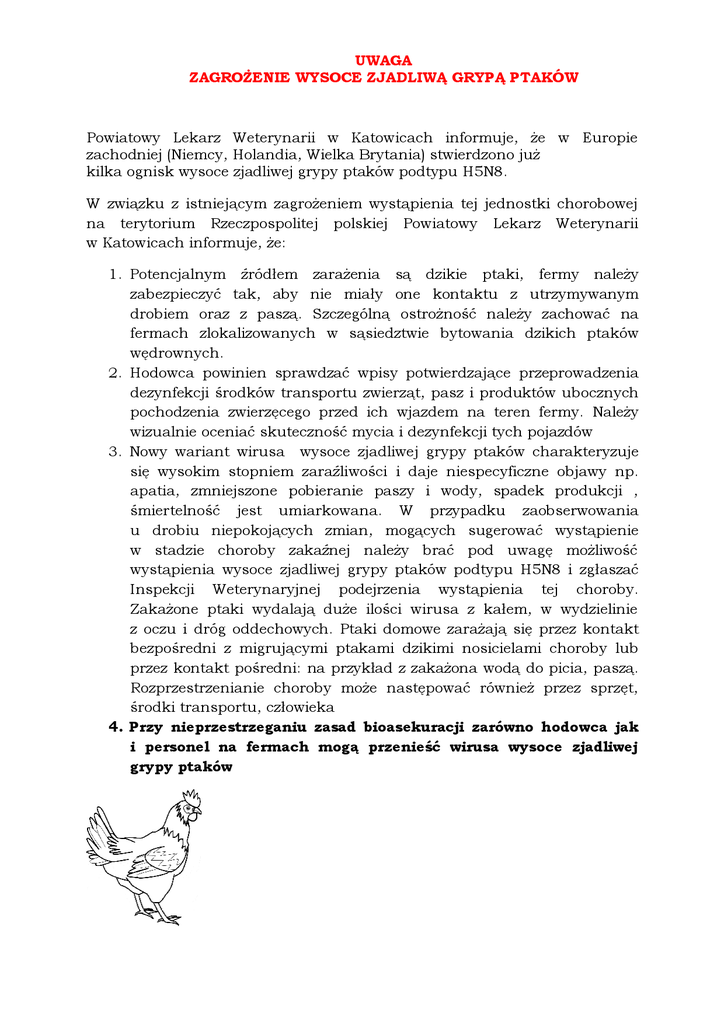 UWAGA ZAGROŻENIE WYSOCE ZJADLIWĄ GRYPĄ PTAKÓW Powiatowy Lekarz Weterynarii w Katowicach informuje, że w Europie zachodniej (Niemcy, Holandia, Wielka Brytania) stwierdzono już kilka ognisk wysoce zjadliwej grypy ptaków podtypu H5N8. W związku z istniejącym zagrożeniem wystąpienia tej jednostki chorobowej na terytorium Rzeczpospolitej polskiej Powiatowy Lekarz Weterynarii w Katowicach informuje, że: 1. Potencjalnym źródłem zarażenia są dzikie ptaki, fermy należy zabezpieczyć tak, aby nie miały one kontaktu z utrzymywanym drobiem oraz z paszą. Szczególną ostrożność należy zachować na fermach zlokalizowanych w sąsiedztwie bytowania dzikich ptaków wędrownych. 2. Hodowca powinien sprawdzać wpisy potwierdzające przeprowadzenia dezynfekcji środków transportu zwierząt, pasz i produktów ubocznych pochodzenia zwierzęcego przed ich wjazdem na teren fermy. Należy wizualnie oceniać skuteczność mycia i dezynfekcji tych pojazdów 3. Nowy wariant wirusa wysoce zjadliwej grypy ptaków charakteryzuje się wysokim stopniem zaraźliwości i daje niespecyficzne objawy np. apatia, zmniejszone pobieranie paszy i wody, spadek produkcji , śmiertelność jest umiarkowana. W przypadku zaobserwowania u drobiu niepokojących zmian, mogących sugerować wystąpienie w stadzie choroby zakaźnej należy brać pod uwagę możliwość wystąpienia wysoce zjadliwej grypy ptaków podtypu H5N8 i zgłaszać Inspekcji Weterynaryjnej podejrzenia wystąpienia tej choroby. Zakażone ptaki wydalają duże ilości wirusa z kałem, w wydzielinie z oczu i dróg oddechowych. Ptaki domowe zarażają się przez kontakt bezpośredni z migrującymi ptakami dzikimi nosicielami choroby lub przez kontakt pośredni: na przykład z zakażona wodą do picia, paszą. Rozprzestrzenianie choroby może następować również przez sprzęt, środki transportu, człowieka 4. Przy nieprzestrzeganiu zasad bioasekuracji zarówno hodowca jak i personel na fermach mogą przenieść wirusa wysoce zjadliwej grypy ptaków