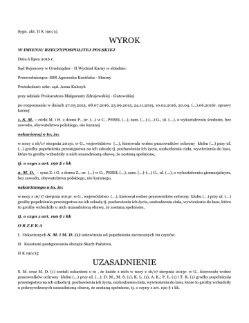 Sygn. akt. II K 190/15 WYROK W IMIENIU RZECZYPOSPOLITEJ POLSKIEJ Dnia 6 lipca 2016 r. Sąd Rejonowy w Grudziądzu - II Wydział Karny w składzie: Przewodnicząca: SSR Agnieszka Kucińska - Stanny Protokolant: sekr. sąd. Anna Kulczyk przy udziale Prokuratora Małgorzaty Zdrojewskiej - Gutowskiej po rozpoznaniu w dniach 27.05.2015, 08.07.2016, 23.09.2015, 24.11.2015, 10.02.2016, 20.04. (...).06.2016r. sprawy karnej 1. S. M. – córki M. i H. z domu P., ur. (...) w C., PESEL (...), zam. (...)-(...) G., ul. (...), o wykształceniu średnim, bez zawodu, obywatelstwa polskiego, nie karanej oskarżonej o to, że: w nocy z 16/17 sierpnia 2013r. w G., województwo (...), kierowała wobec pracowników ochrony klubu (...) przy ul. (...) groźby popełnienia przestępstwa na ich szkodę tj. pozbawienia ich życia, uszkodzenia ciała, wywiezienia do lasu, które to groźby wzbudziły u nich uzasadnioną obawę, że zostaną spełnione, tj. o czyn z art. 190 § 1 kk 2. M. D. – syna Z. i G. z domu Z., ur. (...) w G., PESEL (...), zam. (...)-(...) G., ul. (...), o wykształceniu gimnazjalnym, bez zawodu, obywatelstwa polskiego, nie karanego, oskarżonego o to, że: w nocy z 16/17 sierpnia 2013r. w G., województwo (...), kierował wobec pracowników ochrony klubu (...) przy ul. (...) groźby popełnienia przestępstwa na ich szkodę tj. pozbawienia ich życia, uszkodzenia ciała, wywiezienia do lasu, które to groźby wzbudziły u nich uzasadnioną obawę, że zostaną spełnione, tj. o czyn z art. 190 § 1 kk ORZEKA I. Oskarżonych S. M. i M. D. (1) uniewinnia od popełnienia zarzucanych im czynów. II. Kosztami postępowania obciąża Skarb Państwa. II K 190/15 UZASADNIENIE S. M. oraz M. D. (1) zostali oskarżeni o to , że każde z nich w nocy z 16/17 sierpnia 2013r. w G., kierowało wobec pracowników ochrony klubu (...) przy ul. (...): D. M., M. S. (1), K. L. (1), A. K.; P. Ł. (1) i T. K. (1) groźby popełnienia przestępstwa na ich szkodę tj. pozbawienia ich życia, uszkodzenia ciała, wywiezienia do lasu, które to groźby wzbudziły u pokrzywdzonych uzasadnioną obawę, że zostaną spełnione, tj. o czyny z art. 190 § 1 kk. W przedmiotowej sprawie Sąd ustalił następujący stan faktyczny. Wszyscy pokrzywdzeni w 2013r. pracowali dla (...) i (...). Praca polegała na wykonywaniu obowiązków ochroniarza w klubach i dyskotekach w okolicy, w zależności od zlecenia. W piątek – 16 sierpnia 2013r. zajmowali się ochroną w klubie (...) w G. przy ul. (...). Przełożonym ochroniarzy w tym dniu był D. M.. Ochroniarze mieli charakterystyczne ubrania wyróżniające ich z tłumu, białe koszule i czarne spodnie. Mieli do dyspozycji dwa duże pojemniki z gazem pieprzowym, które mogli użyć dla stłumienia agresywnych uczestników imprezy. Miejscem ich pracy był klub. Poza klubem nie wykonywali obowiązków służbowych. W dniu 16 sierpnia 2013r. dyskoteka w C. (...) w G. zaczynała się jak zwykle o godz. 21.00. /dowód: zeznania M. S. (1) – 168-171,507-508 Zeznania K. L. (1) – k. 192-194,209-210, Zeznania T. K. (1) – k. 893-895 Zeznania P. Ł. (1) – k. 217-218 Zeznania D. M. – k. 62-68 Zeznania A. K. – k. 184-187 Zeznania K. M. (1) – k. 589-591 Zeznania D. P. (1) – k.214-215 Umowa - k.7-11/ W dniu 16 sierpnia 2013r. K. W. umówił się ze swoimi znajomymi na wieczór do lokalu C. (...) w G.. Około godziny 23.00 młodzi mężczyźni udali się do tej dyskoteki. Tam czekały już na nich, umówione z nimi koleżanki S. M., K. J. i M. Ż.. Cała grupa młodzieży bawiła się w lokalu. Nie doszło między nimi do żadnej scysji czy nieporozumień. W stosunku do żadnej tych osób nie interweniowała w żadnym momencie ochrona. /dowód: zeznania K. W. – k. 87-88,94-95, Zeznania M. Ż. – k. 808 Zeznania K. O. – k. 96-97, 639-640 Zeznania K. J. – k. 103-104,518v-519/ Po północy część gości dyskoteki zaczęła wychodzić na zewnątrz. Stawali w grupkach na schodach do dyskoteki i poniżej tych schodów, w okolicy chodnika i ul. (...). W pewnym momencie doszło między K. W. a nieznanym chłopakiem do szarpaniny. Następnie K. W. wraz z kolegami zaczęli symulować ciosy, podskakiwać, uderzać nogami w powietrzu markując atak. Wówczas ktoś powiadomił ochronę o sytuacji przed lokalem. D. P. (1) podjął decyzje interwencji poza lokalem. Z lokalu wybiegli ochroniarze T. K. (1), D. M., P. Ł. (1) i M. S. (1). M. S. (1) miał ze sobą butlę z gazem pieprzowym, który został rozpylony. Mężczyźni chcieli uspokoić grupę osób, w których wzrastała agresja. Na jakiś czas grupa z W. zaprzestała działań, gdyż ulicą w pobliżu lokalu przejechał radiowóz. Pracownicy ochrony udali się na swoje stałe miejsca w dyskotece. Po około pół godzinie min. do T. K. (1) dotarł komunikat radiowy, że ci sami młodzi „znów zaczynają rozrabiać”. Wybiegł z lokalu do pomocy pozostałym kolegom z ochrony. W tym czasie D. M. i M. S. (1) rozdzielali szarpiące się osoby. T. K. (2) podszedł do innej grupy i próbował „rozpychać” jej uczestników. Uderzył go w twarz K. W.. M. S. (1), widząc całą sytuację, przyszedł T. K. z pomocą. Przewrócił K. W. i użył wobec niego chwytów obezwładniających. Ten upadł i nie podnosił się . Widząc to ochroniarze wezwali karetkę. Znajomi K. W., min. M. D. (1) i B. B. (1) widząc nieprzytomnego kolegę, zaczęli odpychać T. K. i M. S. od leżącego. Przy tym wyzywali pracowników ochrony i kierowali do nich w wulgarny sposób groźby pobicia i zabicia. W trakcie zajścia ponownie użyto gazu obezwładniającego. Cześć z grupy broniącej W. przed ochroniarzami trzymała się za twarze. W pewnym momencie K. W. wstał. On także zaczął się ochroniarzom wygrażać. Przyjechała karetka pogotowia i zabrała K. W.. Chwilę potem przyjechały radiowozy policyjne. B. B. (1) i M. D. (1) zostali przekazani przez ochroniarzy policjantom. W trakcie bójki, jak to wykazały przeprowadzone potem badania, K. W. 