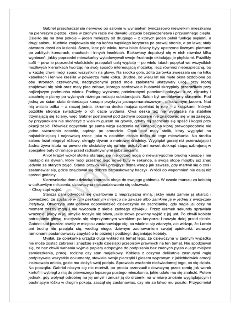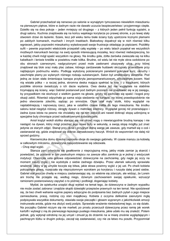 Gabriel przechadzał się nerwowo po salonie w wynajętym tymczasowo niewielkim mieszkaniu na pierwszym piętrze, które w żadnym razie nie dawało uczucia bezpieczeństwa i przyjemnego ciepła. Dzieliło się na dwa pokoje – jeden mniejszy od drugiego – z których jeden pełnił funkcję sypialni, a drugi salonu. Kuchnia znajdowała się na końcu wąskiego korytarza po prawej stronie, a po lewej stały otworem drzwi do łazienki. Szare, lecz pół wieku temu białe ściany były upstrzone licznymi plamami po zabitych komarach, muchach i innych insektach. Białowłosy dopatrzył się w nich również kilku wgnieceń, jakby poprzedni mieszkańcy wyładowywali swoje frustracje okładając je pięściami. Pożółkły sufit – pewnie poprzedni właściciele przepalali całą wypłatę – po wielu latach popękał we wszystkich możliwych kierunkach tworząc na swój sposób interesującą mozaikę, lecz również niebezpieczną, bo w każdej chwili mógł spaść wszystkim na głowy. Na środku goła, żółta żarówka zwieszała się na kilku kabelkach i leniwie kreśliła w powietrzu małe kółka. Brudne, od wielu lat nie myte okna ozdobione po obu stronach czerwonymi, nadgryzionymi przed mole zasłonami ukazywały ulicę, przy której znajdował się blok oraz mały plac zabaw, którego zardzewiałe huśtawki skrzypiały przeraźliwie przy najlżejszym podmuchu wiatru. Podłogę wyłożoną pościeranymi panelami pokrywał kurz, okruchy i zaschnięte plamy po wylanych różnego rodzaju substancjach. Salon był umeblowany skromnie. Pod jedną ze ścian stała śmierdząca kanapa przykryta jasnopomarańczowym, sfilcowanym kocem. Nad nią wisiała półka – a raczej jedna, skromna deska mająca spełniać tę rolę – z książkami, których pożółkłe stronice świadczyły o ich dacie wydania. Owa deska też nie wyglądała na stabilnie trzymającą się ściany, więc Gabriel postanowił pod żadnym pozorem nie znajdować się w jej zasięgu, by przypadkiem nie skończyć z wielkim guzem na głowie, gdyby tej zachciało się spaść i kogoś przy okazji zabić. Również odpychała go sama wizja siedzenia na kanapie, na której prawdopodobnie nie jedno stworzenie zdechło, sądząc po smrodzie. Obok stał mały stolik, który wyglądał na najstabilniejszą i najnowszą rzecz, jaka w ostatnim czasie trafiła do tego mieszkania. Na środku salonu leżał niegdyś różowy, okrągły dywan o metrowej średnicy. Wyglądał gorzej niż przerażająco i żadna żywa istota na pewno nie chciałaby się na nim położyć ani nawet dotknąć stopą uzbrojoną w specjalne buty chroniące przed radioaktywnymi substancjami. Anioł krążył wokół stolika starając się nie otrzeć nogą o niewiarygodnie brudną kanapę i nie nastąpić na dywan, który mógł przeżreć jego nowe buty w sekundę, a swoją stopę mógłby już znać jedynie ze starych zdjęć. Stanął przy oknie i przygryzł dolną wargę jak zawsze, gdy martwił się o coś i zastanawiał się, gdzie znajdował się dobrze zamaskowany haczyk. Wrócił do wspomnień nie dalej niż sprzed godziny. Kierowniczka domu dziecka zaprosiła oboje do swojego gabinetu. W czasie marszu za kobietą w całkowitym milczeniu, dziewczyna niespodziewanie się odezwała. - Chcę stąd wyjść. Starsza pani odwróciła się gwałtownie z nieprzyjazną miną, jakby miała zamiar ją skarcić i powiedzieć, że zostanie w tym paskudnym miejscu na zawsze albo zamknie ją w jednej z wieżyczek instytucji. Otworzyła usta gotowa odpowiedzieć dziewczynie na zachciankę, gdy nagle jej oczy na moment zaszły mgłą i nie wydobyła z siebie żadnego dźwięku. Przez ułamek sekundy sprawiała wrażenie, jakby w jej umyśle toczyła się bitwa, jakie słowa powinny wyjść z jej ust. Po chwili kobieta potrząsnęła głową, rozejrzała się nieprzytomnym wzrokiem po korytarzu i ruszyła dalej przed siebie. Gabriel stał jeszcze chwilę w miejscu zastanawiając się, co właśnie się zdarzyło, ale widząc, że Lorein ani trochę nie przejęła się, według niego, dziwnym zachowaniem swojej opiekunki, wzruszył ramionami postanowiwszy zapytać o to później i podbiegł, doganiając kobiety. Myślał, że opiekunka urządzi długi wykład na temat tego, że dziewczyna w żadnym wypadku nie może zostać zabrana i znajdzie skądś dziesiątki przepisów prawnych na ten temat. Nie spodziewał się, że bez chwili wahania wyjmie papiery adopcyjne do podpisania bez żadnych pytań o jego miejsce zamieszkania, pracę, rodzinę czy stan majątkowy. Kobieta z oczyma delikatnie zasnutymi mgłą podpisywała wszystkie dokumenty, stawiała swoje pieczątki i głosem wypranym z jakichkolwiek emocji instruowała anioła, gdzie ma złożyć swój podpis. Sprawiała wrażenie nieświadomej tego, co się działo. Na początku Gabriel niczym się nie martwił, po prostu przerzucił dziewczynę przez ramię jak worek kartofli i wybiegł z nią do pierwszego lepszego pustego mieszkania, jakie udało mu się znaleźć. Potem jednak, gdy wpłynął odrobinę na jej umysł i zmusił ją do drzemki na w miarę znośnie wyglądającym i pachnącym łóżku w drugim pokoju, zaczął się zastanawiać, czy nie za łatwo mu poszło. Przypomniał sobie dziwne zachowanie starszej kobiety. Chciał zrzucić winę na jej wiek, ponieważ wtedy często zdarzają się zaniki pamięci czy podobna chwilowa dezorientacja, ale nie potrafił w to uwierzyć, szczególnie pamiętając słowa Lorein wypowiedziane parę sekund wcześniej przed dziwną reakcją opiekunki. Nagle obok anioła pojawił się otoczony piekielnymi płomieniami Faris – jego diaboliczne lustrzane odbicie. Jak to z lustrami bywa, wszystko było u diabła na opak. Kruczoczarne, lśniące nawet w nikłym świetle żółtej, starej żarówki włosy z niebieskimi końcówkami sięgały mu do ramion. Błyszczące, niebieskie, głęboko osadzone oczy – jedyna pozostałość po poprzednim życiu w Niebie – patr
