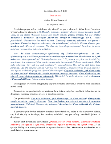 Mówione Słowo # 142 Dwa żniwa pastor Brian Kocourek 30 stycznia 2010 Dzisiejszego poranka chciałbym się skupić na paru słowach, które brat Branham wypowiedział w akapicie 145 Moureh, moureh – wczesny deszcz, deszcz zasiewu spadł. Otóż, co się stało? Wczesny deszcz już spadł. Spadł późny deszcz. Co się stało? Sodoma i Sodomici spłonęli! Abraham otrzymał obiecanego syna. Jezus powiedział: "Pozwólcie im róść razem. Chwasty zostaną zebrane, związane i spalone. Pszenica będzie zabrana, do spichlerza", widzicie. Późny deszcz jest właśnie tuż. My go otrzymamy. Nie chcę się tym długo zajmować, bo wiem, że mam tutaj coś rzeczywiście dobrego, widzicie. 146 Te dwie denominacje zjednoczą się. Zielonoświątkowcy i ci inni zjednoczą się, ale Słowo pozostanie z obiecanym nasieniem Abrahama, tak jak wówczas. Jezus powiedział: "Jako było wówczas..." Czy macie uszy ku słuchaniu? Czy macie oczy ku patrzeniu? Czy macie rozum, aby to zrozumieć? Jezus powiedział: "Jako było wówczas. Czy tak nie jest napisane" - powiedziałby On, gdyby stał tutaj tego poranka. Czy On nie powiedział: "Czy nie jest napisane, że jako było w dniach Sodomy, tak będzie w dniach przyjścia Syna Człowieczego?" Czy nie widzicie, jak dorastają te dwa żniwa? Otrzymują swoje ostatnie opady deszczu. One dochodzą na skutek ostatnich opadów przelotnych. Widzicie? Co stało się wówczas? Aniołowie i Pan oddalili się. Potem nastał deszcz. Dzisiejszego wieczora przyjrzymy się tym dwiema żniwom, o których brat Branham mówi tutaj. Zauważcie, on powiedział, że nastaną dwa żniwa, więc by rozróżnić jedno żniwo od drugiego, musimy wiedzieć więcej o każdym żniwie. On powiedział: Czy nie widzicie, jak dorastają te dwa żniwa? Otrzymują swoje ostatnie opady deszczu. One dochodzą na skutek ostatnich opadów przelotnych. Widzicie? Co stało się wówczas? Aniołowie i Pan oddalili się. Potem nastał deszcz. Z powodu tych dwóch zbiorów musimy dowiedzieć się, które z ich atrybutów różnią się, i okażą się u każdego, bo musimy wiedzieć, czy potrafimy rozróżnić jeden od drugiego. Kiedy brat Branham powiedział: „Pozwólcie im róść razem. Chwasty zostaną zebrane, związane i spalone. Pszenica będzie zabrana, do spichlerza…” on cytuje Biblię, a w rzeczywistości on cytuje Jezusa z Ew. Mateusza rozdziału 13 – podobieństwo o siewcy. Ew. Mateusza 13:24 Inne podobieństwo podał im, mówiąc: Podobne jest Królestwo Niebios do człowieka, który posiał dobre nasienie na swojej roli. 25 A kiedy ludzie spali, przyszedł jego nieprzyjaciel i nasiał kąkolu między pszenicę, i odszedł. 26 A gdy zboże podrosło i wydało owoc, wtedy się pokazał i kąkol. 27 Przyszli więc słudzy gospodarza i powiedzieli mu: Panie, czy nie posiałeś dobrego nasienia na swojej roli? Skąd więc ma ona kąkol? 28 A on im rzekł: To nieprzyjaciel uczynił. A słudzy mówią do niego: Czy chcesz więc, abyśmy poszli i wybrali go? 29 A on odpowiada: Nie! Abyście czasem wybierając kąkol, nie powyrywali wraz z nim i pszenicy. 30 Pozwólcie obydwom róść razem aż do żniwa. A w czasie żniwa powiem żeńcom: Zbierzcie najpierw kąkol i powiążcie go w snopki na spalenie, a pszenicę zwieźcie do mojej stodoły. Zwróćcie uwagę, Jezus wskazuje na ten fakt, że są dwa odróżniające się typy (nasienia życia), które zostały zasiane lub zasadzone obok siebie na tym samym polu. Jest parę faktów, które są podane nam, abyśmy zrozumieli to podobieństwo i stan czasu końca. Najpierw Jezus mówi nam, że pole przedstawia świat, a posiew jest wykonany najpierw przez właściciela pola, a potem przychodzi jego nieprzyjaciel i podrabia jego posiew, lecz z innym życiem (nasieniem). Fakty tego podobieństwa są następujące: 1) Istnieje jedno pole, gdzie nasienie jest zasiane, to znaczy kobieta; my jesteśmy uprawną rolą. 2) Istnieją dwaj, którzy sieją nasienie, ci dwaj, którzy sieją, reprezentują dwa źródła życia. 3) Nasienie, które jest posiane – jest powiedziane, że to są dwa różne nasiona, stąd manifestacja dwóch innych rodzajów życia, które manifestują dwie różne natury. Pszenica i kąkol. 4) Nasienie kąkolu nie należało tam, dopóki nieprzyjaciel nie przyszedł na pole, które nie było jego, ale jest dozwolone mu róść między pszenicą do czasu żniwa, z powodu pszenicy, dopóki pszenica nie dojrzeje na tyle, by przetrwać oddzielenie. 5) Każdy rodzaj nasienia ma inną formę żniwa. 6) W czasie żniwa ma rozpocząć się oddzielenie. 7) Jedno żniwo przedstawione jest jako związanie kąkolu w snopki, a te są przeznaczone na spalenie. 8) Żniwo Pszenicy jest zidentyfikowane nie przez związanie w snopki, ale jest raczej zebrane w takim stanie, w jakim jest i zwiezione do spichlerza albo magazynu właściciela. Zauważcie, te dwa nasiona mają dwa odróżniające się żniwa i jest dozwolone im róść obok siebie aż do czasu, kiedy nastanie żniwo. Potem w czasie żniwa nastanie oddzielenie. Pierwsze żniwo rozpoczyna się od kąkolu, który jest związany w snopki na spalenie. W tym podobieństwie Jezus używa słowo „deo”, aby opisać proces wiązania kąkolu, a to słowo „deo” oznacza: związać przez zobowiązanie. Związanie jest potrzebne do tego, aby kierować zgromadzeniem kąkolu. A przez narzucenie ludziom obowiązków, które odprowadzają ich od Słowa Bożego, a umieszczają ich do systemu organizacyjnego, możemy widzieć, że organizacja jest narzędziem, które jest pomocne do tego, aby nastało to żniwo. Oni są związani albo zobowiązani, a więc ich centrum staje się to, do czego zostali zobowiązani. Te powiązania, powiedział Jezus, wiążą ludzi, powstrzymując ich od dalszego poszukiwania światła, które jest większe niż to, które jest dostępne w ich kościele. Pamiętajcie, brat Branham powiedział: Te dwie denominacje zjednoczą się. Zielonoświątkowcy i ci i