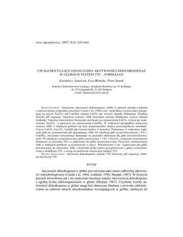Acta Agrophysica, 2007, 9(3), 635-644 UWAGI DOTYCZĄCE OZNACZANIA AKTYWNOŚCI DEHYDROGENAZ W GLEBACH TESTEM TTC – FORMAZAN Kazimierz Januszek, Ewa Błońska, Piotr Stanik Katedra Gleboznawstwa Leśnego, Akademia Rolnicza im. H. Kołłątaja Al. 29 Listopada 46, 31-425 Kraków e-mail: [email protected] S t r e s z c z e n i e . Oznaczono aktywności dehydrogenaz (ADh) w glebach metodą Lenharda z zastosowaniem oryginalnej procedury Casida i in. (1964) oraz modyfikacji tej procedury polegającej na uŜyciu Na2CO3 lub Ca(OH)2 zamiast CaCO3 jak równieŜ metodą Thalmanna. Zbadano równieŜ pH suspensji. NajniŜsze wartości ADh otrzymano metodą Thalmanna, wyŜsze metodą Lenharda. NajniŜsze koncentracje formazanu otrzymano po zastosowaniu CaCO3, wyŜsze po zastosowaniu Na2CO3 , a najwyŜsze po zastosowaniu Ca(OH)2. W większości przypadków oznaczone wartości ADh w badanych glebach nie były proporcjonalne między poszczególnymi metodami. UŜycie CaCO3, Na2CO3, Ca(OH) jak równieŜ buforu w metodzie Thalmanna, w większości badanych gleb nie gwarantowało pH optymalnego ADh. Po inkubacji gleb wysterylizowanych z TTC i Ca(OH)2, otrzymano koncentracje formazanu na poziomie zbliŜonym dla gleb niewysterylizowanych. Po inkubacji wysterylizowanej gleby piaszczystej z TTC i Na2CO3, oznaczono koncentracje formazanu na poziomie 26% w odniesieniu do gleby niesterylizowanej. Przyczyny zróŜnicowanej ADh w badanych próbkach są dyskutowane w pracy. Wnioskowano o nie regulowanie pH gleby przeznaczonej do oznaczania ADh, a kontrolne próby naleŜy przygotowywać z gleby wysterylizowanej z dodatkiem TTC, z uwagi na moŜliwość chemicznej redukcji TTC. S ł o w a k l u c z o w e : aktywność dehydrogenaz, metody TTC-formazan, pH suspensji, redukcja chemiczna TTC WSTĘP Aktywność dehydrogenaz w glebie jest uŜywana jako miara całkowitej aktywności mikrobiologicznej (Casida i in. 1964, Lenhard, 1956, SkujiĦš, 1967). W licznych pracach stwierdzono jak i nie znaleziono korelacji między aktywnością dehydrogenaz a ogólną liczbą mikroorganizmów w glebie (SkujiĦš, 1967). Uzyskane wyniki aktywności dehydrogenaz w glebie mogą być obarczone błędami z powodu oddziaływania na substrat innych oksydoreduktaz występujących w glebie, zdolnych do 636 K. JANUSZEK i in. redukcji TTC a nie biorących udziału w transporcie elektronów (Alef 1995), obecności w glebie azotanów (SkujiĦš, 1967), zwiazków Fe2+ (Stępniewska 1987) lub zawartości takich związków organicznych jak katechol (SkujiĦš, 1967). Jednym z warunków oznaczenia aktywności enzymatycznej jest zapewnienie optymalnego pH dla aktywności poszczególnych enzymów. Maksymalną aktywność dehydrogenaz Brzezińska i in. (2001) zaobserwowali przy pH in situ w zakresie wartości od 6,6 do 7,2. Trevors (1984) na podstawie własnych badań stwierdza, Ŝe aktywność dehydrogenaz zmniejsza się w miarę obniŜania pH próbek gleby od początkowej wartości 7,7. Według von Mersi i Schinnera (1991) optymalne aktywności dehydrogenaz są przy pH 7-7,5. Celem pracy było zbadanie czy uŜycie Na2CO3, jako peptyzatora koloidów, zamiast CaCO3 jako koagulatora koloidów, w jednej z najczęściej stosowanych procedur do oznaczania aktywności dehydrogenaz w glebie (Casida i in. 1964), spowoduje istotną zmianę w oznaczonych wartościach aktywności dehydrogenaz w glebach. Dla porównania oznaczono aktywności dehydrogenaz w badanych próbkach gleb metodą Thalmanna (Alef 1995) w której to metodzie stosowany jest bufor Tris-HCl. Innym celem było zbadanie pH suspensji glebowych przygotowanych do oznaczania aktywności dehydrogenaz metodą Lenharda (1956) i Thalmanna (1968) jak równieŜ próba zbadania ewentualnej redukcji TTC na drodze chemicznej oraz aktywności dehydrogenaz w glebach bez uŜycia soli modyfikujących pH. MATERIAŁ I METODY Aktywność dehydrogenaz (ADh) oznaczono w próbkach pobranych we wrześniu z poziomów próchnicznych (próchniczno-eluwialnych): piaszczystych gleb bielicowych (próbki nr 2-4,14), piaszczystych gleb rdzawych (próbka nr 1), pyłowych gleb płowych (próbki nr 5, 7, 8), gliniasto-pylastych gleb brunatnych (próbki nr 6, 10, 11, 16), rędziny (próbka nr 9), pyłowej gleby deluwialnej próchnicznej (próbka nr 15), oraz gleb murszowych (próbki nr 12 i 13), z terenów leśnych w sąsiedztwie Krakowa. Aktywność dehydrogenaz oznaczano w próbkach gleb o naturalnej wilgotności metodą Lenharda z zastosowaniem procedury Casida i in.(1964), oraz modyfikacją tej procedury, polegającej na uŜyciu Na2CO3 lub Ca(OH)2 zamiast CaCO3 (w ilości molarnie równowaŜnej) a takŜe metodą Thalmanna (Alef 1995). Ponadto, w próbkach gleb powietrznie suchych, oznaczono podstawowe właściwości badanych gleb (tab. 1), metodami powszechnie stosowanymi w gleboznawstwie (Ostrowska i in. 1991). W celu zbadania redukcji TTC na drodze chemicznej oznaczono koncentrację formazanu w próbkach gleb (nawaŜki po 6g) po sterylizacji w autoklawie w tem- Tabela 1. Niektóre właściwości badanych gleb Table 1. Some properties of investigated soils pH Y S Th Nr próbki Sample number C org. Org. C N og. Total N V% C/N Procent frakcji o średnicy (mm) % of fractions of diameter, in mm Wilgotność gleby w % wagowych Moisture soil in % weight 0,050,002 <0,002 16,03 11,57 11 11 1 3 42,4 32,4 1,53 0,79 18,41 16,61 6 8 3 3 42,3 33,5 0,34 0,36 6,05 4,06 17,63 11,2 47 50 4 19 82,4 76,8 10,7 18,8 0,38 0,29 6,19 4,92 16,45 17,13 54 25 7 7 78,6 94,5 n.o. 49,91 n.o. 64,92 0,22 0,68 2 6,83 9,31 10,12 47 37 18 38 61,6 95,0 12,04 77,72 34,92 100,8 34,48 77,1 0,4 1,38 4,3 18,82 10,78 13,59 45 n.o. 29 n.o. 83,7 126,3 67,2 8 2,7 94,32 0,9 24,7 161,5 8,9 27,4 58,4 10,1 90,1 2,02 0,114 0,285 29,35 1,81 2,98 14,51 15,9 10,5 n.o. 5 74 n.o. 4 14 213,6 10,2 22,28 12 24,7 36,7 67,3 0,465 5,26 11,3 56 20 28,89 cmol(+) kg-1 H2O KCl % 1 2 5,9 3,8 4,7 2,9 4,25 4,59 4,1 0,1 8,35 4,69 49,1 2,1 0,1 0,04 1,53 0,42 3 4 4 3,9 2,9 2,8 6,69 4,23 0,28 0,1 6,