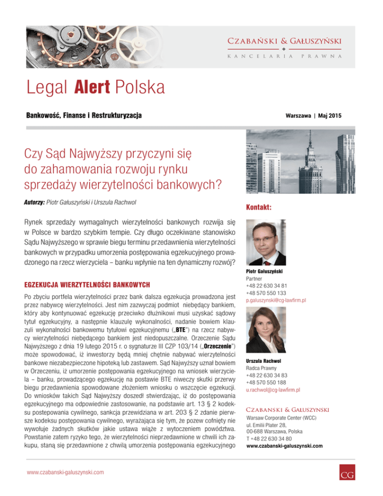 Legal Alert Polska Bankowość, Finanse i Restrukturyzacja Warszawa | Maj 2015 Czy Sąd Najwyższy przyczyni się do zahamowania rozwoju rynku sprzedaży wierzytelności bankowych? Autorzy: Piotr Gałuszyński i Urszula Rachwol Kontakt: Rynek sprzedaży wymagalnych wierzytelności bankowych rozwija się w Polsce w bardzo szybkim tempie. Czy długo oczekiwane stanowisko Sądu Najwyższego w sprawie biegu terminu przedawnienia wierzytelności bankowych w przypadku umorzenia postępowania egzekucyjnego prowadzonego na rzecz wierzyciela – banku wpłynie na ten dynamiczny rozwój? EGZEKUCJA WIERZYTELNOŚCI BANKOWYCH Po zbyciu portfela wierzytelności przez bank dalsza egzekucja prowadzona jest przez nabywcę wierzytelności. Jest nim zazwyczaj podmiot niebędący bankiem, który aby kontynuować egzekucję przeciwko dłużnikowi musi uzyskać sądowy tytuł egzekucyjny, a następnie klauzulę wykonalności, nadanie bowiem klauzuli wykonalności bankowemu tytułowi egzekucyjnemu („BTE”) na rzecz nabywcy wierzytelności niebędącego bankiem jest niedopuszczalne. Orzeczenie Sądu Najwyższego z dnia 19 lutego 2015 r. o sygnaturze III CZP 103/14 („Orzeczenie”) może spowodować, iż inwestorzy będą mniej chętnie nabywać wierzytelności bankowe niezabezpieczone hipoteką lub zastawem. Sąd Najwyższy uznał bowiem w Orzeczeniu, iż umorzenie postępowania egzekucyjnego na wniosek wierzyciela – banku, prowadzącego egzekucję na postawie BTE niweczy skutki przerwy biegu przedawnienia spowodowane złożeniem wniosku o wszczęcie egzekucji. Do wniosków takich Sąd Najwyższy doszedł stwierdzając, iż do postępowania egzekucyjnego ma odpowiednie zastosowanie, na podstawie art. 13 § 2 kodeksu postepowania cywilnego, sankcja przewidziana w art. 203 § 2 zdanie pierwsze kodeksu postępowania cywilnego, wyrażająca się tym, że pozew cofnięty nie wywołuje żadnych skutków jakie ustawa wiąże z wytoczeniem powództwa. Powstanie zatem ryzyko tego, że wierzytelności nieprzedawnione w chwili ich zakupu, staną się przedawnione z chwilą umorzenia postępowania egzekucyjnego www.czabanski-galuszynski.com Piotr Gałuszyński Partner +48 22 630 34 81 +48 570 550 133 [email protected] Urszula Rachwol Radca Prawny +48 22 630 34 83 +48 570 550 188 [email protected] Warsaw Corporate Center (WCC) ul. Emilii Plater 28, 00-688 Warszawa, Polska T +48 22 630 34 80 www.czabanski-galuszynski.com Legal Alert Polska prowadzonego na rzecz banku – zbywcy wierzytelności, albo że czas na dochodzenie wierzytelności nieprzedawnionych znacznie się skróci. PRZEDAWNIENIE WIERZYTELNOŚCI BANKOWYCH I PRZERWANIE BIEGU PRZEDAWNIENIA W sprawie będącej podstawą wydania Orzeczenia bank, po uzyskaniu klauzuli wykonalności na bankowym tytule egzekucyjnym, wszczął postępowanie egzekucyjne przeciwko swojemu dłużnikowi. W jego trakcie, zbył dochodzoną wierzytelność funduszowi sekurytyzacyjnemu, a następnie cofnął wniosek o wszczęcie egzekucji przeciwko dłużnikowi zbytej wierzytelności, co doprowadziło do umorzenia postępowania egzekucyjnego. Doszło zatem do dwukrotnego przerwania biegu przedawnienia – po raz pierwszy, gdy bank złożył do sądu wniosek o nadanie klauzuli wykonalności BTE oraz ponownie, gdy bank złożył wniosek o wszczęcie egzekucji przeciwko dłużnikowi. Za ugruntowany i nie budzący kontrowersji należy bowiem uznać pogląd, zapoczątkowany uchwałą Sądu Najwyższego z dnia 16 stycznia 2004 r., III CZP 10/03, że zgłoszenie przez wierzyciela będącego bankiem wniosku do sądu o nadanie klauzuli wykonalności bankowemu tytułowi egzekucyjnemu przerywa bieg przedawnienia wierzytelności, która na podstawie tego tytułu ma być dochodzona. Nabywca wierzytelności mimo tego iż nabył od banku wierzytelność przed upływem trzech lat od dnia, w którym BTE nadano klauzulę wykonalności, to zainicjował działania mające na celu dochodzenie wierzytelności od dłużnika po upływie tego terminu. Jego wierzytelność została przez sąd uznana za przedawnioną, gdyż roszczenie z tytułu udzielonego kredytu, jako czynność dokonana w ramach prowadzonej przez bank działalności gospodarczej, podlega na podstawie art. 118 kodeksu cywilnego trzyletniemu terminowi przedawnienia, a powództwo o jej zasądzenie od dłużnika zostało oddalone. Sąd Najwyższy potwierdził w Orzeczeniu, iż skutek drugiego przerwania biegu przedawnienia został zniwelowany umorzeniem postępowania egzekucyjnego na skutek cofnięcia przez bank wniosku o wszczęcie egzekucji przeciwko dłużnikowi, po sprzedaży przez bank wierzytelności tego dłużnika. Termin przedawnienia w tej sprawie został zatem przerwany jedynie złożeniem wniosku o nadanie klauzuli wykonalności BTE, a ponownie rozpoczął on bieg w dniu nadania przez sąd klauzuli wykonalności temu tytułowi egzekucyjnemu. Nie można wykluczyć, że w znacznej liczbie spraw dochodzić będzie do sytuacji, w której inwestor będzie nabywał od banku nieprzedawnioną wierzytelność, która stanie się przedawniona z chwilą umorzenia postępowania egzekucyjnego na wniosek banku – zbywcy wierzytelności. Stanie się tak, gdy na wniosek banku postepowanie egzekucyjne zostanie umorzone po upływie trzech lat od dnia nadania klauzuli wykonalności BTE. Inwestor nie będzie wówczas dysponował żadnymi narzędziami do „przedłużenia” terminu przedawnienia nabytej wierzytelności poprzez doprowadzenie do ponownego przetrwania jej biegu przedawnienia. KONSEKWENCJE ORZECZENIA Orzeczenie ma dla inwestorów nabywających portfele wierzytelności bankowych niezabezpieczonych hipoteką lub zastawem istotne znaczenie i może doprowadzić do modyfikacji warunków funkcjonowania tego rynku w Polsce. Kluczowe stanie się zidentyfikowanie wierzytelności, które mogą stać się przedawnione z chwilą umorzenia postępowania egzekucyjnego na wniosek banku już na etapie badania due dilligence, poprzedzającego nabycie portfela