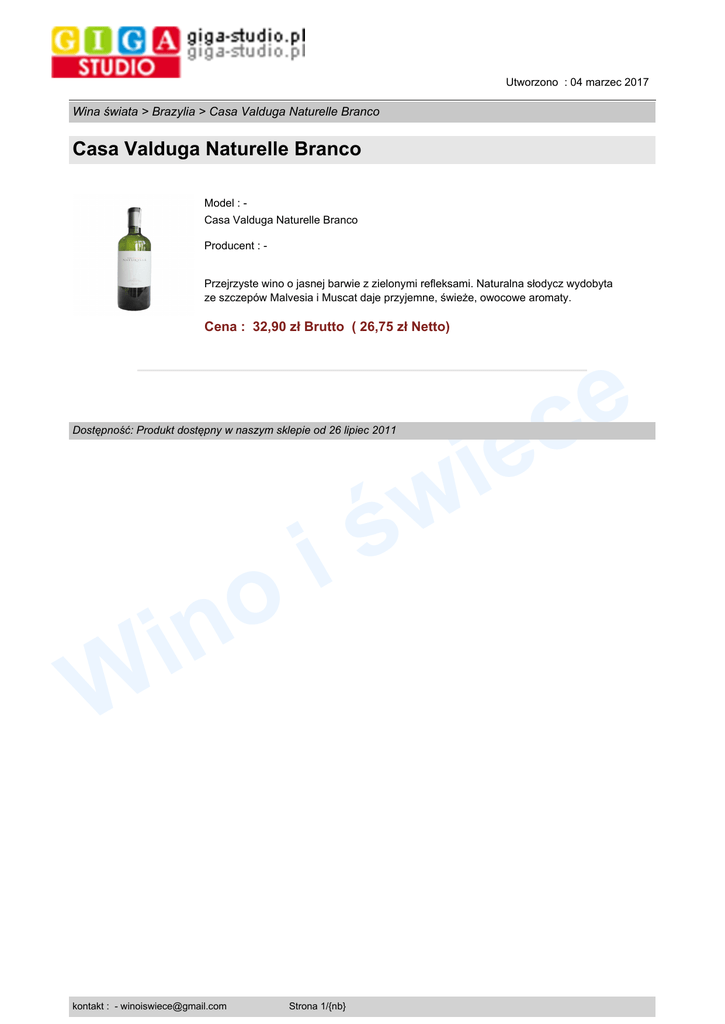 Utworzono : 04 marzec 2017 Wina świata > Brazylia > Casa Valduga Naturelle Branco Casa Valduga Naturelle Branco Model : Casa Valduga Naturelle Branco Producent : Przejrzyste wino o jasnej barwie z zielonymi refleksami. Naturalna słodycz wydobyta ze szczepów Malvesia i Muscat daje przyjemne, świeże, owocowe aromaty. Cena : 32,90 zł Brutto ( 26,75 zł Netto) W i o in kontakt : - [email protected] Strona 1/{nb} e c e i w ś Dostępność: Produkt dostępny w naszym sklepie od 26 lipiec 2011
