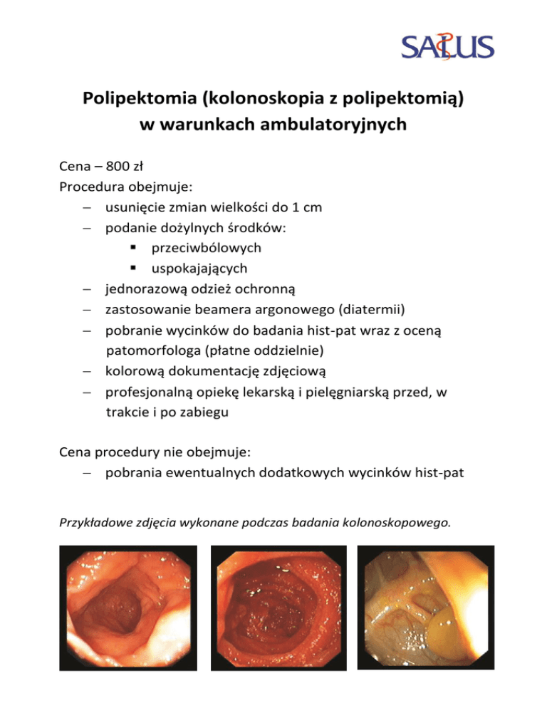 Polipektomia (kolonoskopia z polipektomią) w warunkach ambulatoryjnych Cena – 800 zł Procedura obejmuje: usunięcie zmian wielkości do 1 cm podanie dożylnych środków: przeciwbólowych uspokajających jednorazową odzież ochronną zastosowanie beamera argonowego (diatermii) pobranie wycinków do badania hist-pat wraz z oceną patomorfologa (płatne oddzielnie) kolorową dokumentację zdjęciową profesjonalną opiekę lekarską i pielęgniarską przed, w trakcie i po zabiegu Cena procedury nie obejmuje: pobrania ewentualnych dodatkowych wycinków hist-pat Przykładowe zdjęcia wykonane podczas badania kolonoskopowego.