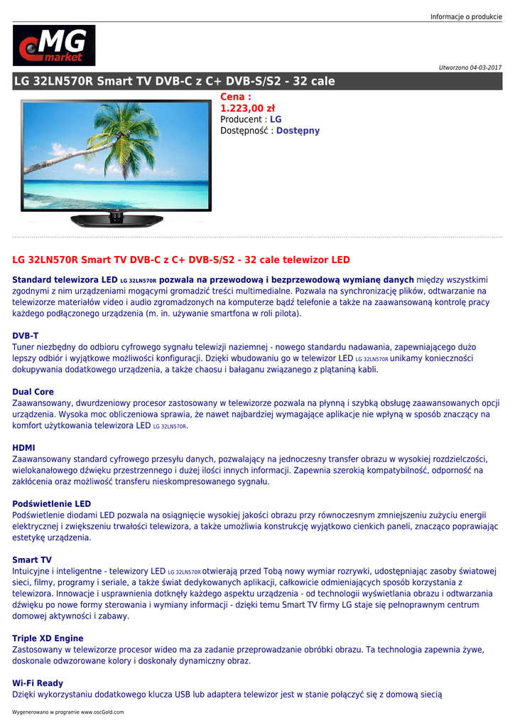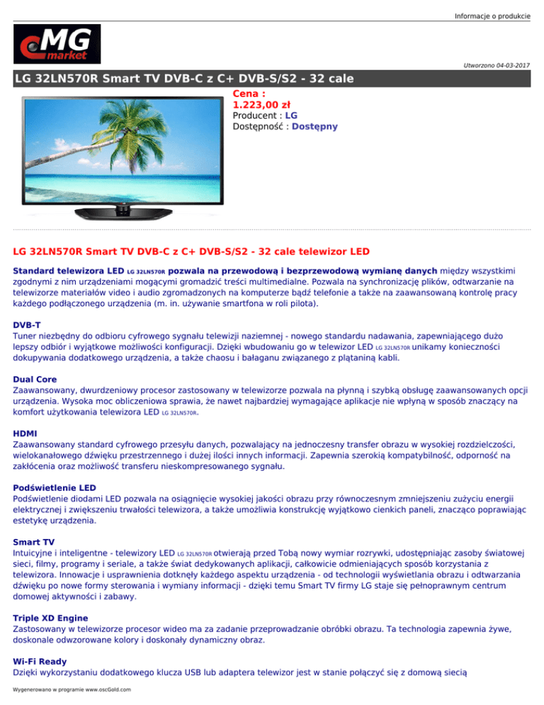 Informacje o produkcie Utworzono 04-03-2017 LG 32LN570R Smart TV DVB-C z C+ DVB-S/S2 - 32 cale Cena : 1.223,00 zł Producent : LG Dostępność : Dostępny LG 32LN570R Smart TV DVB-C z C+ DVB-S/S2 - 32 cale telewizor LED Standard telewizora LED LG 32LN570R pozwala na przewodową i bezprzewodową wymianę danych między wszystkimi zgodnymi z nim urządzeniami mogącymi gromadzić treści multimedialne. Pozwala na synchronizację plików, odtwarzanie na telewizorze materiałów video i audio zgromadzonych na komputerze bądź telefonie a także na zaawansowaną kontrolę pracy każdego podłączonego urządzenia (m. in. używanie smartfona w roli pilota). DVB-T Tuner niezbędny do odbioru cyfrowego sygnału telewizji naziemnej - nowego standardu nadawania, zapewniającego dużo lepszy odbiór i wyjątkowe możliwości konfiguracji. Dzięki wbudowaniu go w telewizor LED LG 32LN570R unikamy konieczności dokupywania dodatkowego urządzenia, a także chaosu i bałaganu związanego z plątaniną kabli. Dual Core Zaawansowany, dwurdzeniowy procesor zastosowany w telewizorze pozwala na płynną i szybką obsługę zaawansowanych opcji urządzenia. Wysoka moc obliczeniowa sprawia, że nawet najbardziej wymagające aplikacje nie wpłyną w sposób znaczący na komfort użytkowania telewizora LED LG 32LN570R. HDMI Zaawansowany standard cyfrowego przesyłu danych, pozwalający na jednoczesny transfer obrazu w wysokiej rozdzielczości, wielokanałowego dźwięku przestrzennego i dużej ilości innych informacji. Zapewnia szerokią kompatybilność, odporność na zakłócenia oraz możliwość transferu nieskompresowanego sygnału. Podświetlenie LED Podświetlenie diodami LED pozwala na osiągnięcie wysokiej jakości obrazu przy równoczesnym zmniejszeniu zużyciu energii elektrycznej i zwiększeniu trwałości telewizora, a także umożliwia konstrukcję wyjątkowo cienkich paneli, znacząco poprawiając estetykę urządzenia. Smart TV Intuicyjne i inteligentne - telewizory LED LG 32LN570R otwierają przed Tobą nowy wymiar rozrywki, udostępniając zasoby światowej sieci, filmy, programy i seriale, a także świat dedykowanych aplikacji, całkowicie odmieniających sposób korzystania z telewizora. Innowacje i usprawnienia dotknęły każdego aspektu urządzenia - od technologii wyświetlania obrazu i odtwarzania dźwięku po nowe formy sterowania i wymiany informacji - dzięki temu Smart TV firmy LG staje się pełnoprawnym centrum domowej aktywności i zabawy. Triple XD Engine Zastosowany w telewizorze procesor wideo ma za zadanie przeprowadzanie obróbki obrazu. Ta technologia zapewnia żywe, doskonale odwzorowane kolory i doskonały dynamiczny obraz. Wi-Fi Ready Dzięki wykorzystaniu dodatkowego klucza USB lub adaptera telewizor jest w stanie połączyć się z domową siecią Wygenerowano w programie www.oscGold.com bezprzewodową, co pozwala na osiągnięcie pełnej funkcjonalności związanej z wymianą danych i dostępem do sieci bez wykorzystania uciążliwych i wprowadzajacych chaos kabli. Symbol producenta Nazwa produktu Producent Klasa produktu Przekątna ekranu Technologia podświetlenia matrycy Obsługa technologii HD Obsługa technologii 3D Rozdzielczość ekranu Sygnał wideo (HD) 32LN570R Telewizor LG LED 32LN570R LG Telewizor LED 32 cale Edge LED HD-ready Nie 1366 x 768 pikseli • 1080i • 720p • 720i • 576p • 576i • 480p • 480i Rzeczywisty współczynnik proporcji obrazu 16:9 Jasność ekranu brak danych Typ Tunera TV • DVB-T • DVB-C z CI+ • Tuner HD H.264 (MPEG-4) • analogowy • DVB-S • DVB-S2 System dźwięku • Virtual Surround Plus • DTS • Dolby Digital Moc wyjściowa audio 2 x 10 Wat PiP (obraz w obrazie) Nie PaP (obraz i obraz) Nie Funkcje użyteczne • Odtwarzanie filmów, muzyki i zdjęć z urządzeń USB • EPG • SMART TV Czytnik kart pamięci Nie Bezprzewodowa karta sieciowa Nie Złącze HDMI 3 szt. Złącze SCART 1 szt. Złącze DVI 0 szt. Złącze D-Sub 0 szt. Złącze COMPONENT (Y, Pb, Pr) 1 szt. Złącze S-Video 0 szt. Złącze USB 2.0 3 szt. Dodatkowe informacje n/t złącz • 1 x cyfrowe wyjście optyczne audio • 1 x Złącze C.I. (Common Interface) • 1 x RJ45 • 1 x wejście AV (kabel Component/Composite + Audio R/L) • Ethernet DLNA • Obsługa Mobile High-Definition Link (MHL) Klasa energetyczna A Roczne zużycie energii 60 kWh Montaż na ścianie (VESA) 200 x 100 mm Szerokość 738 mm Wysokość 497 mm Głębokość 207 mm Szerokość (bez podstawy) 738 mm Wysokość (bez podstawy) 449 mm Informacje o produkcie Głębokość (bez podstawy) Masa netto Dodatkowe informacje Gwarancja producenta - 24 miesiące. Wygenerowano w programie www.oscGold.com 79 mm 7 kg • 100Hz - Motion Clarity Index • Triple XD Engine