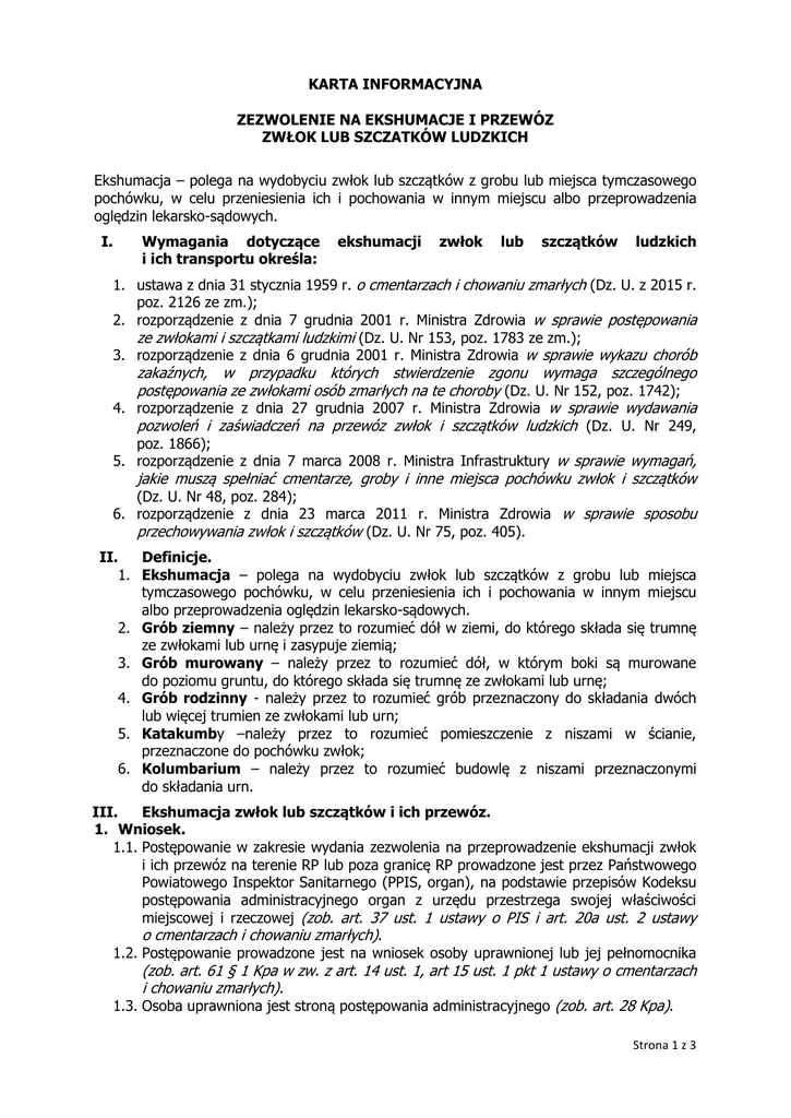 KARTA INFORMACYJNA ZEZWOLENIE NA EKSHUMACJE I PRZEWÓZ ZWŁOK LUB SZCZATKÓW LUDZKICH Ekshumacja – polega na wydobyciu zwłok lub szczątków z grobu lub miejsca tymczasowego pochówku, w celu przeniesienia ich i pochowania w innym miejscu albo przeprowadzenia oględzin lekarsko-sądowych. I. Wymagania dotyczące i ich transportu określa: ekshumacji zwłok lub szczątków ludzkich 1. ustawa z dnia 31 stycznia 1959 r. o cmentarzach i chowaniu zmarłych (Dz. U. z 2015 r. poz. 2126 ze zm.); 2. rozporządzenie z dnia 7 grudnia 2001 r. Ministra Zdrowia w sprawie postępowania ze zwłokami i szczątkami ludzkimi (Dz. U. Nr 153, poz. 1783 ze zm.); 3. rozporządzenie z dnia 6 grudnia 2001 r. Ministra Zdrowia w sprawie wykazu chorób zakaźnych, w przypadku których stwierdzenie zgonu wymaga szczególnego postępowania ze zwłokami osób zmarłych na te choroby (Dz. U. Nr 152, poz. 1742); 4. rozporządzenie z dnia 27 grudnia 2007 r. Ministra Zdrowia w sprawie wydawania pozwoleń i zaświadczeń na przewóz zwłok i szczątków ludzkich (Dz. U. Nr 249, poz. 1866); 5. rozporządzenie z dnia 7 marca 2008 r. Ministra Infrastruktury w sprawie wymagań, jakie muszą spełniać cmentarze, groby i inne miejsca pochówku zwłok i szczątków (Dz. U. Nr 48, poz. 284); 6. rozporządzenie z dnia 23 marca 2011 r. Ministra Zdrowia w sprawie sposobu przechowywania zwłok i szczątków (Dz. U. Nr 75, poz. 405). II. Definicje. 1. Ekshumacja – polega na wydobyciu zwłok lub szczątków z grobu lub miejsca tymczasowego pochówku, w celu przeniesienia ich i pochowania w innym miejscu albo przeprowadzenia oględzin lekarsko-sądowych. 2. Grób ziemny – należy przez to rozumieć dół w ziemi, do którego składa się trumnę ze zwłokami lub urnę i zasypuje ziemią; 3. Grób murowany – należy przez to rozumieć dół, w którym boki są murowane do poziomu gruntu, do którego składa się trumnę ze zwłokami lub urnę; 4. Grób rodzinny - należy przez to rozumieć grób przeznaczony do składania dwóch lub więcej trumien ze zwłokami lub urn; 5. Katakumby –należy przez to rozumieć pomieszczenie z niszami w ścianie, przeznaczone do pochówku zwłok; 6. Kolumbarium – należy przez to rozumieć budowlę z niszami przeznaczonymi do składania urn. III. Ekshumacja zwłok lub szczątków i ich przewóz. 1. Wniosek. 1.1. Postępowanie w zakresie wydania zezwolenia na przeprowadzenie ekshumacji zwłok i ich przewóz na terenie RP lub poza granicę RP prowadzone jest przez Państwowego Powiatowego Inspektor Sanitarnego (PPIS, organ), na podstawie przepisów Kodeksu postępowania administracyjnego organ z urzędu przestrzega swojej właściwości miejscowej i rzeczowej (zob. art. 37 ust. 1 ustawy o PIS i art. 20a ust. 2 ustawy o cmentarzach i chowaniu zmarłych). 1.2. Postępowanie prowadzone jest na wniosek osoby uprawnionej lub jej pełnomocnika (zob. art. 61 § 1 Kpa w zw. z art. 14 ust. 1, art 15 ust. 1 pkt 1 ustawy o cmentarzach i chowaniu zmarłych). 1.3. Osoba uprawniona jest stroną postępowania administracyjnego (zob. art. 28 Kpa). Strona 1 z 3 1.4. Postępowanie o wydanie zezwolenia na ekshumację i przewóz zwłok lub szczątków ludzkich następuje na umotywowany wniosek osoby uprawnionej do pochowania zwłok lub szczątków za zezwoleniem właściwego inspektora sanitarnego zgodnie z art. 10, art. 14 ust. 1 i 2 i art. 15 ustawy z dnia 31 stycznia 1959 roku o cmentarzach i chowaniu zmarłych. 1.5. Osobami uprawnionymi do złożenia wniosku są: 1) najbliższa pozostała rodzina osoby zmarłej: pozostały małżonek (a) osoby zmarłej, krewni zstępni, krewni wstępni, krewni boczni do czwartego stopnia pokrewieństwa, powinowaty w linii prostej do pierwszego stopnia, 2) osoba która zobowiązała się dobrowolnie do pochowania osoby zmarłej1; 3) wskazana przez zmarłego osoba mająca zająć się pochówkiem2. 1.3. Prawo osobiste do zmiany miejsca spoczywania zwłok jest prawem wspólnym wszystkich żyjących członków najbliższej rodziny zmarłego, zatem na przeprowadzenie ekshumacji wymagana jest zgoda wszystkich osób uprawnionych. 1.4. Wniosek strony musi zawierać dane niezbędne do wydania zezwolenia, określone w złączniku do Procedury – „Wniosek o wydanie zezwolenia”. 1.5. Jeżeli we wniosku nie wskazano adresu wnoszącego i nie ma możności ustalenia tego adresu na podstawie posiadanych danych, wniosek pozostawia się bez rozpoznania (zob. art. 64 § 1 Kpa). 1.6. Jeżeli wniosek nie czyni zadość innym wymaganiom ustalonym w przepisach prawa, a w szczególności gdy nie zawiera danych niezbędnych do wydania decyzji, PPIS wzywa wnoszącego do usunięcia braków w terminie siedmiu dni z pouczeniem, że nieusunięcie tych braków spowoduje pozostawienie podania bez rozpoznania (zob. art. 64 § 2 Kpa). 1.7. O wszczęciu postępowania oraz o zakończeniu postępowania, zebraniu dowodów i materiałów oraz o możliwości zgłoszenia żądań przed wydaniem decyzji, PPIS zawiadamia poza Wnioskodawcą pozostałe strony postępowania, a jeżeli działają one przez pełnomocnika, tego ustanowionego pełnomocnika. 1.8. Postępowanie kończy się wydaniem przez organ: 1) postanowienia o odmowie wszczęcia postępowania w trybie art. 61a Kpa, na które stronie służy zażalenie; 2) zezwolenia w formie decyzji administracyjnej; 3) odmową wydania zezwolenia w formie decyzji administracyjnej. 1.9. Po uprawomocnieniu się decyzji zezwalającej na ekshumację lub w sytuacji gdy decyzja zezwalająca jest zgodna z wolą wszystkich stron (art. 130 § 4 Kpa), Wnioskodawca zobowiązany jest, zawiadomić Państwowego Powiatowego Inspektora Sanitarnego o terminie ekshumacji na 7 dni przed ustalonym terminem przeprowadzenia ekshumacji celem umożliwienia sprawowania nadzoru (§ 12 ust. 2 pkt 1 rozporządzenie z dnia 7 grudnia 2001 r. Ministra Zdrowia w sprawie postępowania ze zwłokami i szczątkami ludzkimi). Brak zawiadomienia stanowi wykroczenie zagrożone karą aresztu lub grzywny (art