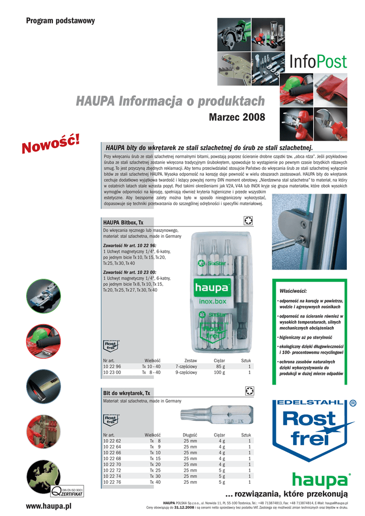 Program podstawowy InfoPost HAUPA Informacja o produktach Marzec 2008 ! ć ś o w No HAUPA bity do wkrętarek ze stali szlachetnej do śrub ze stali szlachetnej. Przy wkręcaniu śrub ze stali szlachetnej normalnymi bitami, powstają poprzez ścieranie drobne cząstki tzw. „obca rdza”. Jeśli przykładowo śruba ze stali szlachetnej zostanie wkręcona tradycyjnym śrubokrętem, spowoduje to wystąpienie po pewnym czasie brzydkich rdzawych smug. To jest przyczyną zbędnych reklamacji. Aby temu przeciwdziałać stosujcie Państwo do wkręcania śrub ze stali szlachetnej wyłącznie bitów ze stali szlachetnej HAUPA. Wysoka odporność na korozję daje pewność w wielu obszarach zastosowań. HAUPA bity do wkrętarek cechuje dodatkowo wyjątkowa twardość i leżący powyżej normy DIN moment obrotowy. „Nierdzewna stal szlachetna” to materiał, na który w ostatnich latach stale wzrasta popyt. Pod takimi określeniami jak V2A, V4A lub INOX kryje się grupa materiałów, które obok wysokich wymogów odporności na korozję, spełniają również kryteria higieniczne i przede wszystkim estetyczne. Aby bezsporne zalety można było w sposób nieograniczony wykorzystać, dopasowuje się techniki przetwarzania do szczególnej odrębności i specyfiki materiałowej. HAUPA Bitbox, Tx Do wkręcania ręcznego lub maszynowego, materiał: stal szlachetna, made in Germany Zawartość Nr art. 10 22 96: 1 Uchwyt magnetyczny 1/4", 6-katny, po jednym bicie Tx 10, Tx 15, Tx 20, Tx 25, Tx 30, Tx 40 Zawartość Nr art. 10 23 00: 1 Uchwyt magnetyczny 1/4", 6-katny, po jednym bicie Tx 8, Tx 10, Tx 15, Tx 20, Tx 25, Tx 27, Tx 30, Tx 40 Właściwości: •odporność na korozję w powietrzu, wodzie i agresywnych nośnikach •odporność na ścieranie również w wysokich temperaturach, silnych mechanicznych obciążeniach •higieniczny aż po sterylność •ekologiczny dzięki długowieczności i 100- procentowemu recyclingowi Nr art. 10 22 96 10 23 00 Wielkość Tx 10 – 40 Tx 8 – 40 Zestaw 7-częściowy 9-częściowy Ciężar 85 g 100 g Sztuk 1 1 Ciężar 4g 4g 4g 4g 4g 5g 5g 5g Sztuk 1 1 1 1 1 1 1 1 •ochrona zasobów naturalnych dzięki wykorzystywaniu do produkcji w dużej mierze odpadów Bit do wkrętarek, Tx Materiał: stal szlachetna, made in Germany Nr art. 10 22 62 10 22 64 10 22 66 10 22 68 10 22 70 10 22 72 10 22 74 10 22 76 Q DIN EN ISO 9001 ZERTIFIKAT www.haupa.pl Wielkość Tx 8 Tx 9 Tx 10 Tx 15 Tx 20 Tx 25 Tx 30 Tx 40 Długość 25 mm 25 mm 25 mm 25 mm 25 mm 25 mm 25 mm 25 mm ... rozwiązania, które przekonują HAUPA POLSKA Sp.z.o.o., ul. Norwida 11, PL 55-100 Trzebnica, Tel.: +48 713874813, Fax: +48 713874814, E-Mail: [email protected] Ceny obowiązują do 31.12.2008 i są cenami netto sprzedawcy bez podatku VAT. Zastrzega się możliwość zmian technicznych oraz błędów w druku. HAUPA bity do wkrętarek ze stali szlachetnej InfoPost HAUPA Bitbox, Phillips + Pozidriv HAUPA Bitbox, zew. sześciokąt Do wkręcania ręcznego lub maszynowego, materiał: stal szlachetna, made in Germany Do wkręcania ręcznego lub maszynowego, materiał: stal szlachetna, made in Germany Zawartość Nr art. 10 22 98: 1 Uchwyt magnetyczny 1/4", 6-katny, po jednym bicie PH 1 + 2 + 2 + 3 i po jednym bicie PZ 1 + 2 + 2 + 3 Zawartość Nr art. 10 23 04: 1 Uchwyt magnetyczny 1/4", 6-katny, po jednym bicie 2 + 2,5 + 3 + 4 + 5 + 6 Zawartość Nr art. 10 23 02: 1 Uchwyt magnetyczny 1/4", 6-katny, po jednym bicie PH 1 + 2 + 3 i po jednym bicie PZ 1 + 2 + 3 Nr art. 10 22 98 10 23 02 Wielkość 1–2–2–3 1–2–3 Zestaw 9-częściowy 7-częściowy Ciężar 100 g 85 g Sztuk 1 1 Nr art. 10 23 04 Wielkość 2–6 Zestaw 7-częściowy Ciężar 85 g Sztuk 1 Ciężar 4g 4g 4g 4g 4g 5g 5g 5g 5g Sztuk 1 1 1 1 1 1 1 1 1 Bit do wkrętarek, zew. sześciokąt Bit do wkrętarek, Phillips Materiał: stal szlachetna, made in Germany Materiał: stal szlachetna, made in Germany Nr art. 10 22 50 10 22 52 10 22 54 Wielkość PH 1 PH 2 PH 3 Długość 25 mm 25 mm 25 mm Ciężar 4g 4g 5g Sztuk 1 1 1 Bit do wkrętarek, Pozidriv Materiał: stal szlachetna, made in Germany Nr art. 10 22 78 10 22 80 10 22 82 10 22 84 10 22 86 10 22 88 10 22 90 10 22 92 10 22 94 Wielkość 2 2,5 3 4 5 6 7 8 9 Długość 25 mm 25 mm 25 mm 25 mm 25 mm 25 mm 25 mm 25 mm 25 mm Przy wkręcaniu śrub ze stali szlachetnej przy pomocy normalnych bitów, powstaje poprzez ścieranie drobny pył, tzw. obca rdza. Nr art. 10 22 56 10 22 58 10 22 60 Wielkość PZ 1 PZ 2 PZ 3 Długość 25 mm 25 mm 25 mm Ciężar 4g 4g 5g Sztuk 1 1 1 W związku z tym ważne jest, aby • narzędzi ze stali nierdzewnej nigdy nie przechowywać z narzędziami ze stali „tradycyjnej” • nie używać do wkręcania śrub ze stali „tradycyjnej” W przeciwnym razie nastąpi „skażenie”, które doprowadzić może do wspomnianych wyżej problemów. Pieczątka firmowa Hurtownia elektryczna: www.haupa.pl ... rozwiązania, które przekonują HAUPA POLSKA Sp.z.o.o., ul. Norwida 11, PL 55-100 Trzebnica, Tel.: +48 713874813, Fax: +48 713874814, E-Mail: [email protected] Ceny obowiązują do 31.12.2008 i są cenami netto sprzedawcy bez podatku VAT. Zastrzega się możliwość zmian technicznych oraz błędów w druku.