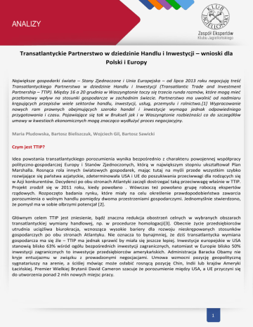 ANALIZY Transatlantyckie Partnerstwo w dziedzinie Handlu i Inwestycji – wnioski dla Polski i Europy Największe gospodarki świata – Stany Zjednoczone i Unia Europejska – od lipca 2013 roku negocjują treść Transatlantyckiego Partnerstwa w dziedzinie Handlu i Inwestycji (Transatlantic Trade and Investment Partnership – TTIP). Między 16 a 20 grudnia w Waszyngtonie toczy się trzecia runda rozmów, które mogą mieć przełomowy wpływ na stosunki gospodarcze w zachodnim świecie. Partnerstwo ma uwolnić od nadmiaru krępujących przepisów wiele sektorów handlu, inwestycji, usług, przemysłu i rolnictwa.[1] Wypracowanie nowych ram prawnych obejmujących szeroko handel i inwestycje wymaga jednak odpowiedniego przygotowania i czasu. Pojawiające się tak w Brukseli jak i w Waszyngtonie rozbieżności co do szczegółów umowy w kwestiach ekonomicznych mogą znacząco wydłużyć proces negocjacyjny. Maria Płudowska, Bartosz Bieliszczuk, Wojciech Gil, Bartosz Sawicki Czym jest TTIP? Idea powstania transatlantyckiego porozumienia wynika bezpośrednio z charakteru powojennej współpracy polityczno-gospodarczej Europy i Stanów Zjednoczonych, którą w największym stopniu ukształtował Plan Marshalla. Rosnąca rola innych światowych gospodarek, mając tutaj na myśli przede wszystkim szybko rozwijające się państwa azjatyckie, zdeterminowała USA i UE do poszukiwania przeciwwagi dla rodzących się w Azji konkurentów. Decydenci po obu stronach Atlantyki zaczęli dostrzegać taką przeciwwagę właśnie w TTIP. Projekt zrodził się w 2011 roku, kiedy powołano . Wówczas też powołano grupę roboczą ekspertów rządowych. Rozpoczęto badania rynku, które miały na celu określenie prawdopodobieństwa zawarcia porozumienia o wolnym handlu pomiędzy dwoma przestrzeniami gospodarczymi. Jednomyślnie stwierdzono, że pomysł ma w sobie olbrzymi potencjał [2]. Głównym celem TTIP jest zniesienie, bądź znaczna redukcja obostrzeń celnych w wybranych obszarach transatlantyckiej wymiany handlowej, np. w procedurze homologacji[3]. Obecnie życie przedsiębiorców utrudnia uciążliwa biurokracja, wznosząca wysokie bariery dla rozwoju nieskrępowanych stosunków gospodarczych po obu stronach Atlantyku. Nie oznacza to bynajmniej, że dziś transatlantycka wymiana gospodarcza ma się źle – TTIP ma jednak sprawić by miała się jeszcze lepiej. Inwestycje europejskie w USA stanowią blisko 63% wśród ogółu bezpośrednich inwestycji zagranicznych, natomiast w Europie blisko 50% inwestycji zagranicznych to inwestycje przedsiębiorców amerykańskich. Administracja Baracka Obamy nie kryje entuzjazmu w związku z prowadzonymi negocjacjami. Umowa wzmocni pozycję geopolityczną sygnatariuszy na arenie, a ściślej mówiąc może osłabić rosnącą pozycję Chin, Indii lub krajów Ameryki Łacińskiej. Premier Wielkiej Brytanii David Cameron szacuje że porozumienie między USA, a UE przyczyni się do utworzenia ponad 2 mln nowych miejsc pracy. 1 ANALIZY Źródło: Centre for Economic Policy Research, http://trade.ec.europa.eu/doclib/docs/2013/march/tradoc_150737.pdf, (19/12/2013) Z punktu widzenia inwestorów niezwykle cenne mogą okazać sie zapisy o ochronie bezpieczeństwa przedsiębiorców, oraz własności intelektualnej, dbając równocześnie o wysoki poziom ochrony środowiska i zdrowia. Umowa ma także zredukować koszty ponoszone w wyniku rozbieżności w przepisach poprzez ujednolicenie niektórych aktów prawnych. Innym zadaniem, z którym mierzą się negocjatorzy jest kwestia opracowania przepisów i zasad współpracy o charakterze globalnym, podjęcie problemu barier lokalizacyjnych w handlu międzypaństwowym oraz promocja konkurencyjności małych i średnich przedsiębiorstw.[4] Zawarcie porozumienia jest dużą nadzieją zarówno dla odczuwającego wciąż skutki kryzysu Starego Kontynentu niemniej dotkniętych problemem Stanów Zjednoczonych. Podpisanie porozumienia TTIP będzie oznaczało wyparcie NAFTA z pozycji największego paktu handlowego w świecie oraz ponowne zainteresowanie się Waszyngtonu Europą, które po upadku Żelaznej kurtyny stopniowo słabło. Jak dotychczas odbyły się dwie rundy negocjacji miedzy zainteresowanymi stronami. Pierwsza tura rozmów przeprowadzona w lipcu tego roku w Waszyngtonie służyła przygotowaniu gruntu negocjacyjnego pod przyszłe szczegółowe rozmowy. Sprecyzowano gdzie obie strony widzą podobieństwa w swoich stanowiskach a gdzie rozbieżności.[5] Podczas drugiej tury negocjacji, którą przeprowadzono w listopadzie w Brukseli, dyskutowano nad usługami finansowymi oraz telekomunikacyjnymi. Rozpoczęto także debatę dotyczącą dostępu do rynku, w różnych sektorach usług. Obie strony wyraziły chęć zwiększenia kompatybilności prawa w kwestii urządzeń medycznych, kosmetyków, środków farmaceutycznych oraz produktów chemicznych. Technologie informacyjne oraz komunikacyjne a także sektor motoryzacyjny zostaną ponownie omówione podczas trzeciej tury negocjacji. 2 ANALIZY Mocne strony Partnerstwa Jakie korzyści może przynieść TTIP zainteresowanym stronom? Oszacowanie możliwych korzyści płynących z TTIP różnią się w zależności od założeń przyjętych w prognozach. Według szacunków Organizacji Współpracy Gospodarczej i Rozwoju potencjalne korzyści dla UE i USA, mogą zwiększyć wzrost PKB o dodatkowe 3,5% czyli ponad 1 bilion USD[6]. Badania przeprowadzone przez brytyjski think tank Centre for Economic Policy Research (CEPR) nie prowadzą do tak optymistycznych wniosków, niemniej wynika z nich, że implementacja TTIP przyniesie UE między 68-119 mld USD, a Stanom Zjednoczonym od 50 do 95 mld USD[7]. Wysokość zysku zależeć będzie od stopnia ekonomicznej integracji – im więcej zlikwidowanych barier i im większa liberalizacja transatlantyckiego handlu, tym większe korzyści dla Europy i USA. Zdaniem analityków z CEPR, zniesienie ceł, oraz zmniejszenie negatywnego wp