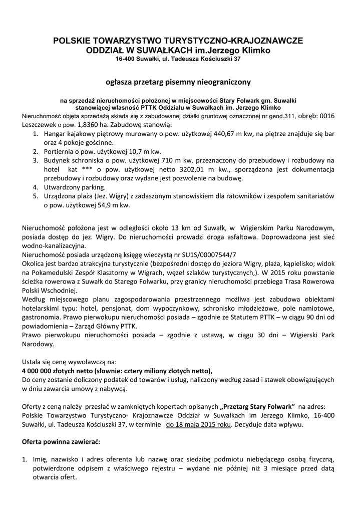 POLSKIE TOWARZYSTWO TURYSTYCZNO-KRAJOZNAWCZE ODDZIAŁ W SUWAŁKACH im.Jerzego Klimko 16-400 Suwałki, ul. Tadeusza Kościuszki 37 ogłasza przetarg pisemny nieograniczony na sprzedaż nieruchomości położonej w miejscowości Stary Folwark gm. Suwałki stanowiącej własność PTTK Oddziału w Suwałkach im. Jerzego Klimko Nieruchomość objęta sprzedażą składa się z zabudowanej działki gruntowej oznaczonej nr geod.311, obręb: 0016 Leszczewek o pow. 1,8360 ha. Zabudowę stanowią: 1. Hangar kajakowy piętrowy murowany o pow. użytkowej 440,67 m kw, na piętrze znajduje się bar oraz 4 pokoje gościnne. 2. Portiernia o pow. użytkowej 10,7 m kw. 3. Budynek schroniska o pow. użytkowej 710 m kw. przeznaczony do przebudowy i rozbudowy na hotel kat *** o pow. użytkowej netto 3202,01 m kw., sporządzona jest dokumentacja przebudowy i rozbudowy oraz wydane jest pozwolenie na budowę. 4. Utwardzony parking. 5. Urządzona plaża (Jez. Wigry) z zadaszonym stanowiskiem dla ratowników i zespołem sanitariatów o pow. użytkowej 54,9 m kw. Nieruchomość położona jest w odległości około 13 km od Suwałk, w Wigierskim Parku Narodowym, posiada dostęp do jez. Wigry. Do nieruchomości prowadzi droga asfaltowa. Doprowadzona jest sieć wodno-kanalizacyjna. Nieruchomość posiada urządzoną księgę wieczystą nr SU1S/00007544/7 Okolica jest bardzo atrakcyjna turystycznie (bezpośredni dostęp do jeziora Wigry, plaża, kąpielisko; widok na Pokamedulski Zespół Klasztorny w Wigrach, węzeł szlaków turystycznych,). W 2015 roku powstanie ścieżka rowerowa z Suwałk do Starego Folwarku, przy granicy nieruchomości przebiega Trasa Rowerowa Polski Wschodniej. Według miejscowego planu zagospodarowania przestrzennego możliwa jest zabudowa obiektami hotelarskimi typu: hotel, pensjonat, dom wypoczynkowy, schronisko młodzieżowe, pole namiotowe, gastronomia. Prawo pierwokupu nieruchomości posiada – zgodnie ze Statutem PTTK – w ciągu 90 dni od powiadomienia – Zarząd Główny PTTK. Prawo pierwokupu nieruchomości posiada – zgodnie z ustawą, w ciągu 30 dni – Wigierski Park Narodowy. Ustala się cenę wywoławczą na: 4 000 000 złotych netto (słownie: cztery miliony złotych netto), Do ceny zostanie doliczony podatek od towarów i usług, naliczony według zasad i stawek obowiązujących w dniu zawarcia umowy z nabywcą. Oferty z ceną należy przesłać w zamkniętych kopertach opisanych „Przetarg Stary Folwark” na adres: Polskie Towarzystwo Turystyczno- Krajoznawcze Oddział w Suwałkach im Jerzego Klimko, 16-400 Suwałki, ul. Tadeusza Kościuszki 37, w terminie do 18 maja 2015 roku. Decyduje data wpływu. Oferta powinna zawierać: 1. Imię, nazwisko i adres oferenta lub nazwę oraz siedzibę podmiotu niebędącego osobą fizyczną, potwierdzone odpisem z właściwego rejestru – wydane nie później niż 3 miesiące przed datą otwarcia ofert. 2. Datę sporządzenia oferty. 3. Oferowaną cenę za przedmiot przetargu. 4. Oświadczenie, że oferent zapoznał się ze stanem faktycznym i prawnym sprzedawanych nieruchomości. 5. Oświadczenie, że oferent zapoznał się z warunkami przetargu i przyjmuje je bez zastrzeżeń. 6. W przypadku cudzoziemców potrzebujących zgody MSW na zakup nieruchomości- kopię wniosku złożonego w MSW, w celu uzyskania zezwolenia na nabycie nieruchomości. Otwarcie i rozpatrzenie ofert nastąpi w dniu 19 maja 2015 roku. Kupujący ponosi wszystkie koszty związane z nabyciem nieruchomości, w tym opłaty notarialne i opłaty skarbowe. Warunkiem zakwalifikowania oferenta do przetargu jest: – wpłacenie wadium w wysokości 10% ceny wywoławczej netto (400 000 zł, słownie: czterysta tysięcy złotych) - na rachunek w Bank Zachodni WBK S.A. 2 Oddział w Suwałkach nr 19 1500 1719 1217 1003 5192 0000 przy czym w dniu poprzedzającym otwarcie ofert pieniądze muszą faktycznie wpłynąć na podany rachunek. Wpłacone wadium podlega: – zaliczaniu na poczet ceny nabycia nieruchomości w przypadku wygrania przetargu, – przepadkowi w razie uchylenia się uczestnika, który wygrał przetarg od zawarcia umowy notarialnej, w terminie określonym przez organizatora przetargu, – przepadkowi w razie nie uzyskania zezwolenia MSW na zakup nieruchomości przez cudzoziemca w terminie ustawowym, – zwrotowi uczestnikom, którzy przetargu nie wygrają (wadium zwraca się niezwłocznie, jednak nie później niż przed upływem 3 dni od dnia: odwołania przetargu, zamknięcia przetargu, unieważnienia przetargu, zakończenia przetargu wynikiem negatywnym). Uczestnik przetargu, którego oferta zostanie przyjęta zobowiązany jest do dokonania pełnej wpłaty oferowanej w przetargu kwoty, nie później niż na dzień przed dniem podpisania notarialnej umowy o nabycie (pieniądze muszą wpłynąć na konto PTTK Oddział w Suwałkach im. J.Klimko). Niedopełnienie tego obowiązku uprawnia PTTK Oddział w Suwałkach im. J.Klimko do sprzedaży nieruchomości kolejnym oferentom. Do przeprowadzenia przetargu wystarczy uczestnictwo jednego uczestnika przetargu i zaoferowanie ceny nabycia równej lub większej od ceny wywoławczej. O wyborze oferty zadecyduje najwyższa zaoferowana cena. PTTK Oddział w Suwałkach im. J.Klimko zastrzega sobie prawo do unieważnienia przetargu bez wyboru oferty, bez podania przyczyn i bez ponoszenia jakichkolwiek skutków prawnych i finansowych tego unieważnienia. Dodatkowych informacji w sprawie przetargu oraz możliwości obejrzenia przeznaczonej do sprzedaży nieruchomości udzielają pracownicy biura Oddziału PTTK w Suwałkach im. J.Klimko ul. T. Kościuszki 37, tel. 87 566 59 61, 603 093 723, e-mail: [email protected].