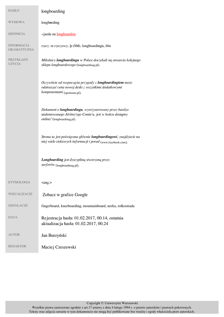 HASŁO longboarding WYMOWA longbording DEFINICJA «jazda na longboardzie» INFORMACJA GRAMATYCZNA rzecz. m rzeczowy, lp DMs. longboardingu, blm PRZYKŁADY UŻYCIA Miłośnicy longboardingu w Polsce doczekali się otwarcia kolejnego sklepu longboardowego (longboardmag.pl). Oczywiście od rozpoczęcia przygody z longboardingiem może odstraszać cena nowej deski z wszystkimi dodatkowymi komponentami (sporteuro.pl). Dokument o longboardingu, wyreżyserowany przez bardzo utalentowanego Jérémy'ego Comte'a, jest w końcu dostępny online! (longboardmag.pl). Strona ta jest poświęcona głównie longboardingowi, znajdziecie na niej wiele ciekawych informacji i porad (www.facebook.com). Longboarding jest dyscypliną stworzoną przez surferów (longboardmag.pl). ETYMOLOGIA WIZUALIZACJE <ang.> Zobacz w grafice Google ODSYŁACZE fingerboard, kneeboarding, mountainboard, nerka, rolkostrada DATA Rejestracja hasła: 01.02.2017, 00.14, ostatnia aktualizacja hasła: 01.02.2017, 00.24 AUTOR Jan Burzyński REDAKTOR Maciej Czeszewski Copyright © Uniwersytet Warszawski Wszelkie prawa zastrzeżone zgodnie z art.17 ustawy z dnia 4 lutego 1994 r. o prawie autorskim i prawach pokrewnych. Teksty oraz zdjęcia zawarte w tym dokumencie nie mogą być publikowane bez wiedzy i zgody właściciela praw autorskich. Powered by TCPDF (www.tcpdf.org)