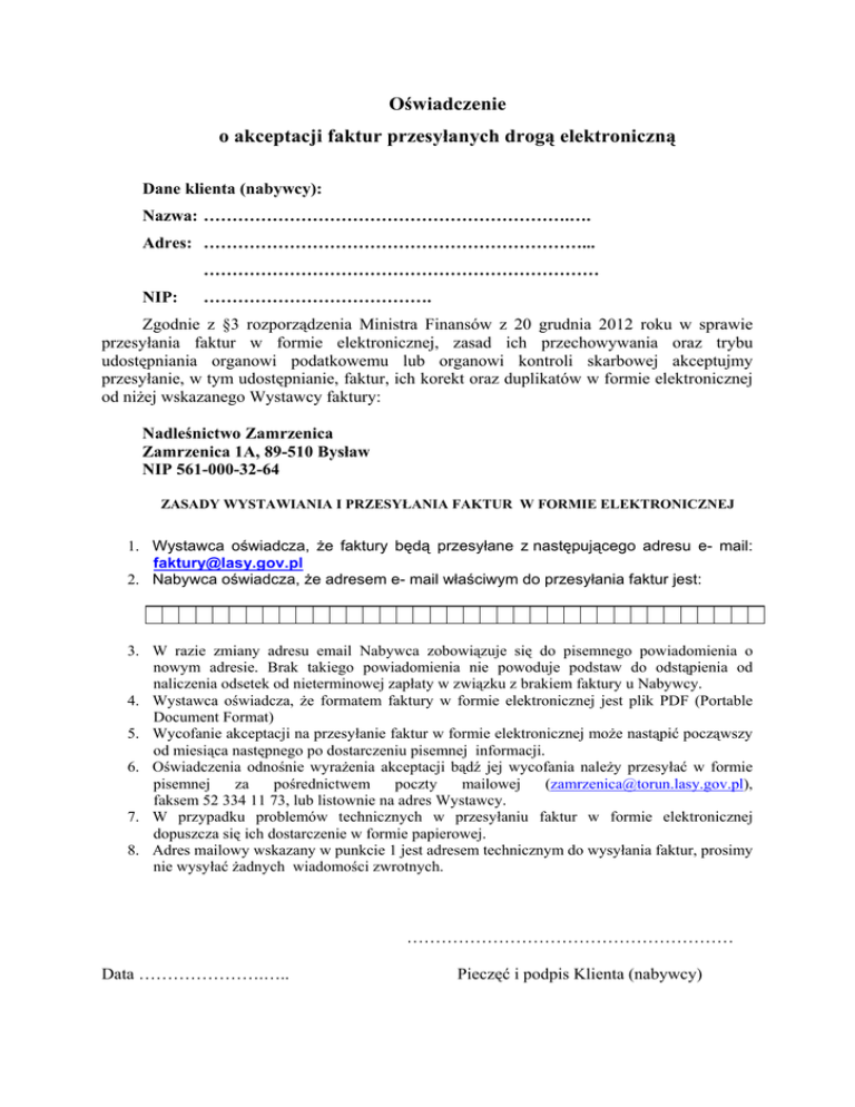Oświadczenie o akceptacji faktur przesyłanych drogą elektroniczną Dane klienta (nabywcy): Nazwa: ……………………………………………………….…. Adres: …………………………………………………………... …………………………………………………………… NIP: …………………………………. Zgodnie z §3 rozporządzenia Ministra Finansów z 20 grudnia 2012 roku w sprawie przesyłania faktur w formie elektronicznej, zasad ich przechowywania oraz trybu udostępniania organowi podatkowemu lub organowi kontroli skarbowej akceptujmy przesyłanie, w tym udostępnianie, faktur, ich korekt oraz duplikatów w formie elektronicznej od niżej wskazanego Wystawcy faktury: Nadleśnictwo Zamrzenica Zamrzenica 1A, 89-510 Bysław NIP 561-000-32-64 ZASADY WYSTAWIANIA I PRZESYŁANIA FAKTUR W FORMIE ELEKTRONICZNEJ 1. Wystawca oświadcza, że faktury będą przesyłane z następującego adresu e- mail: [email protected] 2. Nabywca oświadcza, że adresem e- mail właściwym do przesyłania faktur jest: 3. W razie zmiany adresu email Nabywca zobowiązuje się do pisemnego powiadomienia o nowym adresie. Brak takiego powiadomienia nie powoduje podstaw do odstąpienia od naliczenia odsetek od nieterminowej zapłaty w związku z brakiem faktury u Nabywcy. 4. Wystawca oświadcza, że formatem faktury w formie elektronicznej jest plik PDF (Portable Document Format) 5. Wycofanie akceptacji na przesyłanie faktur w formie elektronicznej może nastąpić począwszy od miesiąca następnego po dostarczeniu pisemnej informacji. 6. Oświadczenia odnośnie wyrażenia akceptacji bądź jej wycofania należy przesyłać w formie pisemnej za pośrednictwem poczty mailowej ([email protected]), faksem 52 334 11 73, lub listownie na adres Wystawcy. 7. W przypadku problemów technicznych w przesyłaniu faktur w formie elektronicznej dopuszcza się ich dostarczenie w formie papierowej. 8. Adres mailowy wskazany w punkcie 1 jest adresem technicznym do wysyłania faktur, prosimy nie wysyłać żadnych wiadomości zwrotnych. ………………………………………………… Data ………………….….. Pieczęć i podpis Klienta (nabywcy)