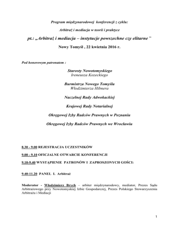 Program międzynarodowej konferencji z cyklu: Arbitraż i mediacja w teorii i praktyce pt.: „Arbitraż i mediacja – instytucje powszechne czy elitarne ” Nowy Tomyśl , 22 kwietnia 2016 r. Pod honorowym patronatem : Starosty Nowotomyskiego Ireneusza Kozeckiego Burmistrza Nowego Tomyśla Włodzimierza Hibnera Naczelnej Rady Adwokackiej Krajowej Rady Notarialnej Okręgowej Izby Radców Prawnych w Poznaniu Okręgowej Izby Radców Prawnych we Wrocławiu 8.30 - 9.00 REJESTRACJA UCZESTNIKÓW 9.00 - 9.10 OFICJALNE OTWARCIE KONFERENCJI 9.10-9.40 WYSTĄPIENIE PATRONÓW I ZAPROSZONYCH GOŚCI: 9.40-11.20 PANEL I. Arbitraż Moderator - Włodzimierz Brych – arbiter międzynarodowy, mediator, Prezes Sądu Arbitrażowego przy Nowotomyskiej Izbie Gospodarczej, Prezes Polskiego Stowarzyszenia Arbitrażu i Mediacji 1. Dostępność arbitrażu na Ukrainie: tendencje postępowe i przeszkody - Mykola Selivon – prof. dr nauk prawnych , Prezes Międzynarodowego Sądu Arbitrażowego przy Ukraińskiej Izbie Handlowo –Przemysłowej w Kijowie (Ukraina) 2. Klauzula arbitrażowa i wybrane aspekty zastosowania prawa materialnego w postępowaniu arbitrażowym na Białorusi - Alexander Korsak - partner zarządzający w kancelarii adwokackiej Arzinger w Mińsku (Białoruś) 3. Funkcjonowanie CIETAC w Chinach – Gu Yan – Dyrektor Departamentu Rejestracji i Konsultingu w CIETAC (China International Economic and Trade Arbitration Commision) w Pekinie , arbiter w CIETAC , arbiter w Sądzie Arbitrażowym przy Nowotomyskiej Izbie Gospodarczej (Chiny) 4. Regulacja uznania i wykonania wyroku arbitrażowego – główna przeszkoda na drodze do uznania wyroku arbitrażowego za uniwersalną instytucję - Nikoloz Pitskhelauri – dr nauk prawnych , kierownik jednostki naukowo-badawczej na Uniwersytecie im. Gurama Tavartkiladze w Tbilisi , arbiter w Sądzie Arbitrażowym przy Nowotomyskiej Izbie Gospodarczej (Gruzja) 5. Adwokatura a arbitraż - Maciej Łaszczuk – adwokat , członek Naczelnej Rady Adwokackiej – Przewodniczący Komisji Arbitrażowej NRA , Przewodniczący Rady Arbitrażowej w Sądzie Arbitrażowym przy Krajowej Izbie Gospodarczej w Warszawie 6. Arbitraż powszechny – utopijna wizja czy niewykorzystana szansa? - Paweł A. Tatarczak - adwokat w Greenberg Traurig Grzesiak sp.k. w Warszawie 7 Prawa konstytucyjne stron postępowania ze skargi o uchylenie wyroku sądu polubownego w świetle nowelizacji k.p.c. – Włodzimierz Głodowski – dr hab. nauk prawnych - Wydział Prawa i Administracji Katedra postępowania Cywilnego UAM w Poznaniu , arbiter w Sądzie Arbitrażowym przy Nowotomyskiej Izbie Gospodarczej 8. Dowód z opinii biegłego w postępowaniu arbitrażowym. Łatwo dostępny czy elitarny? – Paweł Pietkiewicz – adwokat , partner w Greenberg Traurig Grzesiak sp.k. w Warszawie DYSKUSJA 11.30-11.45 PRZERWA KAWOWA 11.45-13.20 Panel II. Mediacja Wystąpienie Janusza Korwina – Mikke – Posła do Parlamentu Europejskiego Moderator – Krystian Mularczyk- radca prawny, Kancelaria Radcy Prawnego Krystian Mularczyk, członek kolegium redakcyjnego kwartalnika ADR Arbitraż i Mediacja, arbiter w Sądzie Arbitrażowym w Nowym Tomyślu (Polska) 1. Najnowsze tendencje rozwojowe tureckiego prawa o mediacji w świetle praktyki Ergun Özsunay – profesor nauk prawnych , doradca prawny Izby Przemysłowo-Handlowej w Stambule (Turcja) 2. Dlaczego prawnicy pełnią jedną z kluczowych ról w procesie mediacji - Zbigniew Tur radca prawny, Dziekan Okręgowej Izby Radców Prawnych w Poznaniu 3. Mediacja w Federacji Rosyjskiej - Inna Mironowa - Uniwersytet Państwowy w Irkucku, stypendystka programu Lane'a Kirklanda (Rosja) 4. Mediacja jako uniwersalna instytucja przedprocesowego rozwiązywania sporów- Yusuf Bozorowicz Nazarow - adwokat, dyrektor biura adwokackiego “ADOLAT SOQCHISI”, profesor dr hab. nauk prawnych, arbiter w Sądzie Arbitrażowym przy Nowotomyskiej Izbie Gospodarczej (Uzbekistan) 5. Mediacja w Azerbejdżanie - Nijazi Mammadow – Międzynarodowy Sąd Arbitrażowy w Baku , arbiter w Sądzie Arbitrażowym przy Nowotomyskiej Izbie Gospodarczej (Azerbejdżan) 6. Perspektywy wprowadzenia instytucji mediacji do ukraińskiego postępowania cywilnego i gospodarczego - Vasyl Buchko - docent, doktor z zakresu Psychologii Jurydycznej Równieński Państwowy Uniwersytet Humanistyczny w Równem (Ukraina) 7. Elitarność a powszechność mediacji. Nowelizacja przepisów o kosztach mediacji a zasada swobody umów - Tomasz P. Antoszek – dr nauk prawnych , mediator , DOM MEDIACYJNY przy Instytucie Rozwoju Prawa; wykładowca na Uniwersytecie im. A. Mickiewicza w Poznaniu DYSKUSJA 13.20-14.00 Przerwa obiadowa 14.00-16.00 PANEL III. ADR Moderator – Tomasz P. Antoszek – dr nauk prawnych , mediator , DOM MEDIACYJNY przy Instytucie Rozwoju Prawa; wykładowca na Uniwersytecie im. A. Mickiewicza w Poznaniu 1. Arbitraż i mediacja – instytucje powszechne czy elitarne? - A może po prostu – niszowe? - Przemysław P. Krzywosz - FCIArb – Chartered Arbitrator, radca prawny– Poland, Solicitor–England and Wales; Przemysław P.Krzywosz Kancelaria Prawna, Warszawa 2. Skuteczność ADR na Łotwie - Inga Oga – radca prawny, Wydział Sądownictwa Ministerstwa Sprawiedliwości Republiki Łotwy (Łotwa) 3. Wpływ informatyzacji na upowszechnienie alternatywnych metod rozwiązywania sporów cywilnych - Kinga Flaga – Gieruszyńska , prof. dr hab. Kierownik Katedry Postępowania Cywilnego WPiA Uniwersytet Szczeciński w Szczecinie 4. Mediacja transgraniczna z perspektywy niemieckiej - ustawodawstwo i praktyka - . Katarzyna Schubert-Panecka – dr nauk prawnych , międzynarodowa mediatorka gospodarcza, coach i trenerka binzesu, wykladowca uniwersytecki , autorka i współzałożycielka oraz kierująca pracami Mediacyjnej Grupy Badawczej i fachowej grupy mediacji Polska - DACH na rzecz międzynarodowej współpracy między Polską i Niemcami (Niemcy) 5. Spory konsumenckie z zakresu usług telekomunikacyjnych i po