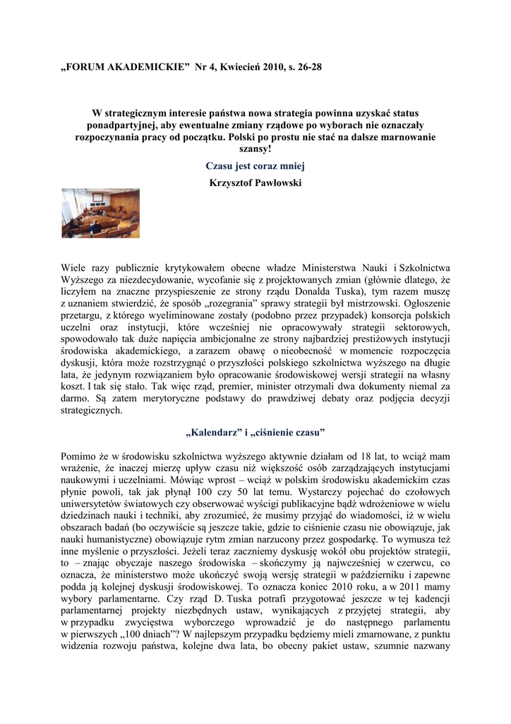 „FORUM AKADEMICKIE” Nr 4, Kwiecień 2010, s. 26-28 W strategicznym interesie państwa nowa strategia powinna uzyskać status ponadpartyjnej, aby ewentualne zmiany rządowe po wyborach nie oznaczały rozpoczynania pracy od początku. Polski po prostu nie stać na dalsze marnowanie szansy! Czasu jest coraz mniej Krzysztof Pawłowski Wiele razy publicznie krytykowałem obecne władze Ministerstwa Nauki i Szkolnictwa Wyższego za niezdecydowanie, wycofanie się z projektowanych zmian (głównie dlatego, że liczyłem na znaczne przyspieszenie ze strony rządu Donalda Tuska), tym razem muszę z uznaniem stwierdzić, że sposób „rozegrania” sprawy strategii był mistrzowski. Ogłoszenie przetargu, z którego wyeliminowane zostały (podobno przez przypadek) konsorcja polskich uczelni oraz instytucji, które wcześniej nie opracowywały strategii sektorowych, spowodowało tak duże napięcia ambicjonalne ze strony najbardziej prestiżowych instytucji środowiska akademickiego, a zarazem obawę o nieobecność w momencie rozpoczęcia dyskusji, która może rozstrzygnąć o przyszłości polskiego szkolnictwa wyższego na długie lata, że jedynym rozwiązaniem było opracowanie środowiskowej wersji strategii na własny koszt. I tak się stało. Tak więc rząd, premier, minister otrzymali dwa dokumenty niemal za darmo. Są zatem merytoryczne podstawy do prawdziwej debaty oraz podjęcia decyzji strategicznych. „Kalendarz” i „ciśnienie czasu” Pomimo że w środowisku szkolnictwa wyższego aktywnie działam od 18 lat, to wciąż mam wrażenie, że inaczej mierzę upływ czasu niż większość osób zarządzających instytucjami naukowymi i uczelniami. Mówiąc wprost – wciąż w polskim środowisku akademickim czas płynie powoli, tak jak płynął 100 czy 50 lat temu. Wystarczy pojechać do czołowych uniwersytetów światowych czy obserwować wyścigi publikacyjne bądź wdrożeniowe w wielu dziedzinach nauki i techniki, aby zrozumieć, że musimy przyjąć do wiadomości, iż w wielu obszarach badań (bo oczywiście są jeszcze takie, gdzie to ciśnienie czasu nie obowiązuje, jak nauki humanistyczne) obowiązuje rytm zmian narzucony przez gospodarkę. To wymusza też inne myślenie o przyszłości. Jeżeli teraz zaczniemy dyskusję wokół obu projektów strategii, to – znając obyczaje naszego środowiska – skończymy ją najwcześniej w czerwcu, co oznacza, że ministerstwo może ukończyć swoją wersję strategii w październiku i zapewne podda ją kolejnej dyskusji środowiskowej. To oznacza koniec 2010 roku, a w 2011 mamy wybory parlamentarne. Czy rząd D. Tuska potrafi przygotować jeszcze w tej kadencji parlamentarnej projekty niezbędnych ustaw, wynikających z przyjętej strategii, aby w przypadku zwycięstwa wyborczego wprowadzić je do następnego parlamentu w pierwszych „100 dniach”? W najlepszym przypadku będziemy mieli zmarnowane, z punktu widzenia rozwoju państwa, kolejne dwa lata, bo obecny pakiet ustaw, szumnie nazwany „reformą”, to zaledwie skromna nowelizacja usuwająca jedynie największe bariery rozwojowe ze starego systemu. Wniosek jest jeden – w strategicznym interesie państwa nowa strategia powinna uzyskać status ponadpartyjnej, aby ewentualne zmiany rządowe po wyborach nie oznaczały rozpoczynania pracy od początku. Polski po prostu nie stać na dalsze marnowanie szansy! Na polski kalendarz polityczny nakładają się zmiany dokonujące się w świecie, m.in. konsekwencje światowego kryzysu finansowego, który z okrutną siłą pokazał, że nie ma łatwych dróg budowania bogactwa narodowego, a konsekwencją może być jeszcze większa koncentracja dotychczasowych liderów gospodarki opartej na wiedzy, na nowych technologiach, na rozwoju badań naukowych i wdrożeń. To może oznaczać utrudnienie wchodzenia nowych zespołów badawczych, firm wdrożeniowych, przedsiębiorstw innowacyjnych na atrakcyjne obszary rynków. Tak więc musimy się śpieszyć. Czasu jest coraz mniej. Projekt środowiskowy Redakcja, zamawiając tekst, prosiła o oparcie się na wywiadzie z prof. J. Woźnickim („FA” nr 1/2010). Oczywiście wywiad przeczytałem, ale dokładnie przestudiowałem 131 stron Projektu środowiskowego strategii w wersji książkowej. Dokument robi wrażenie – widać, że wykonano ogromną pracę, że sporo spraw dogłębnie przemyślano i wyciągnięto z nich konkretne wnioski. Ograniczenia w zakresie objętości tekstu każą mi się skupić nie na wyliczaniu dobrych rozwiązań, tylko na wskazaniu złych lub słabych z mojego punktu widzenia. Zbyt mało ambitna (albo zbyt ogólnie sformułowana) jest moim zdaniem wizja polskiego szkolnictwa wyższego, odwołująca się do trzech priorytetów, z których drugi brzmi następująco: „Osiągnięcie przez szkolnictwo wyższe potwierdzonej w wymierny sposób pozycji międzynarodowej adekwatnej do potencjału Polski”. Według mnie priorytetem powinno być osiągnięcie przez polskie szkolnictwo wyższe takiej pozycji, która umożliwiałaby Polsce osiągnięcie przewag konkurencyjnych w świecie w wybranych obszarach. To sprawa fundamentalna – uważam, że w świecie współczesnym, a szczególnie w takich państwach, jak Polska, które utraciły nie ze swojej winy możliwości samodzielnego rozwoju przez 50 lat, a więc nie mając własnych skumulowanych zasobów finansowych, własnych, nowoczesnych gałęzi gospodarki, niemal jedynym „narzędziem” służącym budowie przyszłości, którym dysponuje jeszcze państwo, jest edukacja, szkolnictwo wyższe oraz sektor badań naukowych. Tak więc przyszłość szkolnictwa wyższego i badań naukowych to nie jest problem środowiska akademickiego, tylko problem przyszłości państwa polskiego. Zespół wykonawców, a szczególnie jego lider i autor całego opracowania, wierzą, że wystarczy poprzez ustawy i rozwiązania finansowe zachęcić uczelnie do działań konsolidacyjnych, aby w ciągu kilku lat (jeżeli patrzym