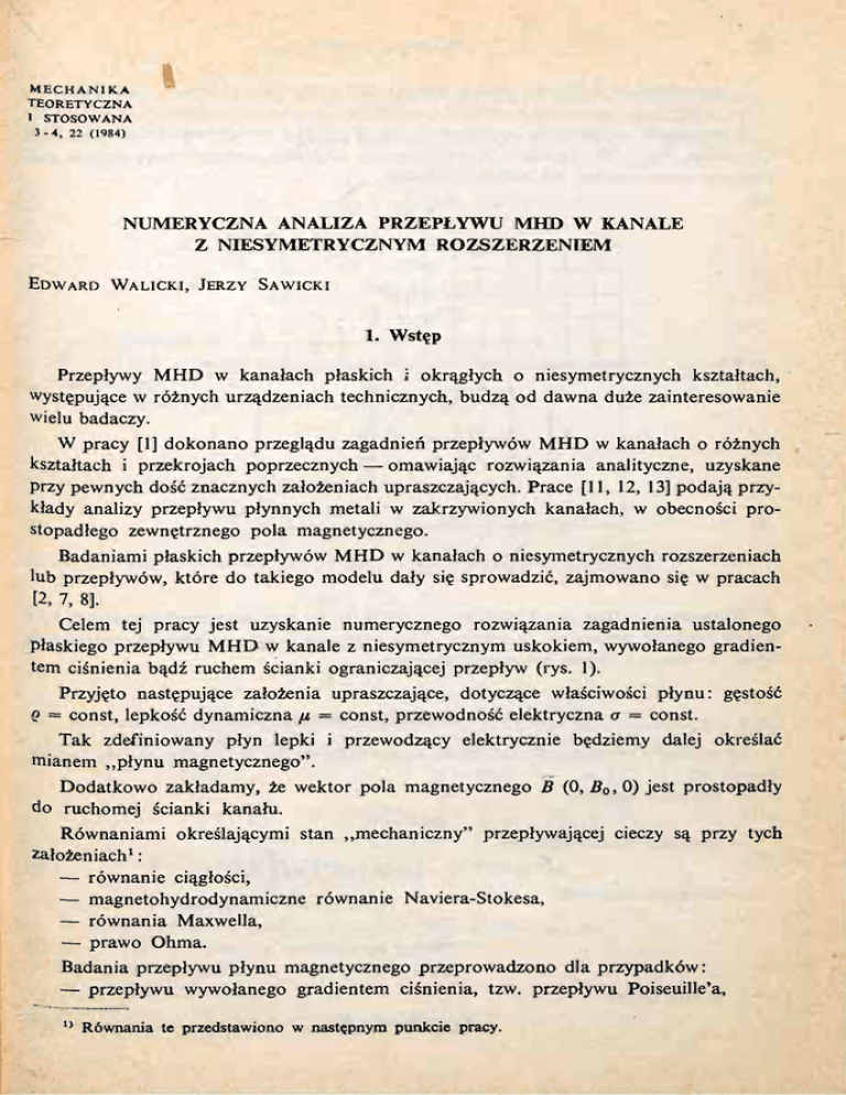 M E C H A N I K A T E O R E T Y C Z N A I S T O S O W A N A 3 4, 22 (1984) N U M E R Y C Z N A A N A L I Z A P R Z E P Ł Y W U M H D W K A N A L E Z N I E S Y M E T R Y C Z N Y M R O Z S Z E R Z E N I E M E D W A R D W A L I C K I , J E R Z Y S A W I C K I 1. Wstęp Przepływy M H D w kanałach płaskich i okrą głych o niesymetrycznych kształtach, wystę pują e c w róż nych urzą dzeniach technicznych, budzą od dawna duże zainteresowanie wielu badaczy. W pracy [1] dokonano przeglą du zagadnień przepływów M H D w kanałach o róż nych kształtach i przekrojach poprzecznych — omawiając rozwią zania analityczne, uzyskane przy pewnych dość znacznych założ eniach upraszczają cych. Prace [11, 12, 13] podają przy