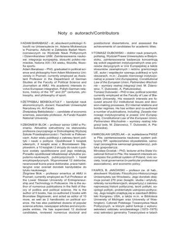Noty o autorach/Contributors <ADAM BARABASZ – dr, absolwent politologii i filozofii na Uniwersytecie im. Adama Mickiewicza w Poznaniu. Adiunkt w Zak³adzie Badañ Niemcoznawczych na Wydziale Nauk Politycznych i Dziennikarstwa UAM. Zainteresowania naukowe: integracja europejska, stosunki polsko-niemieckie, historia XIX i XX wieku, filozofia, filozofia sportu. Adam Barabasz – PhD, graduated in political science and philosophy from Adam Mickiewicz University in Poznañ; currently employed as Assistant Professor in the Department of German Studies at the Faculty of Political Science and Journalism at AMU. His academic interests involve European integration, Polish-German relations, history of the 19th and 20th centuries, philosophy, and philosophy of sport. <¯ETPISBAJ BEKBO£ATU£Y – kandydat nauk ekonomicznych, docent, Kazachski Uniwersytet Narodowy im. Al-Farabi. Zhetpisbay Bekbolatulyi –, candidate of economic sciences, associate professor, Al-Farabi Kazakh National University. <ZBIGNIEW BLOK – profesor senior UAM w Poznaniu. Aktualnie zatrudniony na stanowisku profesora zwyczajnego w Dolnoœl¹skiej Wy¿szej Szkole Przedsiêbiorczoœci i Techniki w Polkowicach. Autor wielu publikacji z zakresu teorii polityki i nauki o polityce. Opublikowa³ 5 ksi¹¿ek w³asnych, 2 ksi¹¿ki wraz z Bronis³awem Stêplowskim, a 10 ksi¹¿ek i 2 skrypty do nauki o polityce zosta³y opublikowane pod jego redakcj¹. Ponadto opublikowa³ kilkadziesi¹t artyku³ów popularno-naukowych, publicystycznych i hase³ encyklopedycznych. Wypromowa³ 12 doktorów, recenzowa³ liczne prace doktorskie, prace habilitacyjne oraz ocenia³ dorobek kandydatów do tytu³u naukowego. Zbigniew Blok – professor emeritus at AMU in Poznañ; currently employed as Full Professor at the Lower Silesian University of Entrepreneurship and Technology in Polkowice. He is the author of numerous publications in the field of theory of politics and political science. He is the author of 5 books, has co-authored 2 books with Bronis³aw Stêplowski, and acted as editor of 10 more, as well as 2 handbooks on political science. He has also published dozens of popular science articles, newspaper articles and encyclopedia entries. He has supervised 12 doctoral candidates, reviewed numerous doctoral and postdoctoral dissertations, and assessed the achievements of candidates for academic titles. <TOMASZ DUBOWSKI – doktor nauk prawnych, politolog, Wydzia³ Prawa Uniwersytetu w Bia³ymstoku, zainteresowania badawcze koncentruj¹ siê wokó³ zagadnieñ instytucjonalnych oraz procesów decyzyjnych w Unii Europejskiej a tak¿e stosunków zewnêtrznych i re¿imu granicznego UE, autor i wspó³autor szeregu publikacji w tych obszarach, m.in.: Zasada równowagi instytucjonalnej w prawie Unii Europejskiej, Constitutional Law of the European Union, Partnerstwo Wschodnie – wymiary realnej integracji (red. M. Zdanowicz, T. Dubowski, A. Piekutowska). Tomasz Dubowski – PhD in law, political scientist; currently employed at the Faculty of Law of Bia³ystok University. His research interests are focused around EU institutional issues and decision-making processes, EU internal relations and border regimes. He has written and co-authored a number of publications, including: Zasada równowagi instytucjonalnej w prawie Unii Europejskiej, Constitutional Law of the European Union, Partnerstwo Wschodnie – wymiary realnej integracji (eds. M. Zdanowicz, T. Dubowski, A. Piekutowska). <MIROS£AW GRZELAK – dr, wyk³adowca PWSZ w Pile; zainteresowania naukowe: system polityczny RP, spo³eczeñstwo obywatelskie, samorz¹d (szczególnie samorz¹d gospodarczy), polityka gospodarcza. Miros³aw Grzelak – PhD, lecturer at the State Vocational School in Pi³a. His research interests encompass the political system of Poland, civic society, local governance (in particular professional associations), and economic policy. <KAROL B. JANOWSKI – profesor zw. dr hab., absolwent Wydzia³u Filozoficzno-Historycznego Uniwersytetu we Wroc³awiu. Jego dorobek obejmuje ponad 270 prac (ksi¹¿ki, studia i artyku³y, referaty na konferencjach, ekspertyzy) z zakresu najnowszej historii politycznej, teorii polityki, socjologii polityki, problematyki ustrojowo-politycznej. Jego ksi¹¿ki znajduj¹ siê w zasobach Biblioteki Kongresu USA, a tak¿e m.in. w Bibliotece University of Michigan oraz University of Washington). Cz³onek Polskiego Towarzystwa Nauk Politycznych, w którym pe³ni³ funkcje z wyboru: sekretarz oddzia³u wroc³awskiego (1972–1975) oraz sekretarz generalny Towarzystwa w latach 294 Noty o autorach/Contributors 1988–1991. Honorowy cz³onek Polskiego Towarzystwa Nauk Politycznych. Hobby: literatura fantastyczno-naukowa, ¿eglarstwo morskie, podró¿e, fotografia, taniec. http://karol-b-janowski.waw.pl; e-mail: [email protected]. Karol B. Janowski – Full Professor of humanities, graduated from the Faculty of Philosophy and History at Wroc³aw University. His publications include over 270 works (books, studies and papers, conference papers, expert opinions) on modern political history, theory of politics, sociology of politics and the problems of political systems. His books are included in the collections of the USA Congress Library, the library of the University of Michigan and the University of Washington, among others. He is a member of the Polish Society of Political Science, to which he was elected secretary of the Wroc³aw section (1972–1975) and Secretary General of the Society (1988–1991). He is an Honorable Member of the Polish Society of Political Science. His hobbies include sci-fi literature, sailing, travel, photography and dancing. <MAREK JARENTOWSKI – absolwent politologii i prawa w Uniwersytecie Warszawskim, dr nauk politycznych (UW, 2004); adiunkt w Uniwersytecie Kardyna³a Stefana Wyszyñskiego w Warszawie, ekspert ds. legislacji w Kancelarii Senatu RP; autor ok. 30 artyku³ów i rozdzia³ów dotycz¹cych g³ównie systemów wyborczy