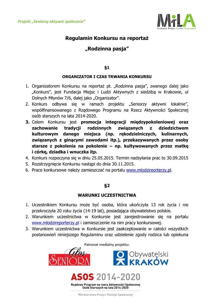 Projekt „Seniorzy aktywni społecznie” Regulamin Konkursu na reportaż „Rodzinna pasja” §1 ORGANIZATOR I CZAS TRWANIA KONKURSU 1. Organizatorem Konkursu na reportaż pt. „Rodzinna pasja”, zwanego dalej jako „Konkurs”, jest Fundacja Miejsc i Ludzi Aktywnych z siedzibą w Krakowie, ul Dolnych Młynów 7/6, dalej jako „Organizator”. 2. Konkurs odbywa się w ramach projektu „Seniorzy aktywni lokalnie”, współfinansowanego z Rządowego Programu na Rzecz Aktywności Społecznej osób starszych na lata 2014-2020. 3. Celem Konkursu jest promocja integracji międzypokoleniowej oraz zachowanie tradycji rodzinnych związanych z dziedzictwem kulturowym danego miejsca (np. rękodzielniczych, kulinarnych, związanych z ginącymi zawodami itp.), przekazywanych przez osoby starsze z pokolenia na pokolenie – np. kultywowanych przez matkę i córkę, dziadka i wnuczka itp. 4. Konkurs rozpoczyna się w dniu 25.05.2015. Termin nadsyłania prac to 30.09.2015 5. Rozstrzygnięcie Konkursu nastąpi do dnia 30.11.2015. 6. Prace konkursowe należy zamieszczać na portalu www.mlodzireorterzy.pl. §2 WARUNKI UCZESTNICTWA 1. Uczestnikiem Konkursu może być osoba, która ukończyła 13 rok życia i nie przekroczyła 20 roku życia (14-19 lat), posiadająca obywatelstwo polskie. 2. Warunkiem uczestnictwa w Konkursie jest zarejestrowanie się na portalu www.mlodzireporterzy.pl i zamieszczenie na nim pracy konkursowej. 3. Warunkiem uczestnictwa w Konkursie jest zaakceptowanie w całości wszystkich postanowień niniejszego Regulaminu oraz udzielenie zgody rodzica lub opiekuna Patronat medialny projektu: Projekt „Seniorzy aktywni społecznie” 4. 5. 6. 7. prawnego na udział w Konkursie Uczestnika, który nie ukończył 18 lat, poprzez portal www.mlodzireporterzy.pl. Z udziału w Konkursie wyłączeni są pracownicy i współpracownicy Organizatora oraz osoby pozostające z Organizatorem w stałym stosunku zlecenia. Organizator nie ponosi odpowiedzialności za zgłoszenia, które nie dotarły do niego z przyczyn od niego niezależnych. Organizator nie ponosi odpowiedzialności za podanie nieprawdziwych danych lub danych osoby trzeciej przez Uczestników. Podanie nieprawdziwych danych skutkuje odebraniem prawa do nagrody. Udział w Konkursie jest bezpłatny. §3 ZASADY KONKURSU 1. Reportaże powinny opisywać integrację międzypokoleniową oraz zachowanie tradycji rodzinnych związanych z dziedzictwem kulturowym danego miejsca (np. rękodzielniczych, kulinarnych, związanych z ginącymi zawodami itp.), przekazywanych przez osoby starsze z pokolenia na pokolenie – np. kultywowanych przez matkę i córkę, dziadka i wnuczka itp. 2. Kategorie konkursowe: - reportaż literacki Uczestnik przedstawia pracę konkursową w formie tekstu, którego długość powinna wynosić nie mniej niż 1500 znaków ze spacjami i nie więcej niż 5000 znaków ze spacjami. Do reportażu literackiego można załączyć zdjęcia (maksymalnie pięć sztuk, minimalna rozdzielczość: 1000 pikseli na dłuższym boku), które będą dodatkowym atutem. - reportaż multimedialny Uczestnik przedstawia pracę konkursową w formie filmu lub prezentacji multimedialnej, która może łączyć w sobie tekst, zdjęcia, animacje, filmy. Patronat medialny projektu: Projekt „Seniorzy aktywni społecznie” Reportaż multimedialny powinien mieć formę jednego pliku możliwego do automatycznego odtworzenia (dopuszczalne formaty: AVI, MP4, WMV). Czas odtwarzania materiału powinien być nie krótszy niż 1 minuta i nie dłuższy niż 5 minut. Plik należy zamieścić w serwisie YouTube.com. 3. Do Konkursu mogą być zgłaszane tylko reportaże napisane osobiście przez Uczestnika, do których przysługują Uczestnikowi nieograniczone autorskie prawa osobiste i majątkowe, a także nie naruszające praw osób trzecich. Zgłaszane reportaże nie mogą opisywać treści pornograficznych, opisujących sceny brutalne, propagujące zachowania sprzeczne z prawem. 4. Uczestnik zgłasza reportaż poprzez portal www.mlodzireporterzy.pl. Sposób zamieszczania: a) Należy zarejestrować się na portalu www.mlodzireporterzy.pl b) Następnie należy zalogować się na swój profil i wejść w niego klikając na niebieskie pole na górze strony, które pojawia się po zalogowaniu Patronat medialny projektu: Projekt „Seniorzy aktywni społecznie” c) Po wejściu na swój profil należy dodać reportaż przez kliknięcie odpowiedniej ikonki „dodaj nowy reportaż” oraz wypełnienie odpowiednich rubryk i wgranie reportażu. d) Podczas zamieszczania reportażu należy zwrócić szczególną uwagę na trzy kwestie: a. wybór odpowiedniej kategorii z rozwijanej listy (Konkurs „Rodzinna pasja” – reportaż literacki” lub Konkurs „Rodzinna pasja” – reportaż multimedialny) Patronat medialny projektu: Projekt „Seniorzy aktywni społecznie” b. ustawienie statusu reportażu „do zatwierdzenia”, c. reportaże multimedialne należy zamieścić najpierw na portalu www.youtube.com, a następnie wstawić adres pliku (link) w odpowiednim okienku formularza. W razie problemów prosimy o kontakt: [email protected] Patronat medialny projektu: Projekt „Seniorzy aktywni społecznie” 5. Uczestnik może zgłosić do Konkursu nieograniczoną ilość reportaży wpisujących się w tematykę konkursu. 6. Warunkiem udziału w Konkursie jest rejestracja na portalu www.mlodzireporterzy.pl oraz podanie następujących danych: a) tytuł dzieła, b) imię i nazwisko Uczestnika konkursu - autora, c) adres zamieszkania 7. Organizator Konkursu zastrzega sobie prawo do wyłączenia z udziału w Konkursie reportaży nie spełniających kryteriów podanych w §3 punkt 2 oraz reportaży, które w inny sposób naruszają niniejszy regulamin, w szczególności postanowienia objęte §3 punkt 3. 8. Zgłoszenie reportażu do Konkursu jest równoznaczne z oświadczeniem Uczestnika, że przysługują mu nieograniczone autorskie prawa osobiste i majątkowe do 
