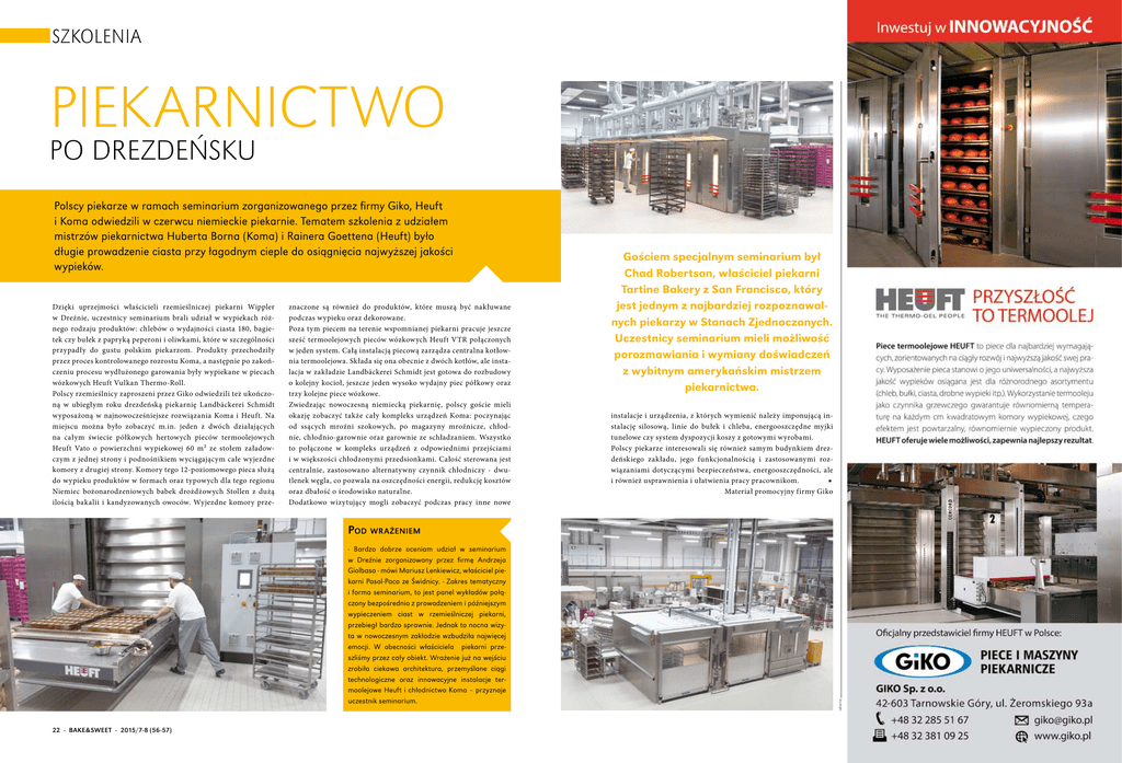 szkolenia Piekarnictwo po drezdeńsku Polscy piekarze w ramach seminarium zorganizowanego przez firmy Giko, Heuft i Koma odwiedzili w czerwcu niemieckie piekarnie. Tematem szkolenia z udziałem mistrzów piekarnictwa Huberta Borna (Koma) i Rainera Goettena (Heuft) było długie prowadzenie ciasta przy łagodnym cieple do osiągnięcia najwyższej jakości wypieków. znaczone są również do produktów, które muszą być nakłuwane podczas wypieku oraz dekorowane. Poza tym piecem na terenie wspomnianej piekarni pracuje jeszcze sześć termoolejowych pieców wózkowych Heuft VTR połączonych w jeden system. Całą instalacją piecową zarządza centralna kotłownia termoolejowa. Składa się ona obecnie z dwóch kotłów, ale instalacja w zakładzie Landbäckerei Schmidt jest gotowa do rozbudowy o kolejny kocioł, jeszcze jeden wysoko wydajny piec półkowy oraz trzy kolejne piece wózkowe. Zwiedzając nowoczesną niemiecką piekarnię, polscy goście mieli okazję zobaczyć także cały kompleks urządzeń Koma: poczynając od ssących mroźni szokowych, po magazyny mroźnicze, chłodnie, chłodnio-garownie oraz garownie ze schładzaniem. Wszystko to połączone w kompleks urządzeń z odpowiednimi przejściami i w większości chłodzonymi przedsionkami. Całość sterowana jest centralnie, zastosowano alternatywny czynnik chłodniczy - dwutlenek węgla, co pozwala na oszczędności energii, redukcję kosztów oraz dbałość o środowisko naturalne. Dodatkowo wizytujący mogli zobaczyć podczas pracy inne nowe Pod wrażeniem - Bardzo dobrze oceniam udział w seminarium w Dreźnie zorganizowany przez firmę Andrzeja Giolbasa - mówi Mariusz Lenkiewicz, właściciel piekarni Pasol-Paco ze Świdnicy. - Zakres tematyczny i forma seminarium, to jest panel wykładów połączony bezpośrednio z prowadzeniem i późniejszym wypieczeniem ciast w rzemieślniczej piekarni, przebiegł bardzo sprawnie. Jednak to nocna wizyta w nowoczesnym zakładzie wzbudziła najwięcej emocji. W obecności właściciela piekarni przeszliśmy przez cały obiekt. Wrażenie już na wejściu zrobiła ciekawa architektura, przemyślane ciągi technologiczne oraz innowacyjne instalacje termoolejowe Heuft i chłodnictwo Koma – przyznaje uczestnik seminarium. 22 · BAKE&SWEET · 2015/7-8 (56-57) instalacje i urządzenia, z których wymienić należy imponującą instalację silosową, linie do bułek i chleba, energooszczędne myjki tunelowe czy system dyspozycji koszy z gotowymi wyrobami. Polscy piekarze interesowali się również samym budynkiem drezdeńskiego zakładu, jego funkcjonalnością i zastosowanymi rozwiązaniami dotyczącymi bezpieczeństwa, energooszczędności, ale i również usprawnienia i ułatwienia pracy pracownikom. ■ Materiał promocyjny firmy Giko reklama Dzięki uprzejmości właścicieli rzemieślniczej piekarni Wippler w Dreźnie, uczestnicy seminarium brali udział w wypiekach różnego rodzaju produktów: chlebów o wydajności ciasta 180, bagietek czy bułek z papryką peperoni i oliwkami, które w szczególności przypadły do gustu polskim piekarzom. Produkty przechodziły przez proces kontrolowanego rozrostu Koma, a następnie po zakończeniu procesu wydłużonego garowania były wypiekane w piecach wózkowych Heuft Vulkan Thermo-Roll. Polscy rzemieślnicy zaproszeni przez Giko odwiedzili też ukończoną w ubiegłym roku drezdeńską piekarnię Landbäckerei Schmidt wyposażoną w najnowocześniejsze rozwiązania Koma i Heuft. Na miejscu można było zobaczyć m.in. jeden z dwóch działających na całym świecie półkowych hertowych pieców termoolejowych Heuft Vato o powierzchni wypiekowej 60 m² ze stołem załadowczym z jednej strony i podnośnikiem wyciągającym całe wyjezdne komory z drugiej strony. Komory tego 12-poziomowego pieca służą do wypieku produktów w formach oraz typowych dla tego regionu Niemiec bożonarodzeniowych babek drożdżowych Stollen z dużą ilością bakalii i kandyzowanych owoców. Wyjezdne komory prze- Gościem specjalnym seminarium był Chad Robertson, właściciel piekarni Tartine Bakery z San Francisco, który jest jednym z najbardziej rozpoznawalnych piekarzy w Stanach Zjednoczonych. Uczestnicy seminarium mieli możliwość porozmawiania i wymiany doświadczeń z wybitnym amerykańskim mistrzem piekarnictwa. 2015/7-8 (56-57) · BAKE&SWEET · 23