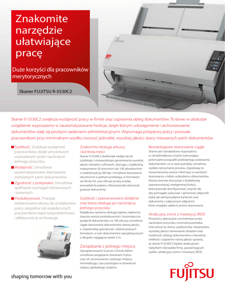 Znakomite narzędzie ułatwiające pracę Duże korzyści dla pracowników merytorycznych Skaner FUJITSU fi-5530C2 Skaner fi-5530C2 zwiększa wydajność pracy w firmie oraz usprawnia obieg dokumentów. To łatwe w obsłudze urządzenie wyposażono w zautomatyzowane funkcje, dzięki którym udostępnianie i archiwizowanie dokumentów stały się prostymi zadaniami administracyjnymi. Wspomaga przepływy pracy i pozwala pracownikom przy minimalnym wysiłku tworzyć jednolite, wysokiej jakości skany mieszanych partii dokumentów. Szybkość. Zwiększa wydajność pracowników dzięki procedurom wyzwalanym przez naciśnięcie jednego przycisku. Wydajność. Umożliwia zautomatyzowane skanowanie mieszanych partii dokumentów. Zgodność z przepisami. Umożliwia spełnianie wymagań biznesowych i prawnych. Znakomita obsługa arkuszy i kontrola treści Skaner fi-5530C2 doskonale nadaje się do szybkiego i niezawodnego generowania wysokiej jakości obrazów cyfrowych, skanując z szybkością maksymalnie 50 stron/min lub 100 obrazów/min z rozdzielczością 200 dpi. Umożliwia skanowanie obustronne w jednym przebiegu, w formatach od A8 do A3, oraz oferuje prostą ścieżkę prowadzenia papieru, która pozwala skanować grubsze dokumenty. Szybkość i zaawansowane działanie Produktywność. Przesyła zeskanowane obrazy do przepływów oraz łatwa obsługa po naciśnięciu jednego przycisku pracy zespołów lub pojedynczych pracowników bądź bezproblemowo Wyjątkowo sprawna obsługa papieru zapewnia znaczny wzrost produktywności. Automatyczny i efektywnie je archiwizuje. podajnik dokumentów na 100 arkuszy umożliwia ciągłe skanowanie dokumentów różnej jakości, o niejednolitej gramaturze i zróżnicowanych formatach, w tym dokumentów specjalistycznych o długości sięgającej nawet 3 m. Zarządzanie z jednego miejsca Oprogramowanie Scanner Central Admin umożliwia zarządzanie skanerami Fujitsu oraz ich serwisowanie z jednego miejsca, minimalizując czas przestojów w dowolnym miejscu globalnego systemu. Bezobsługowe skanowanie ciągłe Skaner jest standardowo wyposażony w ultradźwiękowy czujnik wykrywający potencjalne przypadki podwójnego podawania dokumentów, co w razie potrzeby umożliwia szybkie zatrzymanie procesu. Zapobiega to niezamierzonej utracie informacji w wynikach skanowania, a także uszkodzeniu dokumentów. Można również skorzystać z dodatkowej zaawansowanej, inteligentnej funkcji, która pozwala skonfigurować czujniki tak, aby pomagały wykrywać i ignorować załączniki (takie jak samoprzylepne karteczki oraz dokumenty z załączonym zdjęciem), które mogłyby zakłócić proces skanowania. Atrakcyjny zwrot z inwestycji (ROI) Procedury operacyjne uruchamiane przez naciśnięcie przycisku, minimalna potrzeba interwencji ze strony użytkownika, niezawodne, wysokiej jakości skanowanie obrazów oraz możliwość obsługi dokumentów o dowolnej wielkości i papierów różnej jakości sprawia, że skaner fi-5530C2 będzie atrakcyjnym nabytkiem dla każdej firmy, gwarantującym szybki i atrakcyjny zwrot z inwestycji (ROI). Oprogramowanie oferowane w pakiecie Firma Fujitsu opracowała najlepszy w swojej klasie sterownik skanera oraz oprogramowanie do skanowania i przetwarzania obrazu Oprogramowanie PaperStream IP — zaawansowane udoskonalanie jakości obrazu Oprogramowanie PaperStream Capture — rozszerzone funkcje skanowania PaperStream IP to sterownik skanera fi-5530C2. Sterownik ten jest w pełni zgodny z interfejsami TWAIN i ISIS, stanowiącymi standard branżowy. Ponadto zawiera w konfiguracji standardowej zaawansowane funkcje przetwarzania obrazu, które automatycznie usuwają szumy i wzór tła oraz powiększają znaki, umożliwiając generowanie wyjątkowo wyraźnych, wysokiej jakości obrazów, które użytkownik może bezpośrednio zaimportować do przepływu pracy. Oprogramowanie PaperStream Capture to łatwe w obsłudze narzędzie do skanowania, które pozwala użytkownikom łatwo konfigurować procedury skanowania, obejmujące wszystkie ustawienia i parametry konfiguracyjne niezbędne do sterowania tym procesem, od samego skanowania po przekazanie obrazu do przepływu pracy zdefiniowanego przez użytkownika lub firmę. Sterownik PaperStream IP jest wyposażony w intuicyjny, łatwy w obsłudze interfejs, który można przełączać między trybem administratora i użytkownika, aby uprościć proces skanowania i ograniczyć błędy popełniane przez użytkownika. Utworzone profile można później uruchamiać jednym kliknięciem, a te najczęściej używane podłączyć do przycisku skanowania umieszczonego na panelu przednim skanera fi-5530C2, aby uprościć cały proces. W sterowniku PaperStream IP wprowadzono także nowy tryb Assisted Scanning, w którym — zamiast ręcznie dostrajać kolejne parametry skanowania — użytkownik może wzrokowo wybrać spośród obrazów widocznych na stronie ten o najlepszej jakości. Specyfikacje Model Obsługiwane systemy operacyjne Typ skanera Tryby skanowania Typ czujnika obrazu Źródło światła Rozmiar dokumentu fi-5530C2 Więcej informacji na stronie http://emea.fujitsu.com/fiscannerfaqs/ Automatyczny podajnik dokumentów (ADF) Jednostronne / dwustronne, w kolorze / w skali szarości / mono 2 matryce Colour CCD Lampa wyładowcza z białą zimną katodą Minimalnie: A8 w trybie portretowym (52 x 74 mm) / maksymalnie: A3 w trybie portretowym (297 x 420 mm) Skanowanie długich dokumentów: 3048 mm*1 52–127 g/m2 Zalecana gramatura papieru Szybkość skanowania (A4 w trybie pejzażowym)*2 Jednostronne: 50 stron/min (200 dpi), dwustronne: 100 obrazów/min (200 dpi) W kolorze*3 / w skali szarości*3 / mono Szybkość skanowania (A4 w trybie portretowym)*2 Jednostronne: 35 stron/min (200 dpi), dwustronne: 70 obrazów/min (200 dpi) W kolorze*3/ w skali szarości*3/mono *4 2 Pojemność podajnika papieru 100 arkuszy (A4: 80 g/m )/50 arkuszy (A3: 80 g/m2) (automatyczny podajnik dokumentów z możliwością do