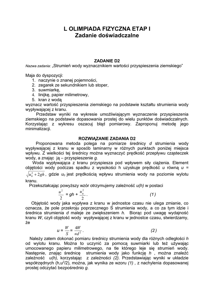 L OLIMPIADA FIZYCZNA ETAP I Zadanie doświadczalne Nazwa zadania: ZADANIE D2 „Strumień wody wyznacznikiem wartości przyspieszenia ziemskiego” Maja do dyspozycji: 1. naczynie o znanej pojemności, 2. zegarek ze sekundnikiem lub stoper, 3. suwmiarkę, 4. linijkę, papier milimetrowy, 5. kran z wodą wyznacz wartość przyspieszenia ziemskiego na podstawie kształtu strumienia wody wypływającej z kranu. Przedstaw wyniki na wykresie umożliwiającym wyznaczenie przyspieszenia ziemskiego na podstawie dopasowania prostej do wielu punktów doświadczalnych. Korzystając z wykresu oszacuj błąd pomiarowy. Zaproponuj metodę jego minimalizacji. ROZWIĄZANIE ZADANIA D2 Proponowana metoda polega na pomiarze średnicy d strumienia wody wypływającej z kranu w sposób laminarny w różnych punktach poniżej miejsca wpływu. Z wielkości tej średnicy można wyznaczyć prędkość przepływu cząsteczek wody, a znając ją – przyspieszenie g. Woda wypływająca z kranu przyspiesza pod wpływem siły ciążenia. Element objętości wody podczas spadku z wysokości h uzyskuje prędkość u równą u = u 02 + 2 gh , gdzie u0 jest prędkością wpływu strumienia wody na poziomie wylotu kranu. Przekształcając powyższy wzór otrzymujemy zależność u(h) w postaci u 02 u2 = gh + . (1 ) 2 2 Objętość wody jaka wypływa z kranu w jednostce czasu nie ulega zmianie, co oznacza, że pole przekroju poprzecznego S strumienia wody, a co za tym idzie i średnica strumienia d maleje ze zwiększeniem h. Biorąc pod uwagę wydajność kranu W, czyli objętość wody wypływającej z kranu w jednostce czasu, stwierdzamy, że W 4W u= = . (2 ) S πd 2 Należy zatem dokonać pomiaru średnicy strumienia wody dla różnych odległości h od wylotu kranu. Można to uczynić za pomocą suwmiarki lub też używając umocowanego papieru milimetrowego, na tle którego leje się strumień wody. Następnie, znając średnicę strumienia wody jako funkcję h , można znaleźć zależność u(h), korzystając z zależności (2). Przedstawiając wyniki w układzie współrzędnych (h,u2/2), można, jak wynika ze wzoru (1) , z nachylenia dopasowanej prostej odczytać bezpośrednio g. Procedura doświadczalna powinna zatem obejmować w pierwszym kroku wyznaczenie wydajności W dla naszego kranu. Należy ustawić laminarny przepływ wody i dobrać taką jego wielkość , aby można było zaobserwować mierzalne zwężanie się strumienia wody. Następnie należy zmierzyć czas napełniania naczynia o znanej pojemności. Potem można przystąpić do wyznaczania zależności średnicy strumienia wody od wysokości h. Tu należy zaznaczyć, że należy dokonać pomiarów tylko dla tych odległości od wylotu kranu, dla których strumień wody ma przekrój kołowy i nie rozpada się na pojedyncze krople. Po zakończeniu pomiarów można zmierzyć ponownie wydajność kranu, aby w ten sposób sprawdzić czy nie zmieniła się w czasie eksperymentu. Przykładowe wyniki dla wydajności kranu W = 0,0000595 m3/s (= 3,6 l/min) przedstawione są w tabeli 1. Tabela 1. h [m] 0,00 0,05 0,10 0,15 0,20 d [m] 0,0090 0,0075 0,0068 0,0063 0,0058 S [m2] 6,36E-05 4,42E-05 3,63E-05 3,12E-05 2,64E-05 u [m/s] 0,94 1,35 1,64 1,91 2,25 u2/2 [m2/s2] 0,44 0,91 1,34 1,82 2,54 Graficzna reprezentacja tych wyników przedstawiona jest na ryc.5 Ryc.5 Dopasowanie prostej daje tu wartość g = 10,2 m/s2. Niepewność otrzymanego wyniku wynosi ok. 6%. Jest to wynik stosunkowo dokładny, biorąc pod uwagę prostotę pomiaru. Z prostych metod zwiększenia dokładności wyniku należy wymienić wykonanie pomiarów dla różnych wydajności kranu jak również zwiększenie liczby punktów pomiarowych dla danej serii pomiarowej. To ostatnie może jednak nastręczyć nieco trudności, gdyż i tak różnice w wielkości średnic zmierzonych dla większych wartości h są bardzo niewielkie. Punktacja Pomysł i poprawne rozwiązanie teoretyczne –8 pkt Część eksperymentalna: a) wykonanie (możliwych do powtórzenia) pomiarów – 5 pkt b) zgodność metody pomiaru z rozwiązaniem teoretycznym – 3 pkt c) poprawny wynik końcowy wraz z analizą błędu pomiaru – 2 pkt Wykres – 2 pkt Źródło: Zadanie pochodzi z czasopisma „Fizyka w Szkole” 00/01r. Komitet Okręgowy Olimpiady Fizycznej w Szczecinie www.of.szc.pl