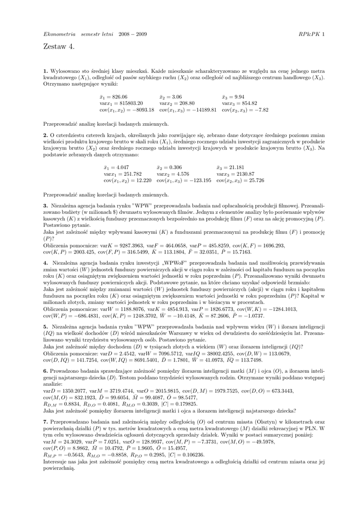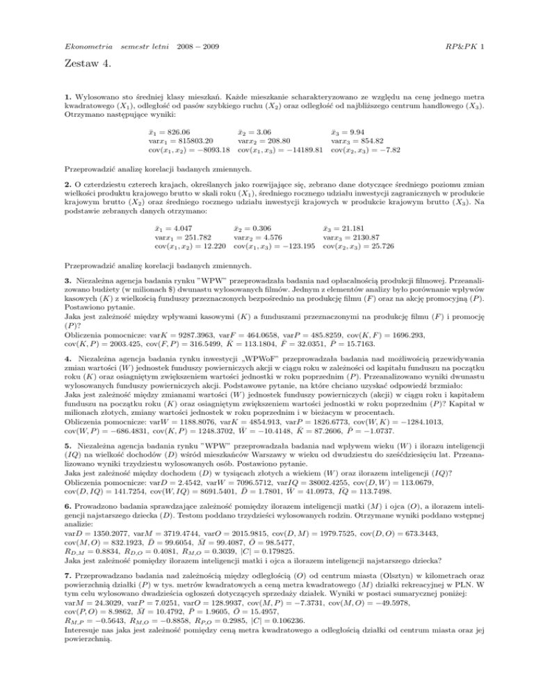 Ekonometria semestr letni 2008 − 2009 RP &P K 1 Zestaw 4. 1. Wylosowano sto średniej klasy mieszkań. Każde mieszkanie scharakteryzowano ze względu na cenę jednego metra kwadratowego (X1 ), odległość od pasów szybkiego ruchu (X2 ) oraz odległość od najbliższego centrum handlowego (X3 ). Otrzymano następujące wyniki: x̄1 = 826.06 x̄2 = 3.06 x̄3 = 9.94 varx1 = 815803.20 varx2 = 208.80 varx3 = 854.82 cov(x1 , x2 ) = −8093.18 cov(x1 , x3 ) = −14189.81 cov(x2 , x3 ) = −7.82 Przeprowadzić analizę korelacji badanych zmiennych. 2. O czterdziestu czterech krajach, określanych jako rozwijające się, zebrano dane dotyczące średniego poziomu zmian wielkości produktu krajowego brutto w skali roku (X1 ), średniego rocznego udziału inwestycji zagranicznych w produkcie krajowym brutto (X2 ) oraz średniego rocznego udziału inwestycji krajowych w produkcie krajowym brutto (X3 ). Na podstawie zebranych danych otrzymano: x̄1 = 4.047 x̄2 = 0.306 x̄3 = 21.181 varx1 = 251.782 varx2 = 4.576 varx3 = 2130.87 cov(x1 , x2 ) = 12.220 cov(x1 , x3 ) = −123.195 cov(x2 , x3 ) = 25.726 Przeprowadzić analizę korelacji badanych zmiennych. 3. Niezależna agencja badania rynku ”WPW” przeprowadzała badania nad opłacalnością produkcji filmowej. Przeanalizowano budżety (w milionach $) dwunastu wylosowanych filmów. Jednym z elementów analizy było porównanie wpływów kasowych (K) z wielkością funduszy przeznaczonych bezpośrednio na produkcję filmu (F ) oraz na akcję promocyjną (P ). Postawiono pytanie. Jaka jest zależność między wpływami kasowymi (K) a funduszami przeznaczonymi na produkcję filmu (F ) i promocję (P )? Obliczenia pomocnicze: varK = 9287.3963, varF = 464.0658, varP = 485.8259, cov(K, F ) = 1696.293, cov(K, P ) = 2003.425, cov(F, P ) = 316.5499, K̄ = 113.1804, F̄ = 32.0351, P̄ = 15.7163. 4. Niezależna agencja badania rynku inwestycji „WPWoF” przeprowadzała badania nad możliwością przewidywania zmian wartości (W ) jednostek funduszy powierniczych akcji w ciągu roku w zależności od kapitału funduszu na początku roku (K) oraz osiagniętym zwiększeniem wartości jednostki w roku poprzednim (P ). Przeanalizowano wyniki dwunastu wylosowanych funduszy powierniczych akcji. Podstawowe pytanie, na które chciano uzyskać odpowiedź brzmiało: Jaka jest zależność między zmianami wartości (W ) jednostek funduszy powierniczych (akcji) w ciągu roku i kapitałem funduszu na początku roku (K) oraz osiagniętym zwiększeniem wartości jednostki w roku poprzednim (P )? Kapitał w milionach złotych, zmiany wartości jednostek w roku poprzednim i w bieżacym w procentach. Obliczenia pomocnicze: varW = 1188.8076, varK = 4854.913, varP = 1826.6773, cov(W, K) = −1284.1013, cov(W, P ) = −686.4831, cov(K, P ) = 1248.3702, W̄ = −10.4148, K̄ = 87.2606, P̄ = −1.0737. 5. Niezależna agencja badania rynku ”WPW” przeprowadzała badania nad wpływem wieku (W ) i ilorazu inteligencji (IQ) na wielkość dochodów (D) wśród mieszkańców Warszawy w wieku od dwudziestu do sześćdziesięciu lat. Przeanalizowano wyniki trzydziestu wylosowanych osób. Postawiono pytanie. Jaka jest zależność między dochodem (D) w tysiącach złotych a wiekiem (W ) oraz ilorazem inteligencji (IQ)? Obliczenia pomocnicze: varD = 2.4542, varW = 7096.5712, varIQ = 38002.4255, cov(D, W ) = 113.0679, ¯ = 113.7498. cov(D, IQ) = 141.7254, cov(W, IQ) = 8691.5401, D̄ = 1.7801, W̄ = 41.0973, IQ 6. Prowadzono badania sprawdzające zależność pomiędzy ilorazem inteligencji matki (M ) i ojca (O), a ilorazem inteligencji najstarszego dziecka (D). Testom poddano trzydzieści wylosowanych rodzin. Otrzymane wyniki poddano wstępnej analizie: varD = 1350.2077, varM = 3719.4744, varO = 2015.9815, cov(D, M ) = 1979.7525, cov(D, O) = 673.3443, cov(M, O) = 832.1923, D̄ = 99.6054, M̄ = 99.4087, Ō = 98.5477, RD,M = 0.8834, RD,O = 0.4081, RM,O = 0.3039, |C| = 0.179825. Jaka jest zależność pomiędzy ilorazem inteligencji matki i ojca a ilorazem inteligencji najstarszego dziecka? 7. Przeprowadzano badania nad zależnością między odległością (O) od centrum miasta (Olsztyn) w kilometrach oraz powierzchnią działki (P ) w tys. metrów kwadratowych a ceną metra kwadratowego (M ) działki rekreacyjnej w PLN. W tym celu wylosowano dwadzieścia ogłoszeń dotyczących sprzedaży działek. Wyniki w postaci sumarycznej poniżej: varM = 24.3029, varP = 7.0251, varO = 128.9937, cov(M, P ) = −7.3731, cov(M, O) = −49.5978, cov(P, O) = 8.9862, M̄ = 10.4792, P̄ = 1.9605, Ō = 15.4957, RM,P = −0.5643, RM,O = −0.8858, RP,O = 0.2985, |C| = 0.106236. Interesuje nas jaka jest zależność pomiędzy ceną metra kwadratowego a odległością działki od centrum miasta oraz jej powierzchnią. Ekonometria semestr letni 2008 − 2009 RP &P K 2 8. W pewnym regionie Polski przeprowadzano badania nad zależnością między wielkością bezrobocia (B) (w procentach) i udziałem procentowym osób z wyższym wykształceniem (W ) a wynikiem wyborczym partii ”TTD” (P ). Wyniki dla dziesięciu wylosowanych okręgów podano poniżej. varP = 235.9532, varB = 134.5497, varW = 8.3771, cov(P, B) = −160.6396, cov(P, W ) = 38.49, cov(B, W ) = −19.573, P̄ = 13.3402, B̄ = 20.8861, W̄ = 4.6436, RP,B = −0.9016, RP,W = 0.8657, RB,W = −0.583, |C| = 0.007873. Interesuje nas jaka jest zależność pomiędzy wynikiem partii ”TTD” a bezrobociem i udziałem procentowym osób z wyższym wykształceniem. 9. Panuje opinia, że im wolniej czytamy tym lepiej rozumiemy i zapamiętujemy czytany tekst. Chcąc sprawdzić słuszność takiej opinii przeprowadzono testy sprawdzające szybkość czytania (S) mierzoną przeciątną liczbą słów na minutę i procentowe zrozumienie (Z) czytanego tekstu, poza szybkością czytania mierzono również przeciętną liczbą znaków czytanych w czasie jednej fiksacji (F ) (chwilowe zatrzymanie spojrzenia). Sumaryczne wyniki dla czterdziestu osób poniżej