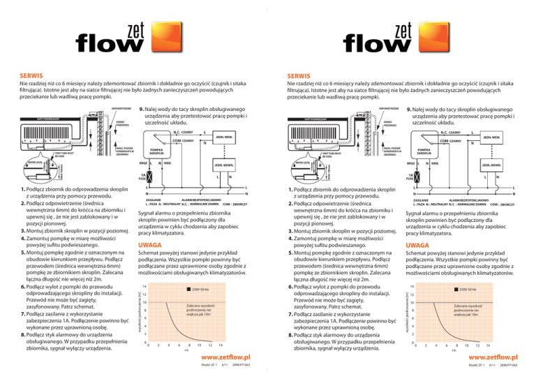 SERWIS SERWIS Nie rzadziej niż co 6 miesięcy należy zdemontować zbiornik i dokładnie go oczyścić (czujnik i sitaka filtrująca). Istotne jest aby na siatce filtrującej nie było żadnych zanieczyszczeń powodujących przeciekanie lub wadliwą pracę pompki. Nie rzadziej niż co 6 miesięcy należy zdemontować zbiornik i dokładnie go oczyścić (czujnik i sitaka filtrująca). Istotne jest aby na siatce filtrującej nie było żadnych zanieczyszczeń powodujących przeciekanie lub wadliwą pracę pompki. ODPOWIETRZENIE SUFIT PODWIESZANY KONIEC PRZEWODU 9. Nalej wody do tacy skroplin obsługiwanego urządzenia aby przetestować pracę pompki i szczelność układu. ODPOWIETRZENIE SUFIT PODWIESZANY KONIEC PRZEWODU 9. Nalej wody do tacy skroplin obsługiwanego urządzenia aby przetestować pracę pompki i szczelność układu. CZARNY CZARNY JEDN. WEW. JEDN. WEWN. FUSE ALARM/BEZPOTENCJAłOWO ZASILANIE NEUTRALNY NORMALNIE ZAMKN FAZA ZBIORCZY Sygnał alarmu o przepełnieniu zbiornika skroplin powinien być podłączony dla urządzenia w cyklu chodzenia aby zapobiec pracy klimatyzatora. UWAGA Schemat powyżej stanowi jedynie przykład podłączenia. Wszystkie pompki powinny być podłączane przez uprawnione osoby zgodnie z możliwościami obsługiwanych klimatyzatorów. 14 230V 50 Hz 12 10 Zalecana wysokość podnoszenia nie większa jak 10m 8 6 4 2 0 0 2 4 6 8 l/h 10 12 14 www.zetflow.pl Model: ZF-1 6/11 2898/FP1063 WATER LEVEL 150mm VENT TUBE MUST BE USED NIEB. BRQZ wysokość podnoszenia [m] 1. Podłącz zbiornik do odprowadzenia skroplin z urządzenia przy pomocy przewodu. 2. Podłącz odpowietrzenie (średnica wewnętrzna 6mm) do króćca na zbiorniku i upewnij się , że nie jest zablokowany i w pozycji pionowej. 3. Montuj zbiornik skroplin w pozycji poziomej. 4. Zamontuj pompkę w miarę możliwości powyżej sufitu podwieszanego. 5. Montuj pompkę zgodnie z oznaczonym na obudowie kierunkiem przepływu. Podłącz przewodem (średnica wewnętrzna 6mm) pompkę ze zbiornikiem skroplin. Zalecana łączna długość nie więcej niż 2m. 6. Podłącz wylot z pompki do przewodu odprowadzającego skropliny do instalacji. Przewód nie może być zagięty, zasyfonowany. Patrz schemat. 7. Podłącz zasilanie z wykorzystanie zabezpieczenia 1A. Podłączenie powinno być wykonane przez uprawnioną osobę. 8. Podłącz styk alarmowy do urządzenia obsługiwanego. W przypadku przepełnienia zbiornika, sygnał wyłączy urządzenia. POMPKA SKROPLIN MAKS. POZIOM KONDENSATU W ZBIORNIKU MAX 100mm MAKS. POZIOM KONDENSATU W ZBIORNIKU MAX 100mm WATER LEVEL 150mm VENT TUBE MUST BE USED JEDN. WEW. CZARNY 1. Podłącz zbiornik do odprowadzenia skroplin z urządzenia przy pomocy przewodu. 2. Podłącz odpowietrzenie (średnica wewnętrzna 6mm) do króćca na zbiorniku i upewnij się , że nie jest zablokowany i w pozycji pionowej. 3. Montuj zbiornik skroplin w pozycji poziomej. 4. Zamontuj pompkę w miarę możliwości powyżej sufitu podwieszanego. 5. Montuj pompkę zgodnie z oznaczonym na obudowie kierunkiem przepływu. Podłącz przewodem (średnica wewnętrzna 6mm) pompkę ze zbiornikiem skroplin. Zalecana łączna długość nie więcej niż 2m. 6. Podłącz wylot z pompki do przewodu odprowadzającego skropliny do instalacji. Przewód nie może być zagięty, zasyfonowany. Patrz schemat. 7. Podłącz zasilanie z wykorzystanie zabezpieczenia 1A. Podłączenie powinno być wykonane przez uprawnioną osobę. 8. Podłącz styk alarmowy do urządzenia obsługiwanego. W przypadku przepełnienia zbiornika, sygnał wyłączy urządzenia. POMPKA SKROPLIN NIEB. BRQZ JEDN. WEWN. FUSE ALARM/BEZPOTENCJAłOWO ZASILANIE NEUTRALNY NORMALNIE ZAMKN FAZA ZBIORCZY Sygnał alarmu o przepełnieniu zbiornika skroplin powinien być podłączony dla urządzenia w cyklu chodzenia aby zapobiec pracy klimatyzatora. UWAGA Schemat powyżej stanowi jedynie przykład podłączenia. Wszystkie pompki powinny być podłączane przez uprawnione osoby zgodnie z możliwościami obsługiwanych klimatyzatorów. 14 wysokość podnoszenia [m] CZARNY 230V 50 Hz 12 10 Zalecana wysokość podnoszenia nie większa jak 10m 8 6 4 2 0 0 2 4 6 8 l/h 10 12 14 www.zetflow.pl Model: ZF-1 6/11 2898/FP1063 POMPKA SKROPLIN ZF-1 DANE TECHNICZNE WYMIARY • • • • • • • • • • • • • • • Zasilanie: 230VAC/1/50Hz Pobór mocy: 18W Styk alarmowy, NC, obciążenie maks. 3A Czujnik pojemnościowy Przepływ kondensatu: 12l/h, h=0m Maks. wys. podnoszenia: 10m Maks. temp. wody: 40°C Poziom ciśn. akust.: 23dB(A), h=1m Znak CE Zabezpieczenie termiczne Wysokość: Szerokość: Głębokość: Masa: Odprowadzenie: skroplin 54mm 78mm 29mm 0.25kg 6mm (śr. wew.) POMPKA SKROPLIN ZF-1 DANE TECHNICZNE WYMIARY • • • • • • • • • • • • • • • Zasilanie: 230VAC/1/50Hz Pobór mocy: 18W Styk alarmowy, NC, obciążenie maks. 3A Czujnik pojemnościowy Przepływ kondensatu: 12l/h, h=0m Maks. wys. podnoszenia: 10m Maks. temp. wody: 40°C Poziom ciśn. akust.: 23dB(A), h=1m Znak CE Zabezpieczenie termiczne Wysokość: Szerokość: Głębokość: Masa: Odprowadzenie: skroplin 54mm 78mm 29mm 0.25kg 6mm (śr. wew.)