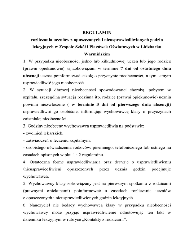 REGULAMIN rozliczania uczniów z opuszczonych i nieusprawiedliwionych godzin lekcyjnych w Zespole Szkół i Placówek Oświatowych w Lidzbarku Warmińskim 1. W przypadku nieobecności jedno lub kilkudniowej uczeń lub jego rodzice (prawni opiekunowie) są zobowiązani w terminie 7 dni od ostatniego dnia absencji ucznia poinformować szkołę o przyczynie nieobecności, a tym samym usprawiedliwić jego nieobecność. 2. W sytuacji dłuŜszej nieobecności spowodowanej chorobą, pobytem w szpitalu, szczególną sytuacją rodzinną itp. rodzice (prawni opiekunowie) ucznia powinni niezwłocznie ( w terminie 3 dni od pierwszego dnia absencji) usprawiedliwić go osobiście, informując wychowawcę klasy o przyczynach zaistniałej nieobecności. 3. Godziny nieobecne wychowawca usprawiedliwia na podstawie: - zwolnień lekarskich, - zaświadczeń o leczeniu szpitalnym, - osobistego oświadczenia rodziców: pisemnego, telefonicznego lub ustnego na zasadach opisanych w pkt. 1 i 2 regulaminu. 4. Ostateczna formę usprawiedliwiania oraz decyzję o usprawiedliwieniu /nieusprawiedliwieni opuszczonych przez ucznia godzin podejmuje wychowawca. 5. Wychowawcy klasy zobowiązany jest na pierwszym spotkaniu z rodzicami (prawnymi opiekunami) poinformować o zasadach rozliczania uczniów z opuszczonych i nieusprawiedliwionych godzin lekcyjnych. 6. Nauczyciel nie będący wychowawcą klasy w przypadku nieobecności wychowawcy moŜe przyjąć usprawiedliwienie odnotowując ten fakt w dzienniku lekcyjnym w rubryce „Kontakty z rodzicami”. 7. Do 14 dnia kaŜdego miesiąca wychowawcy klas zobowiązani są do obliczania i wpisania w dziennikach lekcyjnych frekwencji za miniony miesiąc. 8. Za godziny nieusprawiedliwione w danym semestrze wprowadza się następujące sankcje: - 0 – pochwała wychowawcy klasy za wzorowa frekwencję, - 11 do 20 godzin- ostrzeŜenie wychowawcy klasy, - 21 do 30 godzin- upomnienie wychowawcy klasy, - 31 do 40 godzin – upomnienie Dyrektora Szkoły, rozmowa Dyrektora z rodzicami (prawnymi opiekunami) lub pisemna informacja na temat frekwencji ucznia, - 41 do 50 godzin nagana Dyrektora Szkoły i pisemne powiadomienie rodziców o wszczęciu procedury skreślenia z listy ucznia. 9. Przestrzeganie/ nieprzestrzeganie przez uczniów ww. zasad naleŜy uwzględnić przy ustalaniu oceny z zachowania. 10. Oceny semestralne z zachowania ustala się w oparciu o następujące kryteria: - wzorowe- do 5 godzin nieusprawiedliwionych, - bardzo dobre- do 10 godzin nieusprawiedliwionych, - dobre – do 20 godzin nieusprawiedliwionych, - poprawne- do 30 godzin nieusprawiedliwionych, - nieodpowiednie- do 45 godzin nieusprawiedliwionych, - naganne- powyŜej 45 godzin nieusprawiedliwionych. 11. NiezaleŜnie od ww. punktów regulaminu, jeśli liczba opuszczonych i nieusprawiedliwionych godzin budzi niepokój wychowawcy, winien on niezwłocznie skontaktować się z rodzicami (prawnymi opiekunami) ucznia w celu ustalania przyczyny jego nieobecności. Podstawa prawna: - Rozporządzenie Ministra Edukacji Narodowej z dnia 30 IV 2007 r. (Dz.U. 2007/83/562, 130/906, 2008/3/9, 2006/164/1154) w sprawie warunków i sposobu oceniania, klasyfikowania i promowania uczniów i słuchaczy oraz przeprowadzania sprawdzianów i egzaminów w szkołach publicznych. - Ustawa z dnia 7 września 1991 r. o systemie oświaty (tj. Dz.U. z 1996r. Nr 67, poz. 329 z późn. zm.