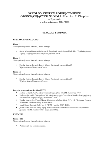 SZKOLNY ZESTAW PODRĘCZNIKÓW OBOWIĄZUJĄCYCH W OSM I i II st. im. F. Chopina w Bytomiu w roku szkolnym 2014/2015 SZKOŁA I STOPNIA KSZTAŁCENIE SŁUCHU Klasa I Nauczyciele: Joanna Kraciuk, Anna Miazga • Anna Miazga Pomoce dydaktyczne do kształcenia słuchu i rytmiki dla klas I Ogólnokształcącej Szkoły Muzycznej I i II st. w Bytomiu, Bytom 2010. Klasa II Nauczyciele: Joanna Kraciuk, Anna Miazga • Emilia Kotowska, red. Paweł Mazur Kształcenie słuchu. Klasa II Wydawnictwo Muzyczne Contra. Klasa III Nauczyciele: Joanna Kraciuk, Anna Miazga • Emilia Kotowska, red. Paweł Mazur Kształcenie słuchu. Klasa III Wydawnictwo Muzyczne Contra. Pozycje pomocnicze dla klas IV-VI • Metod Doleżil Nauka solfeżu i elementarnego rytmu. PWSM, Katowice 1947. • Tadeusz Jarzęcki Zbiór dyktand dla szkoły muzycznej. Centralny Ośrodek Pedagogiczny Szkolnictwa Artystycznego, Warszawa 1965. • Emilia Kotowska, Paweł Mazur Kształcenie słuchu w klasie IV – VI / I stopnia. Contra, Warszawa 2005 materiały pomocnicze. • Józef Karol Lasocki Solfeż cz. I. PWM, Kraków 1967-1968. • Józef Karol Lasocki Mały solfeż. Zbiór ćwiczeń i melodii ludowych do czytania nut głosem. PWM, Kraków 1951 (wyd. 23: 1996). RYTMIKA Klasa I-III Nauczyciele: Joanna Kraciuk, Anna Miazga • Podręcznik nie jest stosowany. SZKOŁA II STOPNIA Klasa IV/II Nauczyciele: Anna Siemińska, Tomasz Grzyb, Adam Wesołowski • • • Jadwiga Dzielska, Lucjan Kaszycki Podręcznik do kształcenia słuchu. PWM, Kraków 1976. Metod Doleżil Nauka solfeżu i elementarnego rytmu. PWSM Katowice 1947. Maria Wacholc Czytanie nut głosem cz. II. PWM, Kraków 1997. Klasa V/II Nauczyciele: Anna Siemińska, Tomasz Grzyb, Adam Wesołowski • • • • Jadwiga Dzielska, Lucjan Kaszycki Podręcznik do kształcenia słuchu. PWM, Kraków 1976. Metod Doleżil Nauka solfeżu i elementarnego rytmu. PWSM Katowice 1947. Maria Wacholc Czytanie nut głosem cz. II. PWM, Kraków 1997. Maria Dziewulska, Aleksander Frączkiewicz, Krystyna Palowska Materiały do kształcenia słuchu. PWM, Kraków 1964. Klasa VI/II: Nauczyciele: Anna Siemińska, Tomasz Grzyb, Adam Wesołowski • Jadwiga Dzielska, Lucjan Kaszycki Podręcznik do kształcenia słuchu. PWM, Kraków 1976. • Maria Dziewulska, Aleksander Frączkiewicz, Krystyna Palowska Materiały do kształcenia słuchu. PWM, Kraków 1964. • Maria Wacholc Czytanie nut głosem cz. II, III. PWM, Kraków 1997. Pozycje pomocnicze dla klas I – VI/II • Metod Doleżil Nauka solfeżu i elementarnego rytmu. PWSM Katowice 1947. • Hanna Danyszowa Zbiór ćwiczeń do kształcenia słuchu. PWM, Kraków 1978. • Danuta Dobrowolska-Marucha Dyktanda muzyczne. PWM, Kraków 1988/2003. • Jadwiga Dzielska Materiały pomocnicze do kształcenia słuchu. PWM, Kraków 1978. • Jadwiga Dzielska Kształcenie słuchu muzycznego. PWN, Warszawa 1988. • Feliks Flis Materiały do kształcenia słuchu i nauczania zasad muzyki. AM Warszawa 1987. • Andrzej Hundziak Materiały do kształcenia słuchu według P. Hindemitha. Materiały pomocnicze dla nauczycieli szkół i ognisk muzycznych, Warszawa1974. • Józef Karol Lasocki Solfeż cz. I-II. PWM, Kraków 1967-1968. • Zofia Peret-Ziemlańska Ćwiczenia do samodzielnego kształcenia słuchu. WSiP, Warszawa 1980. • Joanna Subel Materiały do kształcenia słuchu. AM Wrocław 1996. • Stanisław Wiechowicz Ćwiczenia w starych kluczach cz. II (Bach Chorały) PWM Kraków. • Stanisław Kazuro Solfeggio czyli nauka czytania nut głosem. Warszawskie Konserwatorium Muzyczne, Warszawa 1918. • Witold Kulikowski 100 kanonów. PWM, Kraków 1951. • Franciszek Wesołowski Materiały do nauki o skalach muzycznych. PWM, Kraków 1997. • Franciszek Wesołowski Materiały do ćwiczeń harmonicznych. PWM, Kraków 1967. • Hugo Riemann Zbiór dyktand muzycznych. • Izabela Targońska Ćwiczenia do kształcenia słuchu. Centrum Edukacji Artystycznej, Warszawa 2003. • Izabela Targońska Kształcenie pamięci muzycznej. CEA Warszawa. • Maria Ćwiklińska, Malgorzata Rogozińska Dyktanda elementarne dla uczniów klas I i VI szkół muzycznych I stopnia. Triangiel, Warszawa 2006. • Zbiór zadań z egzaminów wstepnych z kształcenia słuchu. Akademia Muzyczna im. Fryderyka Chopina, Warszawa 2004. • Ewa Stachurska Ćwiczenia do realizacji przebiegów rytmicznych. Akademia Muzyczna im. Fryderyka Chopina, Warszawa. • Ewa Wilczyńska Ćwiczenia do kształcenia słuchu. Wybór z utworów Karola Szymanowskiego, Akademia Muzyczna im. F. Chopina, Warszawa 2005. ZASADY MUZYKI Nauczyciel: Agnieszka Tyńska – Kowalska, Dariusz Nurzyński Klasa I-II Pozycja podstawowa • Franciszek Wesołowski Zasady muzyki. PWM, Kraków 1986. Pozycje uzupełniające • Zofia Lissa Zarys nauki o muzyce. Wyd. Ad Oculos 2007 (wyd. 6). • Józef Karol Lasocki Podstawowe wiadomości z nauki o muzyce. PWM, Kraków 2004. • Feliks Flis Materiały do kształcenia słuchu i nauczania zasad muzyki. AM Warszawa 1987. • Franciszek Wesołowski Materiały do nauki o skalach muzycznych. PWM, Kraków 1997. • Stanisław Wiechowicz Ćwiczenia w starych kluczach cz. II (Bach Chorały) PWM Kraków. • Jadwiga Dzielska, Lucjan Kaszycki Podręcznik do kształcenia słuchu. PWM, Kraków 1976. • Witold Rudziński Nauka o rytmie muzycznym. PWM, Kraków 1987. LITERATURA MUZYCZNA Nauczyciele: Wiesława Sczendzina, Dariusz Nurzyński Klasa I-II • Danuta Wójcik Nauka o muzyce. Musica Iagellonica, Kraków 2001. • Bohdan Muchenberg Pogadanki o muzyce część I i II. PWM Kraków 1980. • Danuta Wójcik ABC form muzycznych. Musica Iagellonica, Kraków 1999. • Bohdan Muchenberg Literatura muzyczne. PWM Kraków 1981. HARMONIA Klasa III-V Nauczyciele: Anna Siemińska, Tomasz Grzyb, Adam Wesołowski Pozycje podstawowe • • • • Franciszek Wesołowski Materiały do ćwiczeń harmonicznych. PWM, Kraków 1969. Franciszek Wesołowski Nauka harmonii. Wyd. Akademia Muzyczna w Łodzi, Łódź 2008. Ka