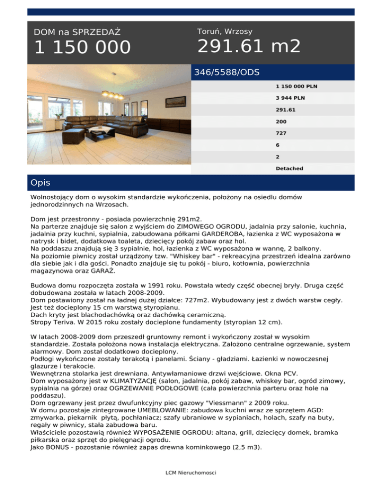 DOM na SPRZEDAŻ 1 150 000 Toruń, Wrzosy 291.61 m2 346/5588/ODS 1 150 000 PLN 3 944 PLN 291.61 200 727 6 2 Detached Opis Wolnostojący dom o wysokim standardzie wykończenia, położony na osiedlu domów jednorodzinnych na Wrzosach. Dom jest przestronny - posiada powierzchnię 291m2. Na parterze znajduje się salon z wyjściem do ZIMOWEGO OGRODU, jadalnia przy salonie, kuchnia, jadalnia przy kuchni, sypialnia, zabudowana półkami GARDEROBA, łazienka z WC wyposażona w natrysk i bidet, dodatkowa toaleta, dziecięcy pokój zabaw oraz hol. Na poddaszu znajdują się 3 sypialnie, hol, łazienka z WC wyposażona w wannę, 2 balkony. Na poziomie piwnicy został urządzony tzw. "Whiskey bar" - rekreacyjna przestrzeń idealna zarówno dla siebie jak i dla gości. Ponadto znajduje się tu pokój - biuro, kotłownia, powierzchnia magazynowa oraz GARAŻ. Budowa domu rozpoczęta została w 1991 roku. Powstała wtedy część obecnej bryły. Druga część dobudowana została w latach 2008-2009. Dom postawiony został na ładnej dużej działce: 727m2. Wybudowany jest z dwóch warstw cegły. Jest też docieplony 15 cm warstwą styropianu. Dach kryty jest blachodachówką oraz dachówką ceramiczną. Stropy Teriva. W 2015 roku zostały docieplone fundamenty (styropian 12 cm). W latach 2008-2009 dom przeszedł gruntowny remont i wykończony został w wysokim standardzie. Została położona nowa instalacja elektryczna. Założono centralne ogrzewanie, system alarmowy. Dom został dodatkowo docieplony. Podłogi wykończone zostały terakotą i panelami. Ściany - gładziami. Łazienki w nowoczesnej glazurze i terakocie. Wewnętrzna stolarka jest drewniana. Antywłamaniowe drzwi wejściowe. Okna PCV. Dom wyposażony jest w KLIMATYZACJĘ (salon, jadalnia, pokój zabaw, whiskey bar, ogród zimowy, sypialnia na górze) oraz OGRZEWANIE PODŁOGOWE (cała powierzchnia parteru oraz hole na poddaszu). Dom ogrzewany jest przez dwufunkcyjny piec gazowy "Viessmann" z 2009 roku. W domu pozostaje zintegrowane UMEBLOWANIE: zabudowa kuchni wraz ze sprzętem AGD: zmywarka, piekarnik płytą, pochłaniacz; szafy ubraniowe w sypianiach, holach, szafy na buty, regały w piwnicy, stała zabudowa baru. Właściciele pozostawią również WYPOSAŻENIE OGRODU: altana, grill, dziecięcy domek, bramka piłkarska oraz sprzęt do pielęgnacji ogrodu. Jako BONUS - pozostanie również zapas drewna kominkowego (2,5 m3). LCM Nieruchomosci Ponadto istnieje możliwość pozostawienia ruchomych mebli. W 2008 roku w ogrodzie położony został system nawadniania, zmodernizowany w 2015 roku. W 2015 roku powstało również kute ogrodzenie od frontu działki. Lokalizacja - Wrzosy. Jedna z najbardziej poszukiwanych. Jest to spokojne osiedle domów jednorodzinnych w pobliżu lasu i terenów rekreacyjnych Barbarka. Na osiedlu znajduje się szkoła, przedszkole, przychodnia, sklepy, markety, przystanki MZK. 5 kilometrów do centrum. GORĄCO POLECAM! WARTO! POŚREDNICTWO W OBROCIE NIERUCHOMOŚCIAMI JEST USŁUGĄ ODPŁATNĄ. Oświadczenie Biuro Pośrednictwa LCM Nieruchomości działa zgodnie z zasadami Standardów Zawodowych Pośredników w Obrocie Nieruchomościami, zamieszcza w ofertach informacje prawdziwe wg wszelkiej wiedzy i starania, nie łamie regulaminów serwisów nieruchomościowych, w tym nie publikuje celowo nieaktualnych i nieistniejących ofert, oraz stanowczo odcina się od praktyk nieetycznych i wprowadzających inne firmy oraz potencjalnych klientów w błąd. ZAPEWNIAMY BEZPŁATNE I PROFESJONALNE DORADZTWO W ZAKRESIE POZYSKIWANIA KREDYTÓW HIPOTECZNYCH NA ZAKUP NIERUCHOMOŚCI Powyższe informacje zostały sporządzone na podstawie oświadczeń i nie są ofertą w rozumieniu przepisów Kodeksu Cywilnego. Mają one jedynie charakter informacyjny. Joanna Bucewicz tel. 793941092 email: [email protected] LCM Nieruchomosci Powered by TCPDF (www.tcpdf.org)