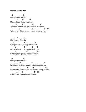 Maryjo śliczna Pani G h Maryjo śliczna Pani C D G Matko Boga i ludzi na ziemi C D G e Tyś świata Królową Tyś gwiazdą na niebie a C D D7 Tyś nas wiedziesz przez Jezusa wieczny tron G C G Maryja Ave Maryja G h E U Boga nam wybłagaj zdroje łask a D G E By świat lepszy był by w miłości żył a D7 G O Maryjo miej w opiece dzieci swe G h Maryjo śliczna Pani C D G Świat dziś czuje na swych ustach gorzkie łzy C D G e W sercu ból smutek żal a w oczach wciąż strach a C D D7 Usłysz Pani błaganie pomóż nam