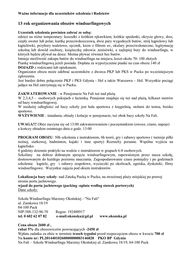 Ważne informacje dla uczestników szkolenia i Rodziców 13 rok organizowania obozów windsurfingowych Uczestnik szkolenia powinien zabrać ze sobą: odzież na różne temperatury: koszulki z krótkim rękawkiem, krótkie spodenki, okrycie głowy, dres, ciepły sweter lub polar, kurtkę przeciwdeszczową, dwie pary wygodnych butów, strój kąpielowy lub kąpielówki, przybory toaletowe, ręcznik, krem z filtrem uv, okulary przeciwsłoneczne, legitymację szkolną lub dowód osobisty, książeczkę zdrowia ,tenisówki, a najlepiej buty do windsurfingu, w których będzie pływał na desce. Można pływać również bez butów. Istnieje możliwość zakupu butów do windsurfingu na miejscu, koszt około 70- 100 złotych Piankę windsurfingową jeżeli posiada. Dopłata za wypożyczenie pianki na czas obozu 140 zł DOJAZD z rodzicami lub opiekunem. Organizator obozu może odebrać uczestników z dworca PKP lub PKS w Pucku po wcześniejszym zgłoszeniu. Jest bardzo dobre połączenie PKP i PKS Gdynia - Hel a także Warszawa – Hel. Wszystkie pociągi jadące na Hel zatrzymują się w Pucku. ZAKWATEROWANIE : w Pensjonacie Na Fali tuż nad plażą. W 2,3,4,5 - osobowych pokojach z łazienką. Pensjonat znajduje się tuż nad plażą, kilkaset metrów od bazy windsurfingowej. W niedużej odległości od bazy szkoły jest hala sportowa z kręgielnią, stołami do tenisa, boisko sportowe. WYŻYWIENIE : śniadania, obiady i kolacje w pensjonacie, tuż obok bazy szkoły Na Fali. UWAGA!!! Obóz zaczyna się od 13:00 zakwaterowaniem i poczęstunkiem (owoce, ciasto, napoje) a kończy obiadem ostatniego dnia o godz. 13:00 PROGRAM OBOZU: 50h szkolenia z instruktorem, 6h teorii, gry i zabawy sportowe ( turnieje piłki nożnej, siatkowej, badminton, kajaki i inne sporty) Rozruchy poranne. Wspólne wyjścia na kąpielisko. 4 godziny dziennie praktyki na wodzie z instruktorem w grupach 6-8 osobowych. Szkolimy na dobrze dobranym sprzęcie windsurfingowym, zapewnionym przez nasza szkołę, dostosowanym do każdego poziomu nauczania. Zagospodarowanie czasu pomiędzy i po godzinach szkolenia: kąpiele, gry i zabawy zespołowe, wycieczki po okolicach, ogniska, dyskoteki, filmy windsurfingowe. Wszystkie zajęcia pod okiem instruktorów. Lokalizacja bazy szkoły: nad Zatoką Pucką w Pucku, na strzeżonej plaży miejskiej po prawej stronie portu jachtowego. wjazd do portu jachtowego (parking -opłata według stawek portowych) Dane szkoły: Szkoła Windsurfingu Marzeny Okońskiej - "Na Fali" ul. Zamkowa 18/19 84-100 Puck NIP:588-132-96-70 Regon: 192488917 tel. 0 602 62 07 82 e-mail:[email protected] www.okonska.pl Cena obozu 2600 zł , rabat 5% dla obozowiczów powracających -2450 zł Wpłata zadatku za obóz w terminie trzech tygodni przed rozpoczęciem obozu w kwocie 700 zł Na konto nr: PL20144010260000000003146828 PKO BP Gdynia Na Fali – Szkoła Windsurfingu Marzeny Okońskiej ul. Zamkowa 18/19, 84-100 Puck