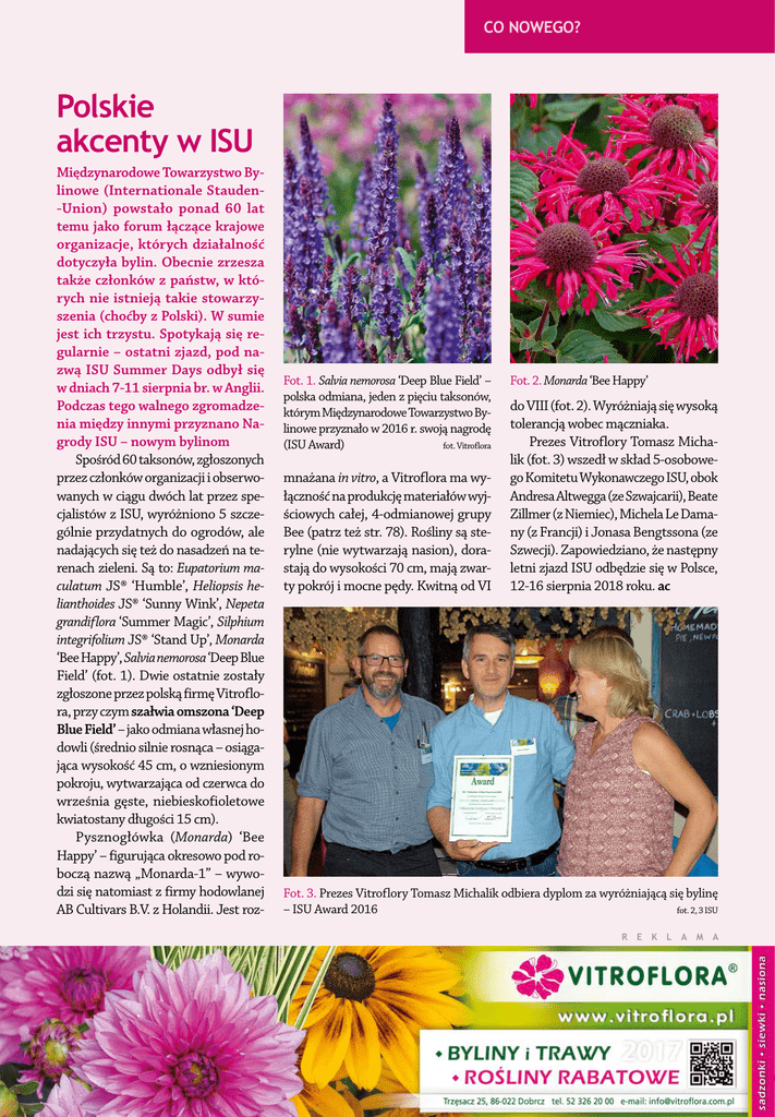 CO NOWEGO? Polskie akcenty w ISU Międzynarodowe Towarzystwo Bylinowe (Internationale Stauden-Union) powstało ponad 60 lat temu jako forum łączące krajowe organizacje, których działalność dotyczyła bylin. Obecnie zrzesza także członków z państw, w których nie istnieją takie stowarzyszenia (choćby z Polski). W sumie jest ich trzystu. Spotykają się regularnie – ostatni zjazd, pod nazwą ISU Summer Days odbył się w dniach 7-11 sierpnia br. w Anglii. Podczas tego walnego zgromadzenia między innymi przyznano Nagrody ISU – nowym bylinom Spośród 60 taksonów, zgłoszonych przez członków organizacji i obserwowanych w ciągu dwóch lat przez specjalistów z ISU, wyróżniono 5 szczególnie przydatnych do ogrodów, ale nadających się też do nasadzeń na terenach zieleni. Są to: Eupatorium maculatum JS® ‘Humble’, Heliopsis helianthoides JS® ‘Sunny Wink’, Nepeta grandiflora ‘Summer Magic’, Silphium integrifolium JS® ‘Stand Up’, Monarda ‘Bee Happy’, Salvia nemorosa ‘Deep Blue Field’ (fot. 1). Dwie ostatnie zostały zgłoszone przez polską firmę Vitroflora, przy czym szałwia omszona ‘Deep Blue Field’ – jako odmiana własnej hodowli (średnio silnie rosnąca – osiągająca wysokość 45 cm, o wzniesionym pokroju, wytwarzająca od czerwca do września gęste, niebieskofioletowe kwiatostany długości 15 cm). Pysznogłówka (Monarda) ‘Bee Happy’ – figurująca okresowo pod roboczą nazwą „Monarda-1” – wywodzi się natomiast z firmy hodowlanej AB Cultivars B.V. z Holandii. Jest roz- Fot. 1. Salvia nemorosa ‘Deep Blue Field’ – polska odmiana, jeden z pięciu taksonów, którym Międzynarodowe Towarzystwo Bylinowe przyznało w 2016 r. swoją nagrodę (ISU Award) fot. Vitroflora mnażana in vitro, a Vitroflora ma wyłączność na produkcję materiałów wyjściowych całej, 4-odmianowej grupy Bee (patrz też str. 78). Rośliny są sterylne (nie wytwarzają nasion), dorastają do wysokości 70 cm, mają zwarty pokrój i mocne pędy. Kwitną od VI Fot. 2. Monarda ‘Bee Happy’ do VIII (fot. 2). Wyróżniają się wysoką tolerancją wobec mączniaka. Prezes Vitroflory Tomasz Michalik (fot. 3) wszedł w skład 5-osobowego Komitetu Wykonawczego ISU, obok Andresa Altwegga (ze Szwajcarii), Beate Zillmer (z Niemiec), Michela Le Damany (z Francji) i Jonasa Bengtssona (ze Szwecji). Zapowiedziano, że następny letni zjazd ISU odbędzie się w Polsce, 12-16 sierpnia 2018 roku. ac Fot. 3. Prezes Vitroflory Tomasz Michalik odbiera dyplom za wyróżniającą się bylinę – ISU Award 2016 fot. 2, 3 ISU R Pod Osłonami • 5/2016 E K L A M 87 A