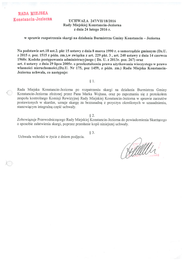 RADA MIIMSKA Kon3tancinJeZiOtflI UCHWAŁA 247/VII/18/2016 Rady Miejskiej Konstancin-Jeziorna z dnia 24 lutego 2016 r. lv sprawie rozpatrzenia skargi na działania Burmistrza Gminy Konstancin — Jeziorna Na podstawie art.18 ust.2. pkt 15 ustawy z dnia 8 marca 1990 r. o samorządzie gminnym (Dz.U. z 2015 r. poz. 1515 z późn. zm.),w związku z art. 229 pkt. 3 „ art. 240 ustawy z dnia 14 czerwca 1960r. Kodeks postępowania administracyjnego (Dz. U. z 2013r. poz. 267) oraz art. 4 ustawy z dnia 29 lipca 2005r. o przekształceniu prawa użytkowania wieczystego w prawo własności nieruchoniości,(Dz.U. Nr 175, poz 1459, z późn. zm.) Rada Miejska Konstancin Jeziorna uchwała, co następuje: 1. Rada Miejska Konstancin-Jeziorna po rozpatrzeniu skargi na działania Burmistrza Gminy Konstancin-Jeziorna złożonej przez Pana Marka Wojtasa. oraz po zapoznaniu się z protokołem zespołu kontrolnego Komisji Rewizyjnej Rady Miejskiej Konstancin-Jeziorna w sprawie zarzutów postawionych w skardze. uznaje skargę za bezzasadną z przyczyn określonych w uzasadnieniu, stanowiącym integralną część uchwały. 2. Zobowiązuje Przewodniczącego Rady Miejskiej Konstanciii-Jeziorna do powiadomienia Skarżącego o sposobie załatwienia skargi. poprzez przesłanie kopii niniejszej uchwały. Uchwała wchodzi w życie z dniem podjęcia. J Uzasadnienie do uchwaly Nr 247/VII/18/2016 Rady Miejskiej Konstancin Jeziorna z dnia 24.02. 2016r. w sprawie rozpatrzenia skargi na Burmistrza Gminy Konstancin Jeziorna w przedmiocie odstąpienia od obowiązku zawieszenia czynności slużbowych w sprawie, oraz naliczania odsetek za zwlokę do czasu zakończenia postępowania administracyjnego w trybie skargowym. — — Zespól kontro tny Komisji Rewizyjnej Rady Miejskiej Konstancin Jeziorna dokonał badania skargi p. Marka Wojtasa na działanie Burmistrza, przekazanej przez Samorządowe Kolegium Odwoławcze w Warszawie, do Rady Miejskiej Konstancin-Jeziorna, jako Organu właściwego do jej rozpatrzenia zgodnie z art.231 w zw. z art. 229 pkt 3, pismem z dnia 25.11.2015 r. (data wpływu do Biura Rady Miejskiej 30.11.2015 r. BRM 439/2015, nr UMiG PP/1022876). — Kontrolę przeprowadził zespół kontrolny Komisji Rewizyjnej Rady Miejskiej Konstancin w następującym składzie: - — Jeziorna I. Mariusz Kucicki 2. Arkadiusz Zewar Przedmiotem kontroli, było przeprowadzenie postępowania wyjaśniającego w sprawie bezprawnego działania funkcjonariusza publicznego w osobie Kazimierza Jańczuka-Burmistrza Gminy Konstancin-Jeziorna w przedmiocie odstąpienia od obowiązku zawieszenia czynności służbowych w sprawie, oraz naliczania odsetek za zwłokę do czasu zakończenia postępowania administracyjnego w trybie skargowym. (Nr. IJMiG PP ”1018673). 1 CJ Zespół w toku czynności wyjaśniających zapoznał się z dokumentacją sprawy, wysłuchał wyjaśnień Kierownika Wydziału Go spodarki Nieruchomościami Pana Piotra Bartoszewskiego, oraz pracownika tego wydziału Pani Inspektor Ewy Wasilewskiej, a także skonsultował z radcą prawnym p. Iwoną Czoharą. wykładnię przepisów mających zastosowanie w ww. sprawie tj. ustawy z dnia 29 lipca 2005r. o przekształceniu prawa użytkowania wieczystego wprawo własności nieruchomości, ustawy z dnia 21 sierpnia 1997r. o gospodarce nieruchomościami, oraz ustawy z dnia 14 czerwca 1 960r. Kodeks Po stępowania Administracyjnego. Z wyjaśnień Kierownika Wydziału Gospodarki Nieruchomościami, wynika, że na wniosek Pani Ewy Wojtas córki Jana i Haliny, oraz Pana Marka Wojtasa syna Henryka i Ireny w dniu 27.07.2011 została wydana przez Burmistrza Gminy Konstancin-Jeziorna decyzja nr 107/2011 o przekształceniu prawa użytkowania wieczystego nieruchomości nr 157 wobrębie 03-15, wprawo własności nieruchomości. Z jej analizy wynika. że zawarto w niej, zapis ustalający opłatę za przekształcenie prawa użytkowania wieczystego w prawo własności nieruchomości (z zastosowaniem 90% bonitkaty od opłaty zgodnie z art 4 ust.8 ustawy z dnia 29 lipca 2005 r roku o przekształceniu prawa użytkowania wieczystego w prawo własności nieruchomości) w wysokości 6.383,80 zł Należna opłata na wniosek użytkowników wieczystych została rozłożona na 20 rat płatnych przez 20 lat. z określeniem terminów płatności. Zgodnie z postanowieniami decyzji użytkownicy wieczyści każdorazowo przed terminem płatności raty, informowani byli w jakiej wysokości winni uiścić daną ratę, z podaniem terminu płatności. Decyzja zawierała także zapisy mówiące o tym, że nieuiszczona część opłaty. rozłożonej na raty zgodnie z art. 4 ust. 4 ww. podlega oprocentowaniu przy zastosowaniu stopy procentowej równej stopie redyskonta weksli stosowanej przez Narodowy Bank Polski, oraz zapis informujący, iż od niewpłaconych w terminie rat pobierane będą odsetki ustawowe. Z analizy kopii dokumentów dołączonych przez Skarżącego do badanej skargi. wynika ponadto, że pismem z dnia 22.01.2015 r. nr GN.6826.23.2015 r. wysłana została przez Gminę, informacja o wysokości raty za rok 2015 i terminie płatności. W odpowiedzi Skarżący pismem z dnia 27.02.20 15 . wystąpił do Gminy o rozłożenie na cztery raty, płatne miesięcznie, opłaty z tytułu piątej raty w kwocie 452,36 zł. Jako załączniki do pisma, zostały dołączone m.in. bilanse firmy z dnia 06.02.2015, 14.01.2015, 18.11.2014, 23.11.2014, oraz kserokopie odpisów aktów zgonu p. Ewy Wojtas z dnia 25.03.2014, oraz p. Jarosława Wojtas z 23.09.20 14 r. Pismem z dnia 02.03.2015 r nr GN.6843.35.2015 r. Urząd z uwagi na posiadane informacje, że Skarżący jest przedsiębiorcą, wystąpił o przedstawienie do Gminy niezbędnych informacji określonych w Rozporządzeniu Rady Ministrów z dnia 29 marca 2010 r. w sprawie zakresu informacji przedstawianych przez podmiot ubiegający się o pomoc dc niinimis.( m.in. sprawozdań finansowych za okres trzech ostatnich lat obrotowych, sporządzonych zgodnie z przepisami o